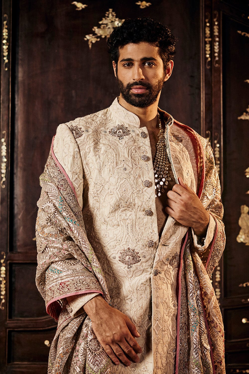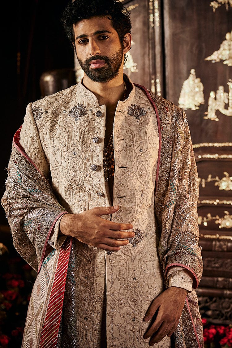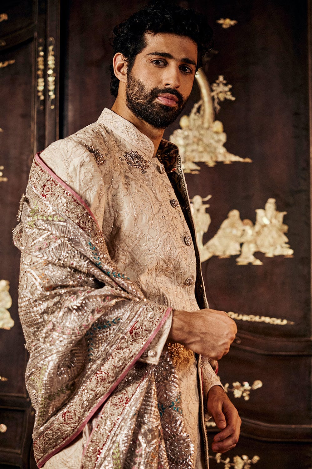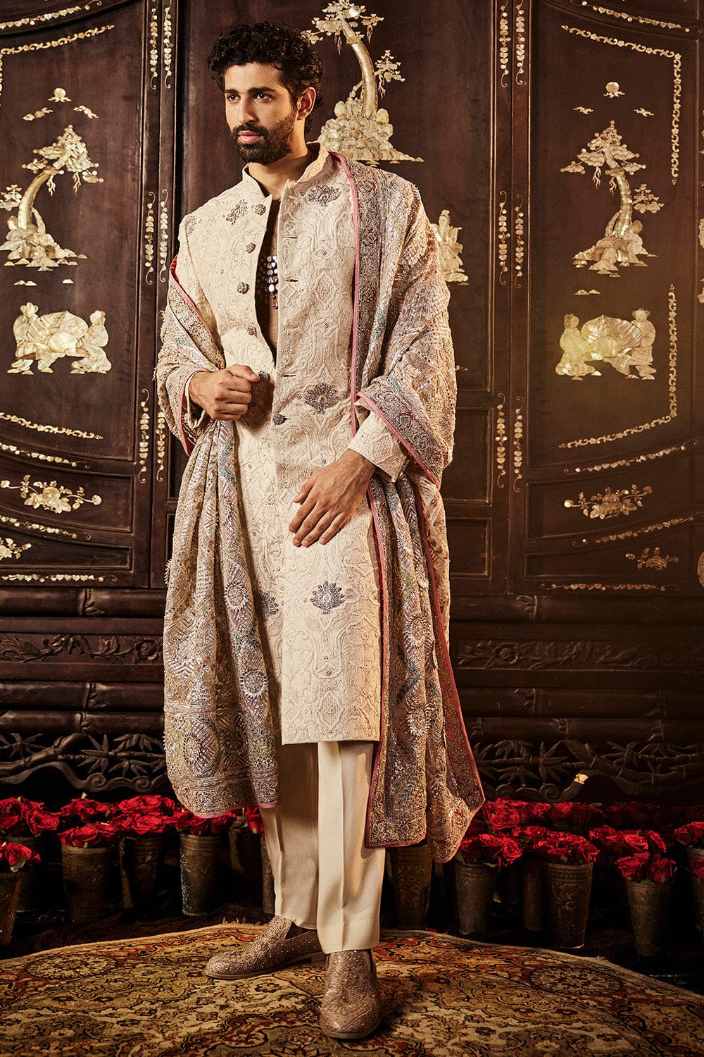a tonal ivory sherwani. The jacket features a tessellated dabbi jaal derived from Mughal architectural references which is interspersed with resplendent peacock motifs. The embroideries are rendered with resham zardozi, marodi ka kaam, dabka, naqshi, sequins, and pearls. It is layered with a sucha gota dushala and the look is completed with a pair of slim pants and handcrafted shoes.