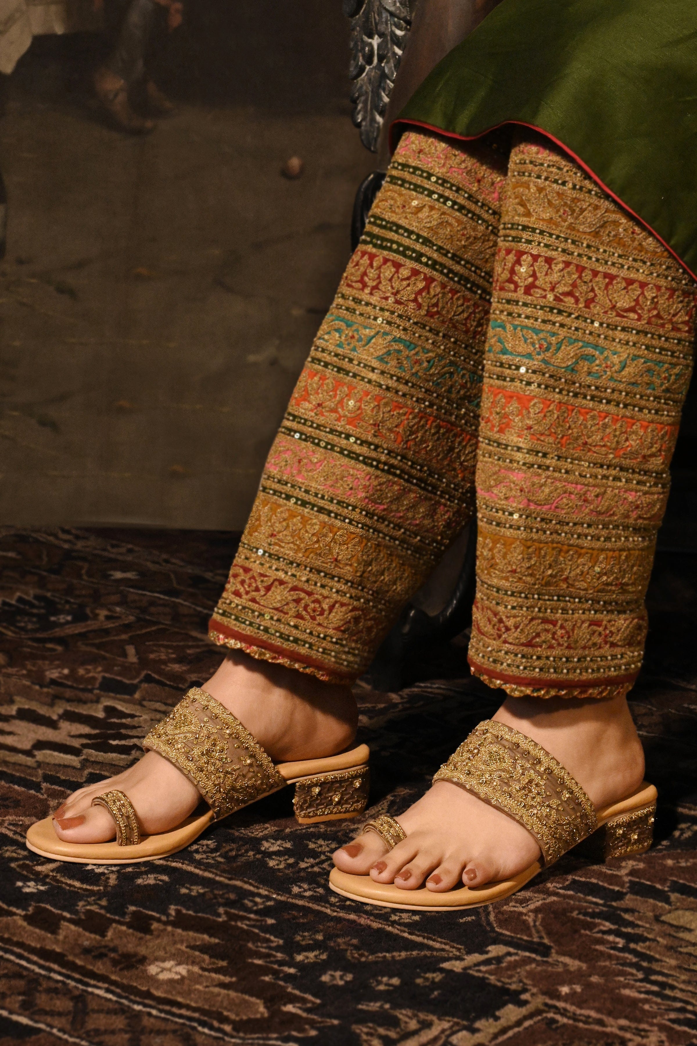 A refined reinterpretation of Indian slip-on heels, elevated through delicate gold embroidery on a warm brown base. Designed for ease, balance, and understated ceremonial elegance.