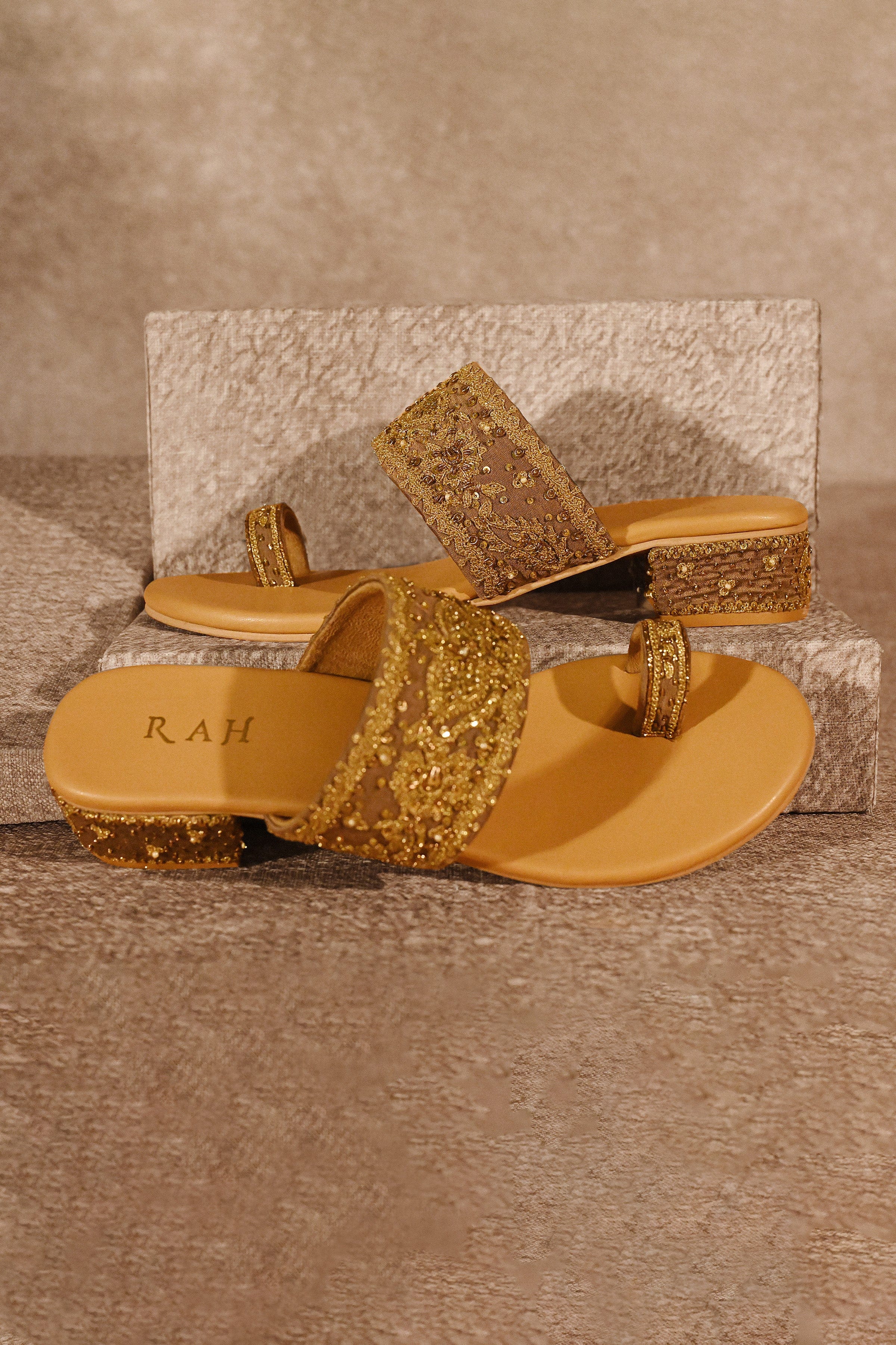 Aarzoo-e-Zar, meaning “a longing for gold,” follows the same design philosophy as Kashiya Heels—comfort-led form refined through surface craft. Inspired by traditional Indian slip-on footwear, the silhouette remains relaxed and open, allowing the embroidery to sit close to the foot and feel integrated rather than ornamental.