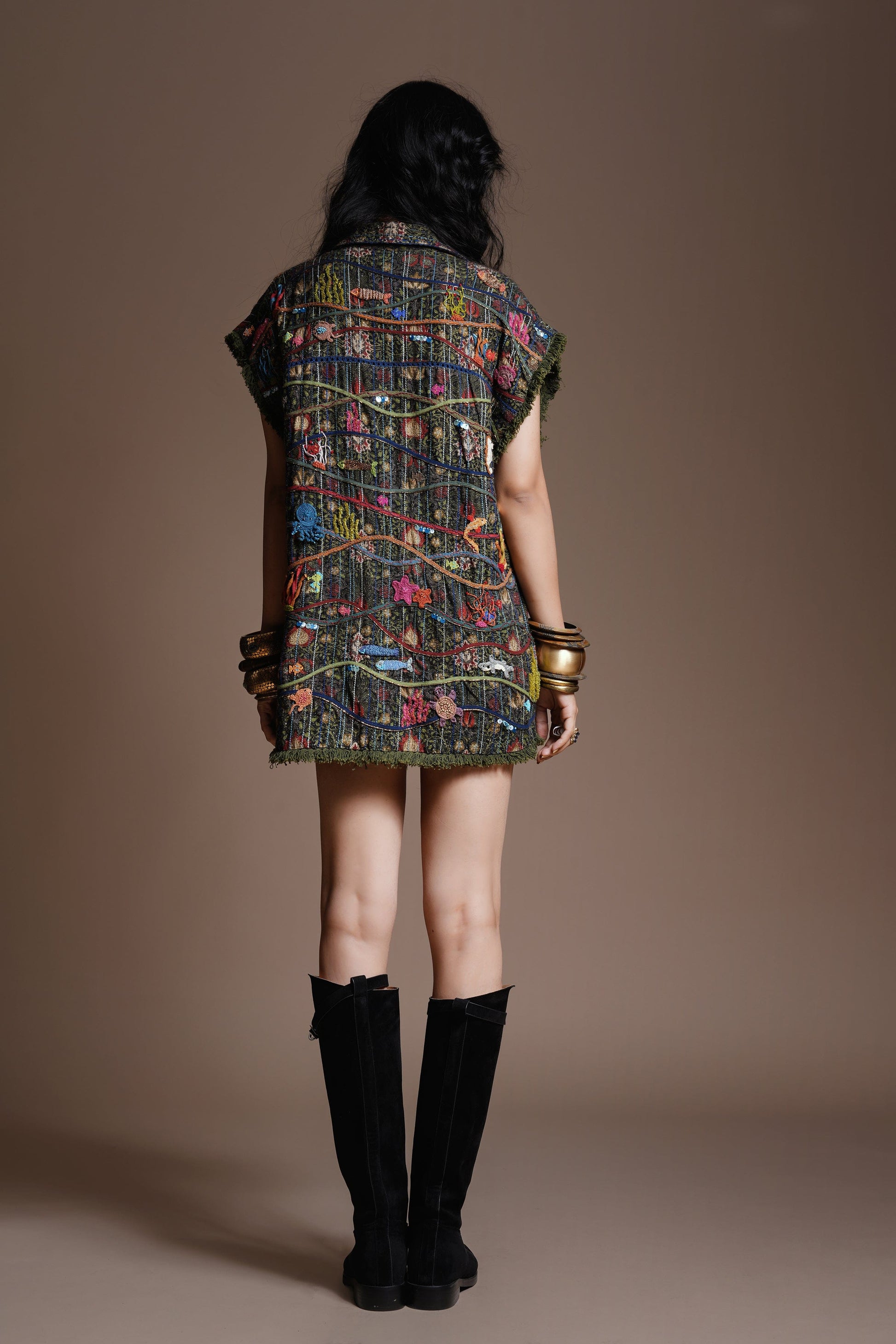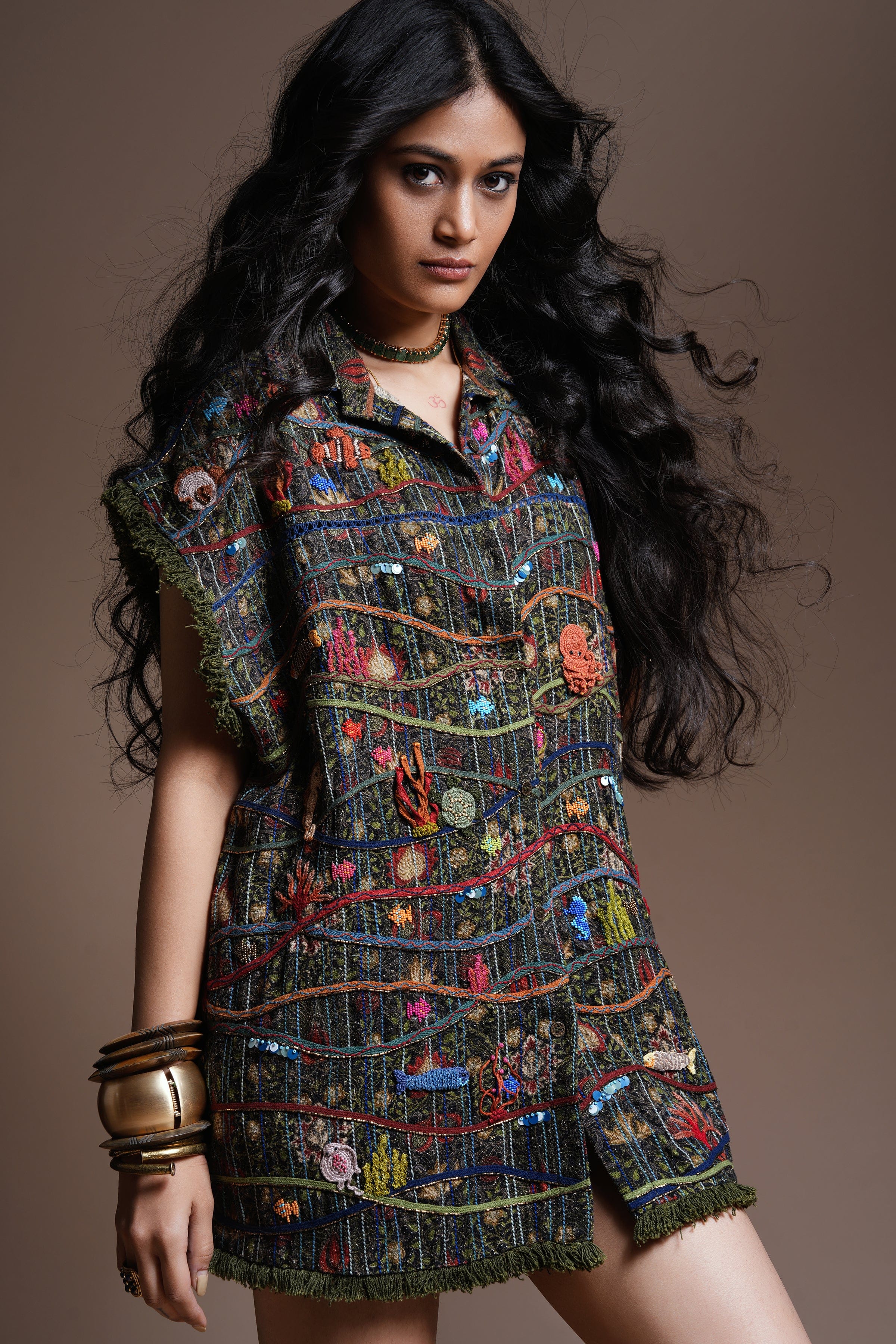 Inspired by the hidden poetry of marine life, this shirt translates the ocean’s quiet stories into texture and form. Layered embroidery moves like underwater currents, while intricate motifs echo corals, sea flora, and drifting organisms found beneath the surface. Rich, earthy tones meet vibrant accents, reflecting the harmony between depth and vitality that defines the ocean world. Thoughtfully handcrafted, the piece feels alive—fluid yet grounded—celebrating exploration, resilience, and the beauty that exists in nature’s most unseen realms.