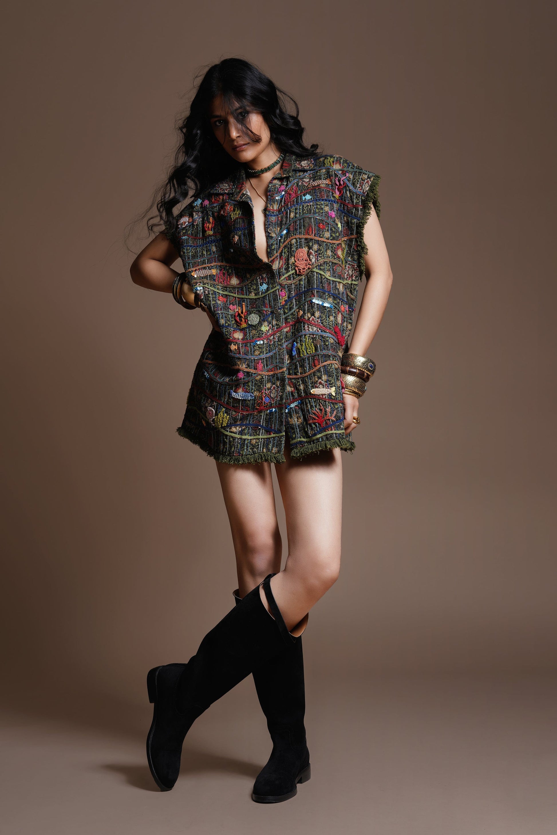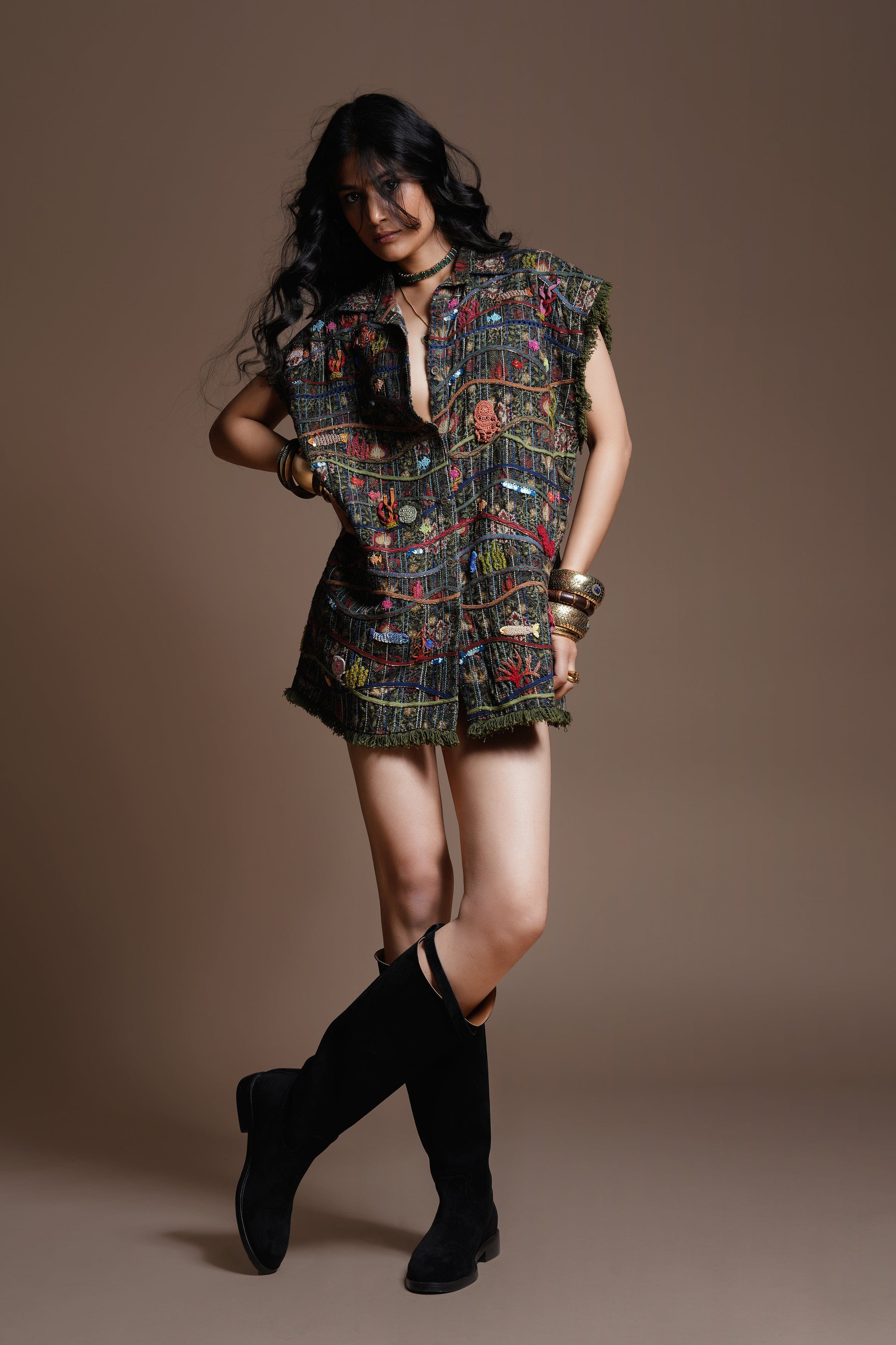 An marine life-inspired textured shirt adorned with intricate beadwork embroidery, featuring handcrafted crochet sea creatures.