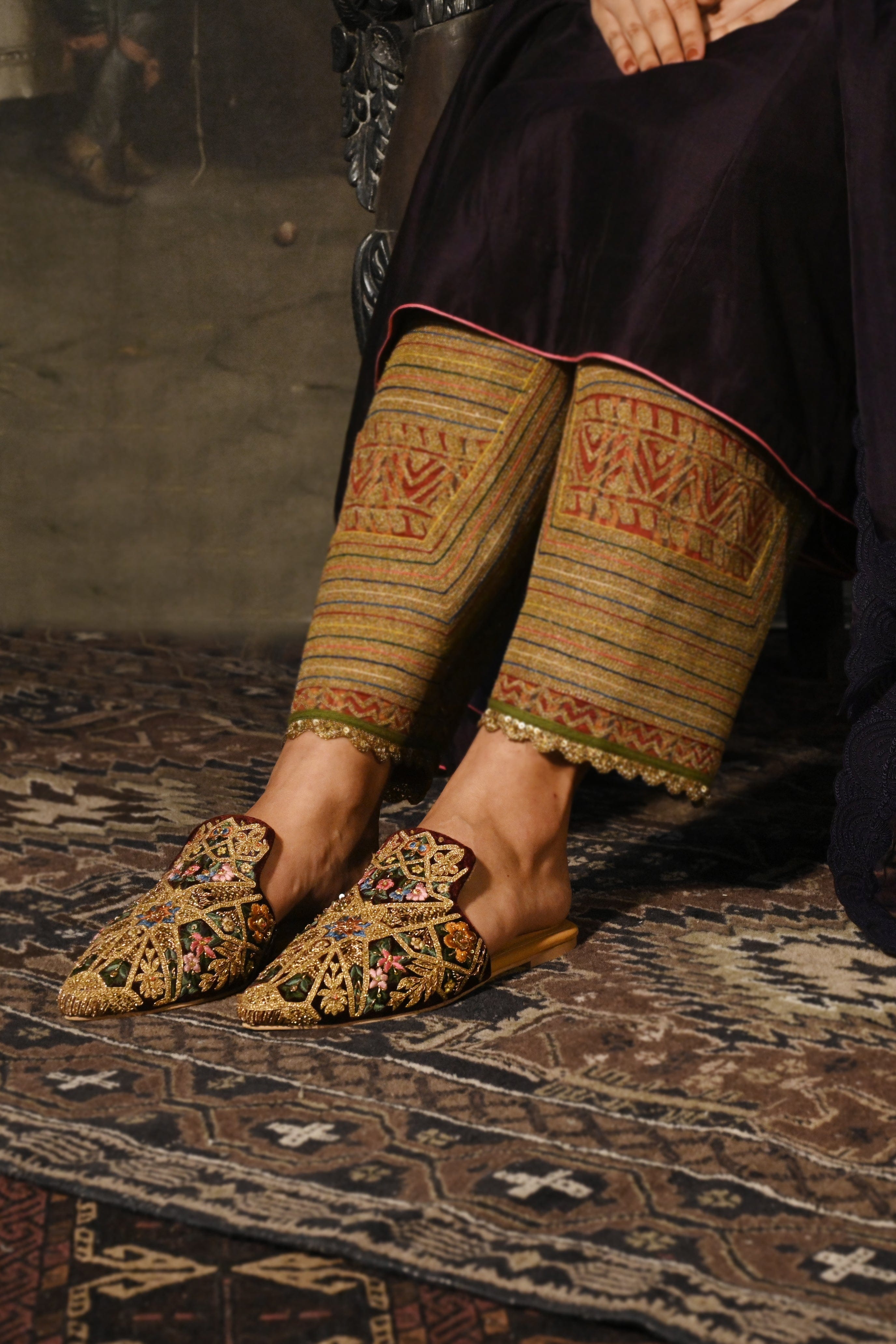 Set on a deep maroon ground, the embroidery reads as layered and dimensional, allowing the gold to sit forward while the base absorbs and anchors the design. The open-back mule construction keeps the form contemporary and easy, balanced by a suede inner lining that adds comfort and tactility. Designed to be worn intuitively, Basanti Zarr moves away from convention while remaining rooted in craft. -