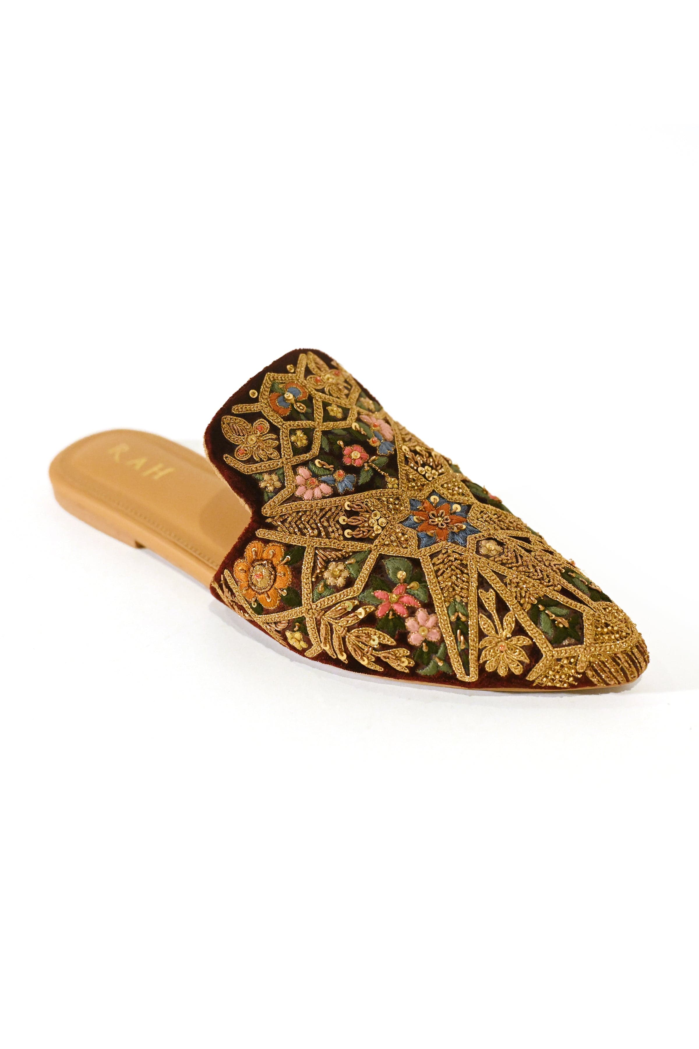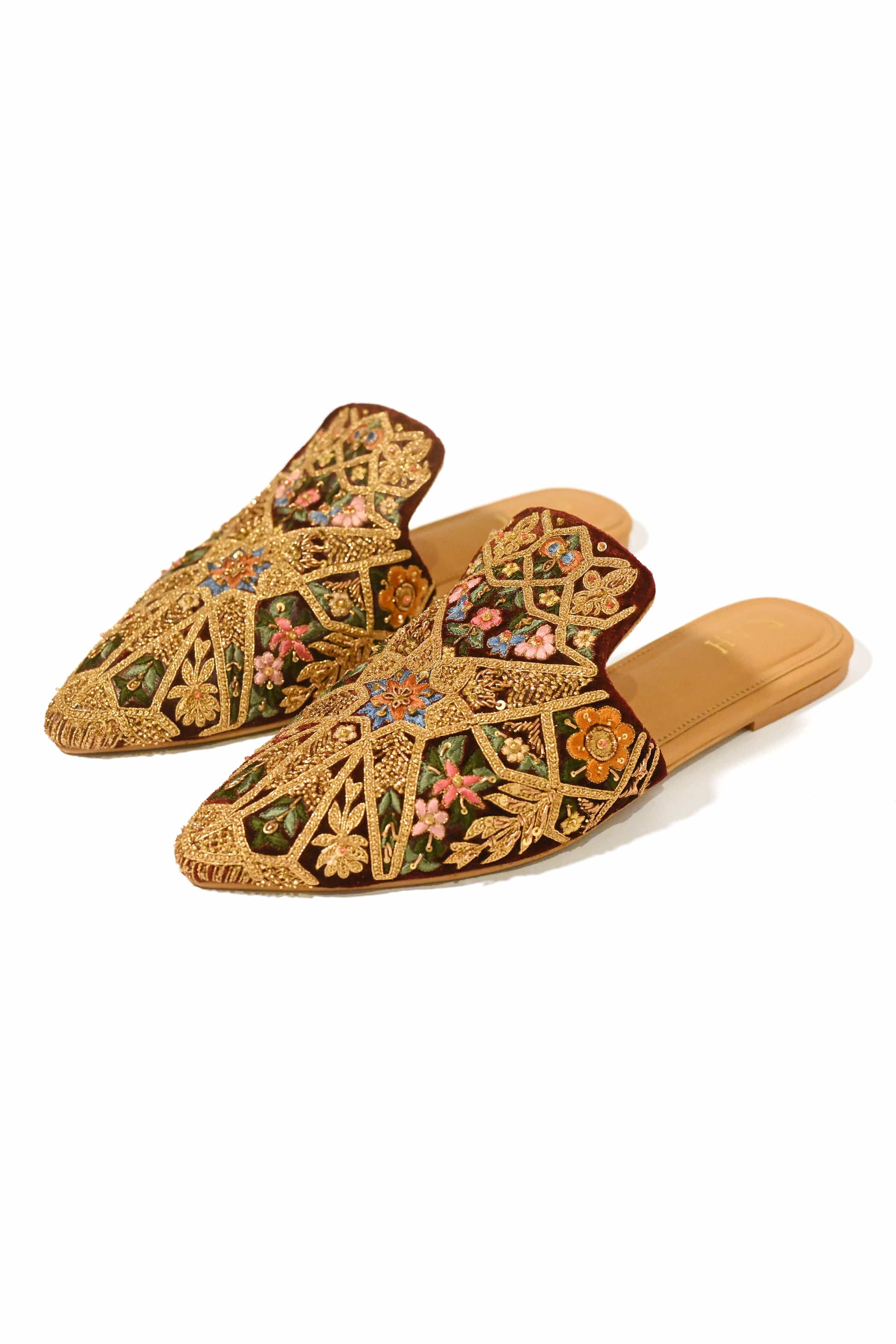 A slip-on mule defined by architectural embroidery, where antique gold metallic threads meets a deep maroon ground in a form designed for ease, comfort, and presence.