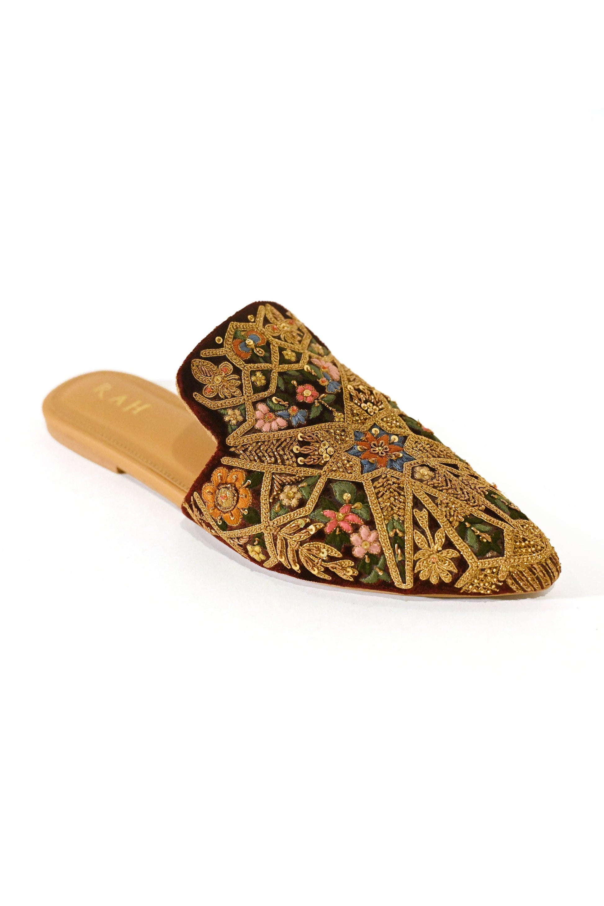 Set on a deep maroon ground, the embroidery reads as layered and dimensional, allowing the gold to sit forward while the base absorbs and anchors the design. The open-back mule construction keeps the form contemporary and easy, balanced by a suede inner lining that adds comfort and tactility. Designed to be worn intuitively, Basanti Zarr moves away from convention while remaining rooted in craft.