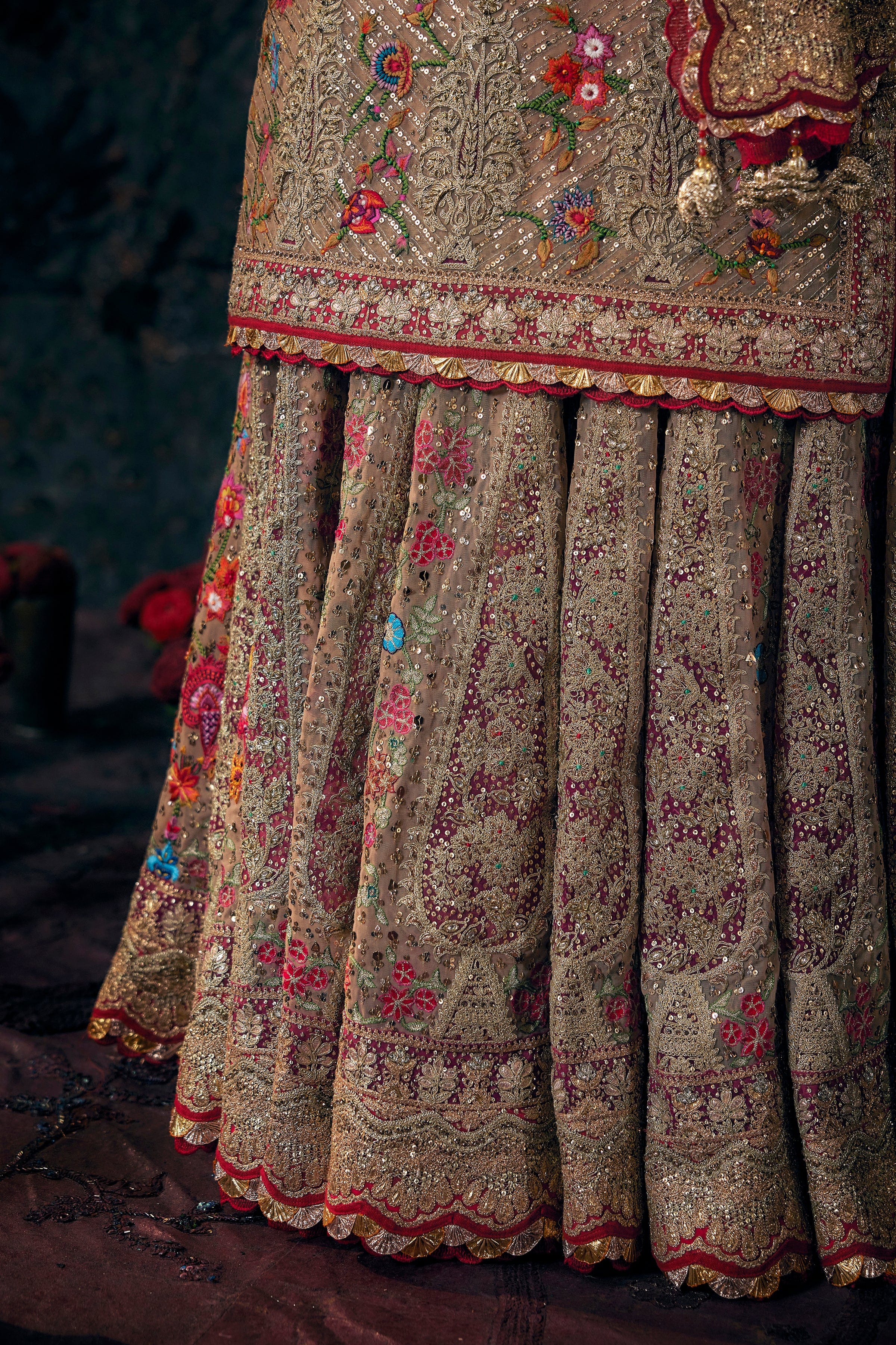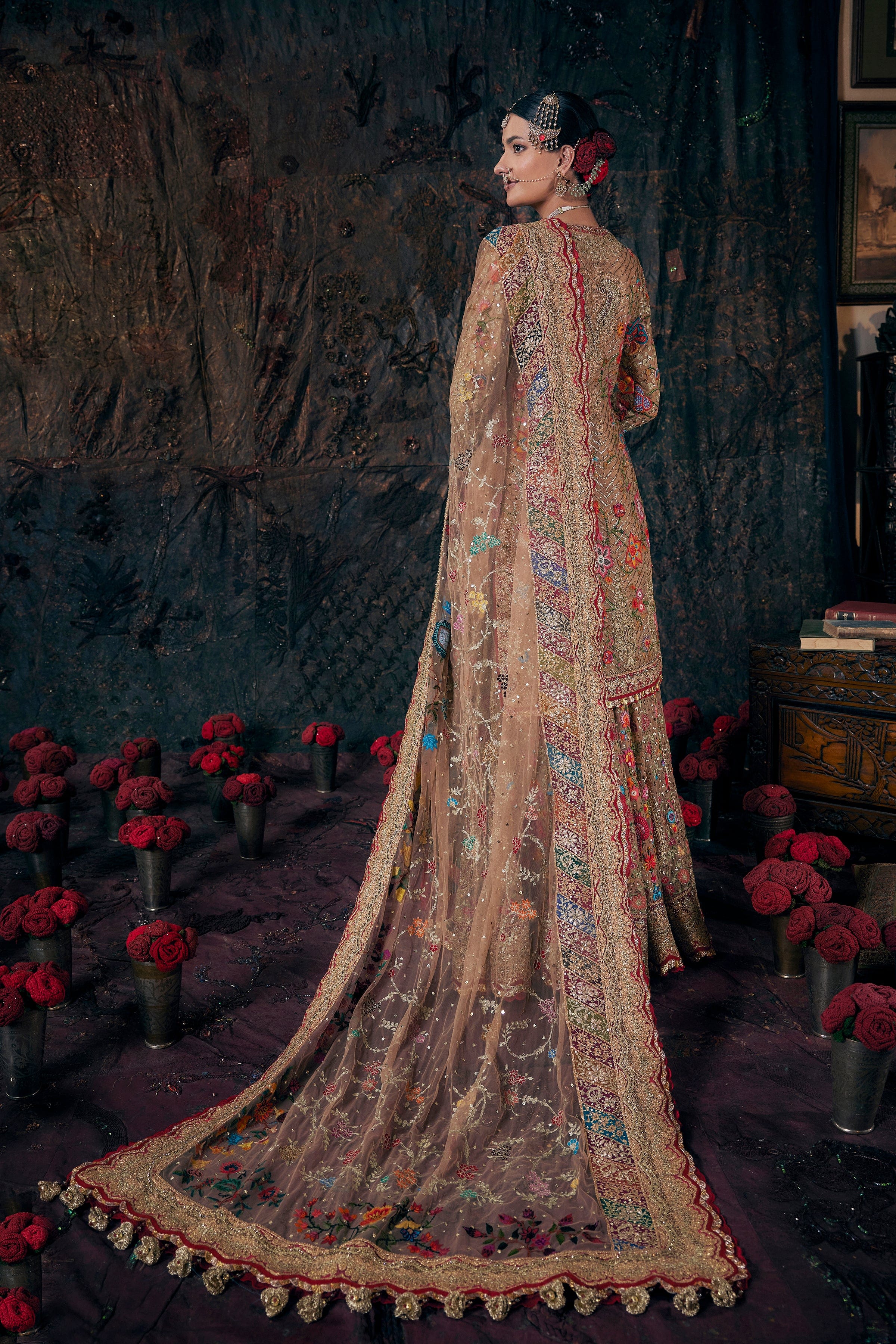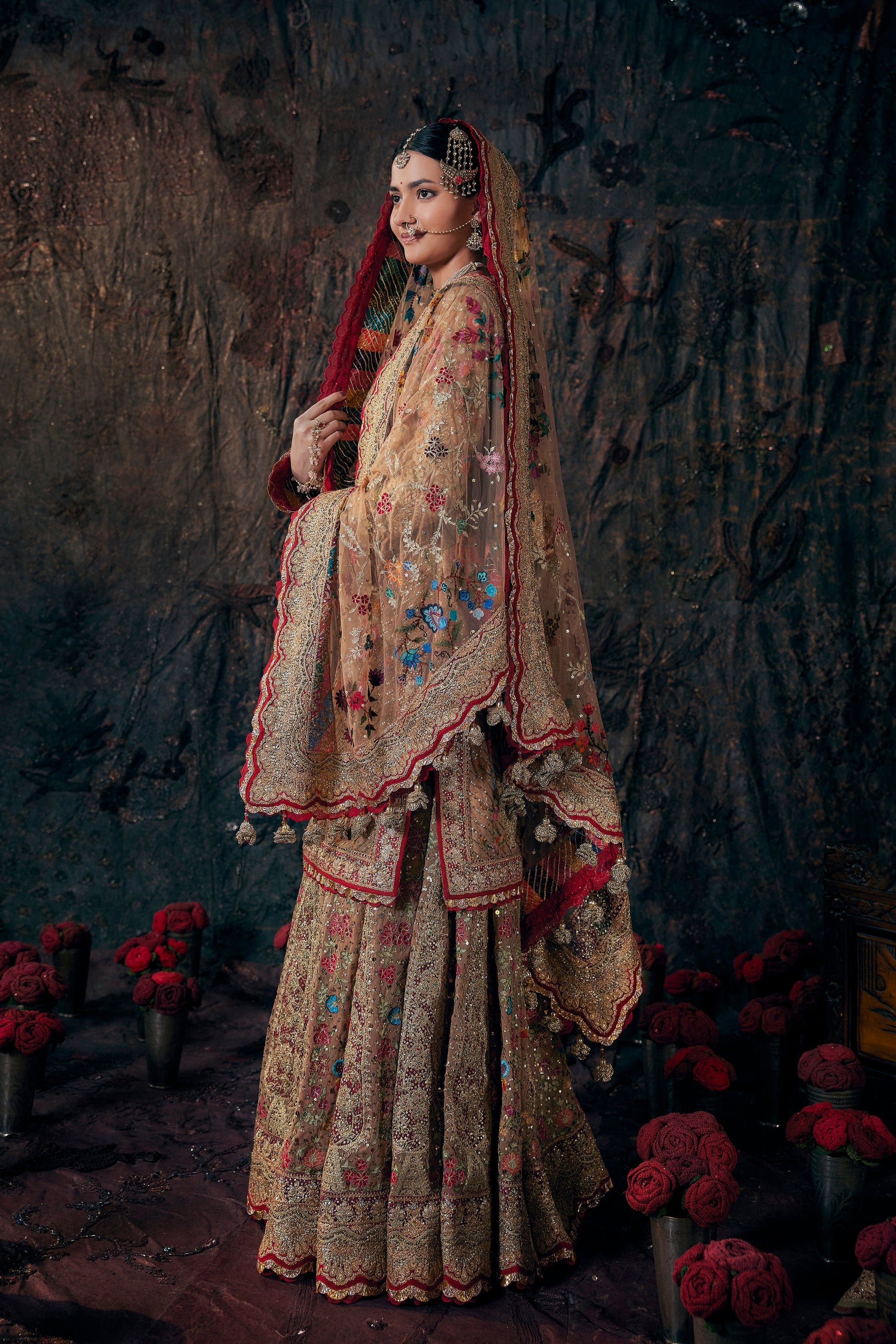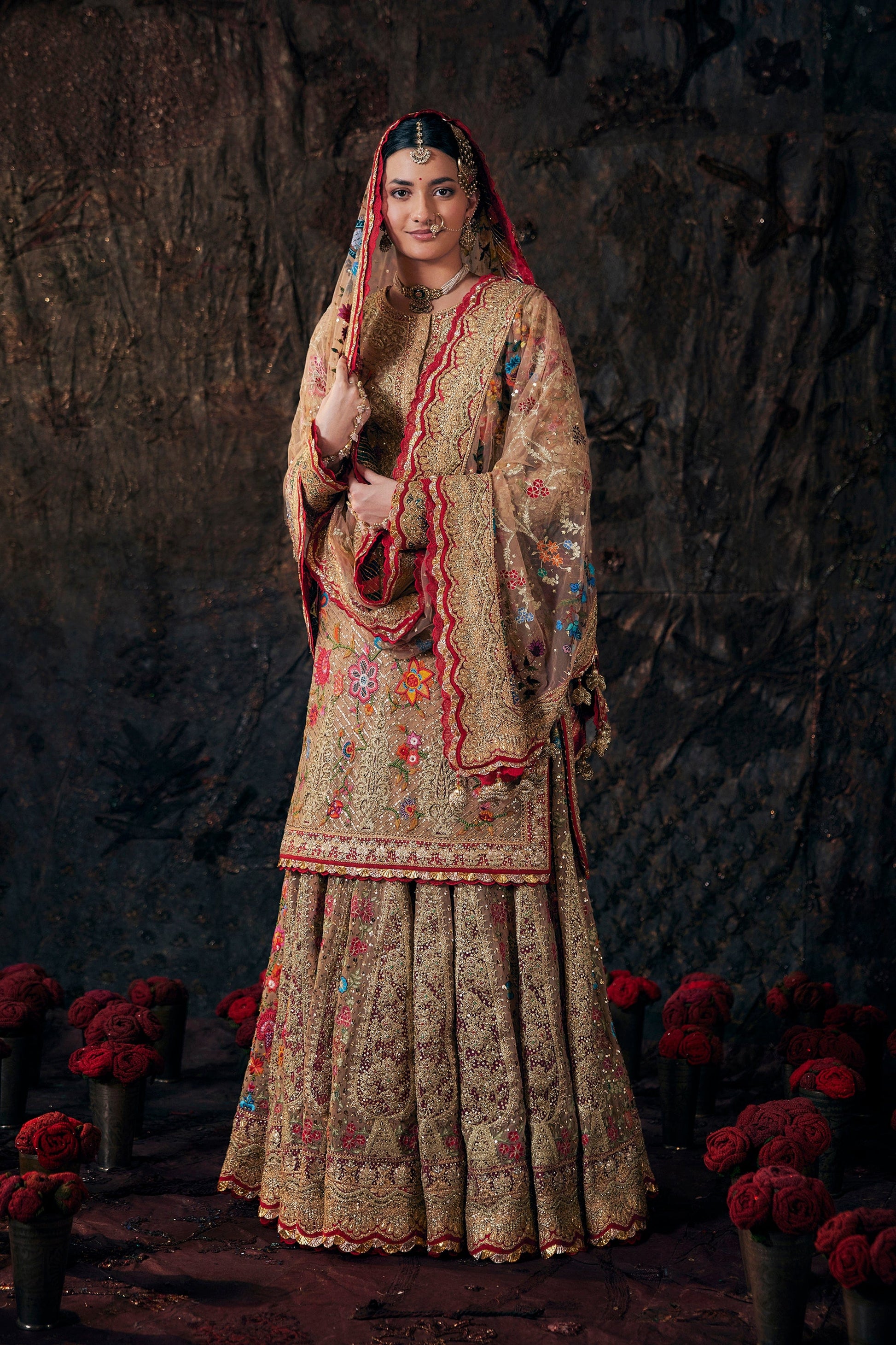A beige gold tulle kurti and a sharara with floral motifs that are derived from 17th century Jacobean textile fragments. The embroideries are rendered with kasab-dori marodi ka kaam, aari ka kaam, resham zardozi, sequins and pearls. The look is completed with a sheer tulle dupatta.