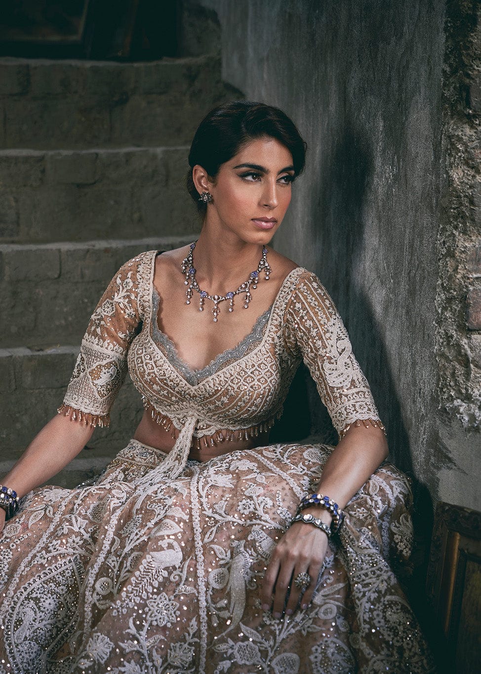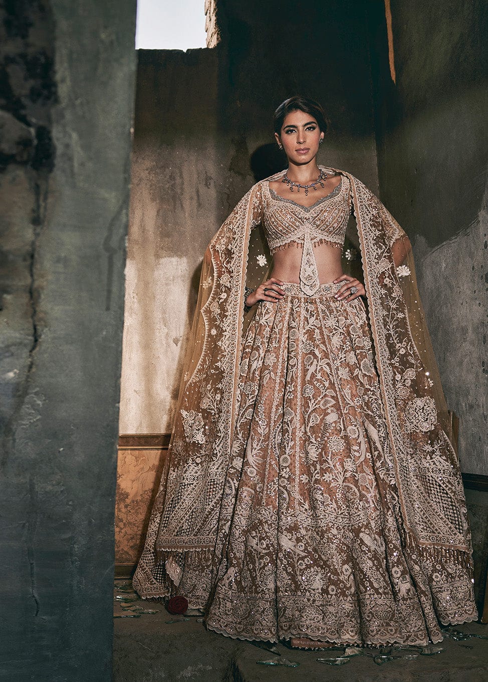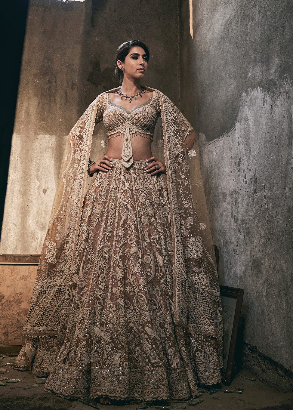 A delicate tulle lehenga in hues of ivory and nude beige. The skirt features floral, avian and geometric artworks gleaned from archival filigree curios, ornaments and jewellery while the embroideries are rendered using marodi ka kaam, resham zardozi, jaali ka kaam, sequins, pearls, crystals and semi-precious stones. It is paired with an illusion tie-up choli and a sheer tulle dupattas.