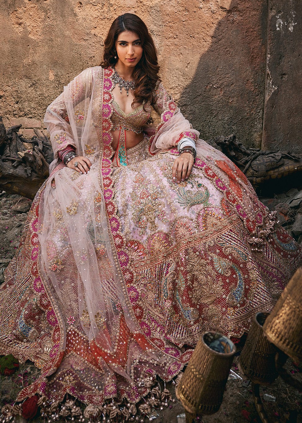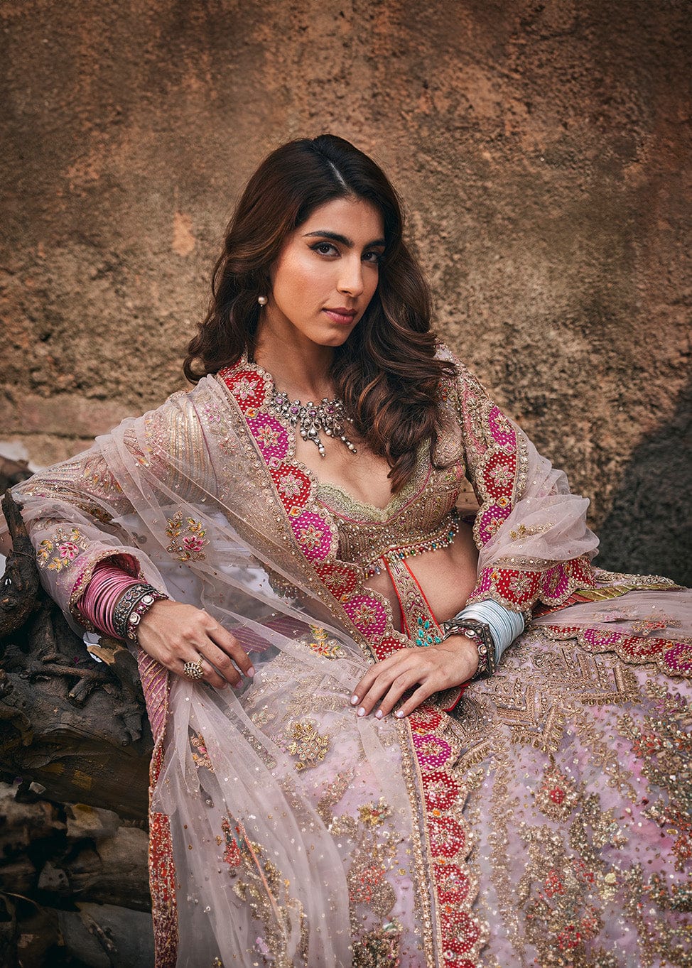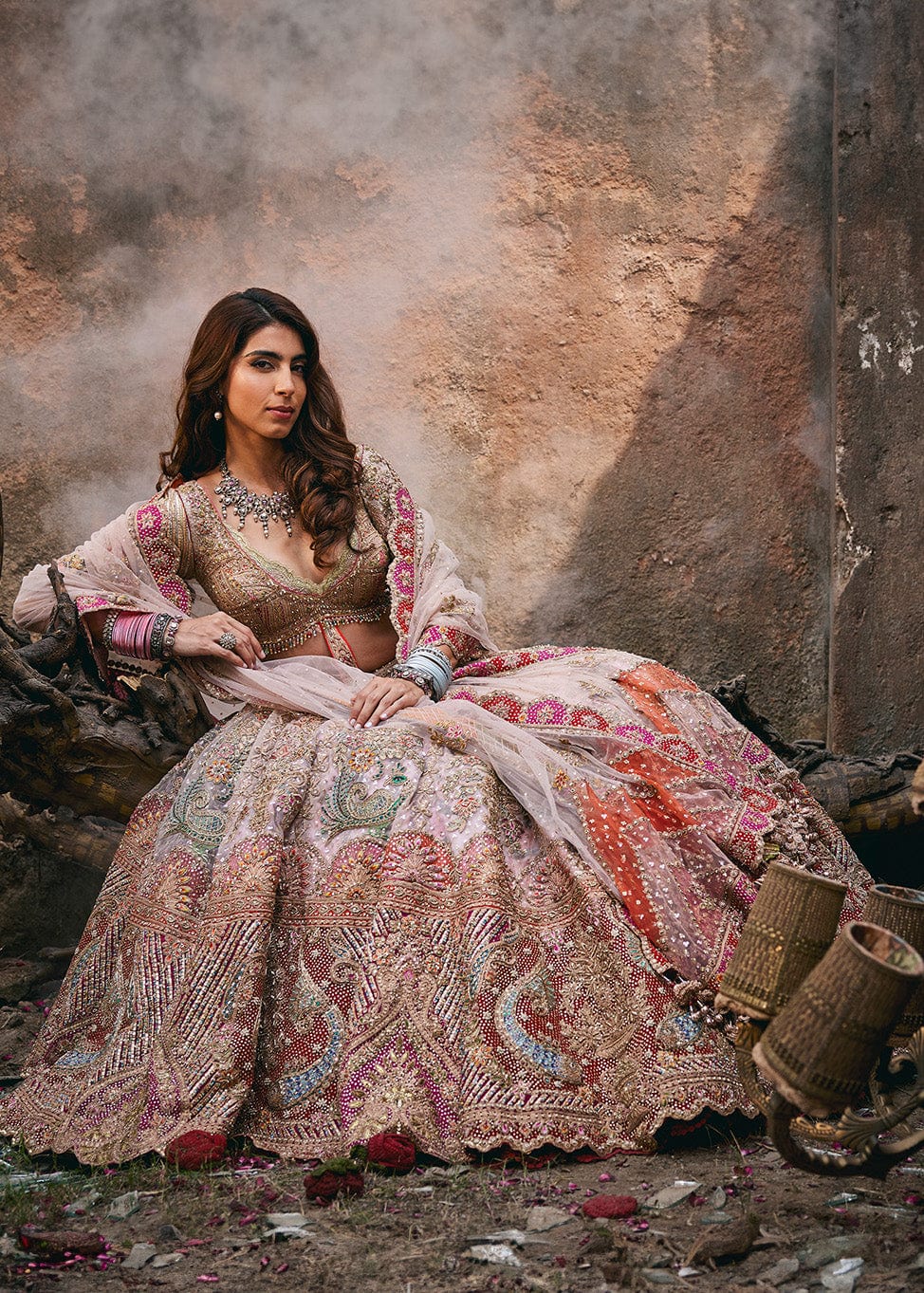 A blush pink lehenga.The skirt features floral and avian motifs derived from a melange of references- Mughal architecture details, sacred geometry and archival textile fragments. The embroideries are rendered using kasab-dori marodi ka kaam, resham-zardozi, dabka, naqshi, Kashmiri tilla, sequins, pearls and semi precious stones. It is paired with an embroidered illusion tie-up choli and diaphanous tulle dupatta.