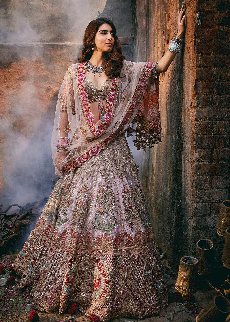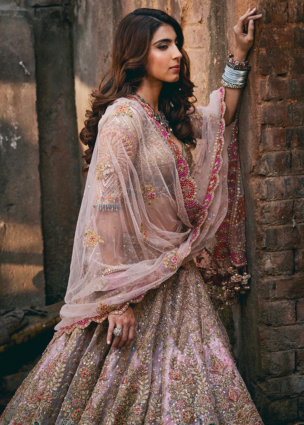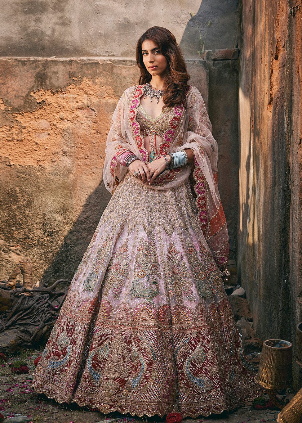 A blush pink lehenga.The skirt features floral and avian motifs derived from a melange of references- Mughal architecture details, sacred geometry and archival textile fragments. The embroideries are rendered using kasab-dori marodi ka kaam, resham-zardozi, dabka, naqshi, Kashmiri tilla, sequins, pearls and semi precious stones. It is paired with an embroidered illusion tie-up choli and diaphanous tulle dupatta.