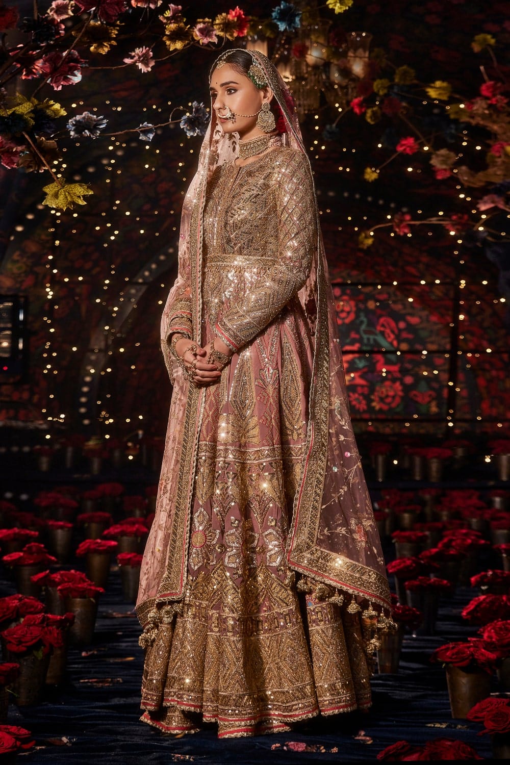 The collection is a melting pot of artistic influences and hand crafted couture. A riot of motifs- vases brimming with floral bouquets, rococo-esque gilted frames and floral vines, Palampore chintz, Chinoserie gardens and fantastical birds along with elements from sacred geometry, theatre and the performing arts are used in a painterly fashion on lehengas and shararas that are dipped in hues of glistening golds, lush reds and vivid pinks