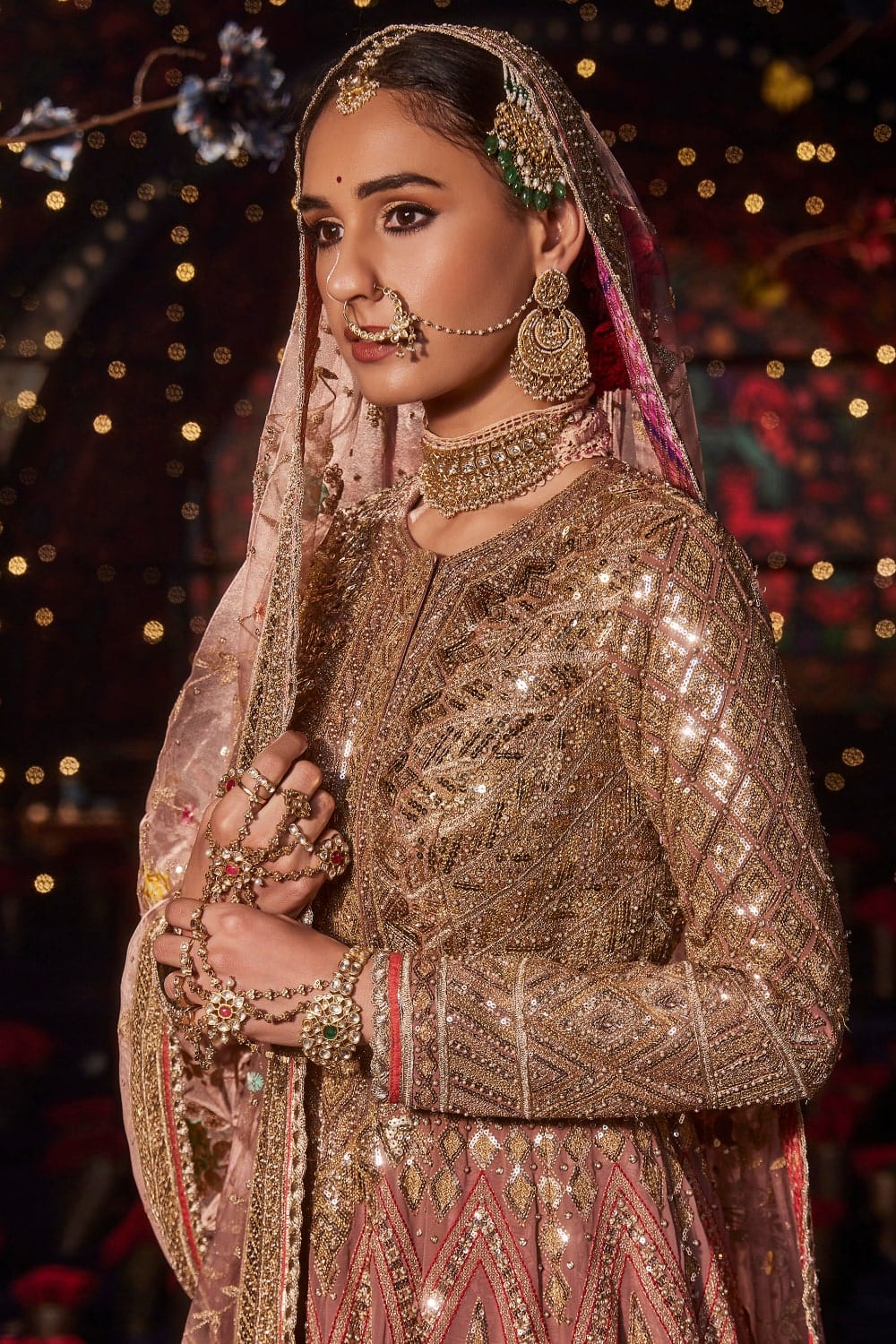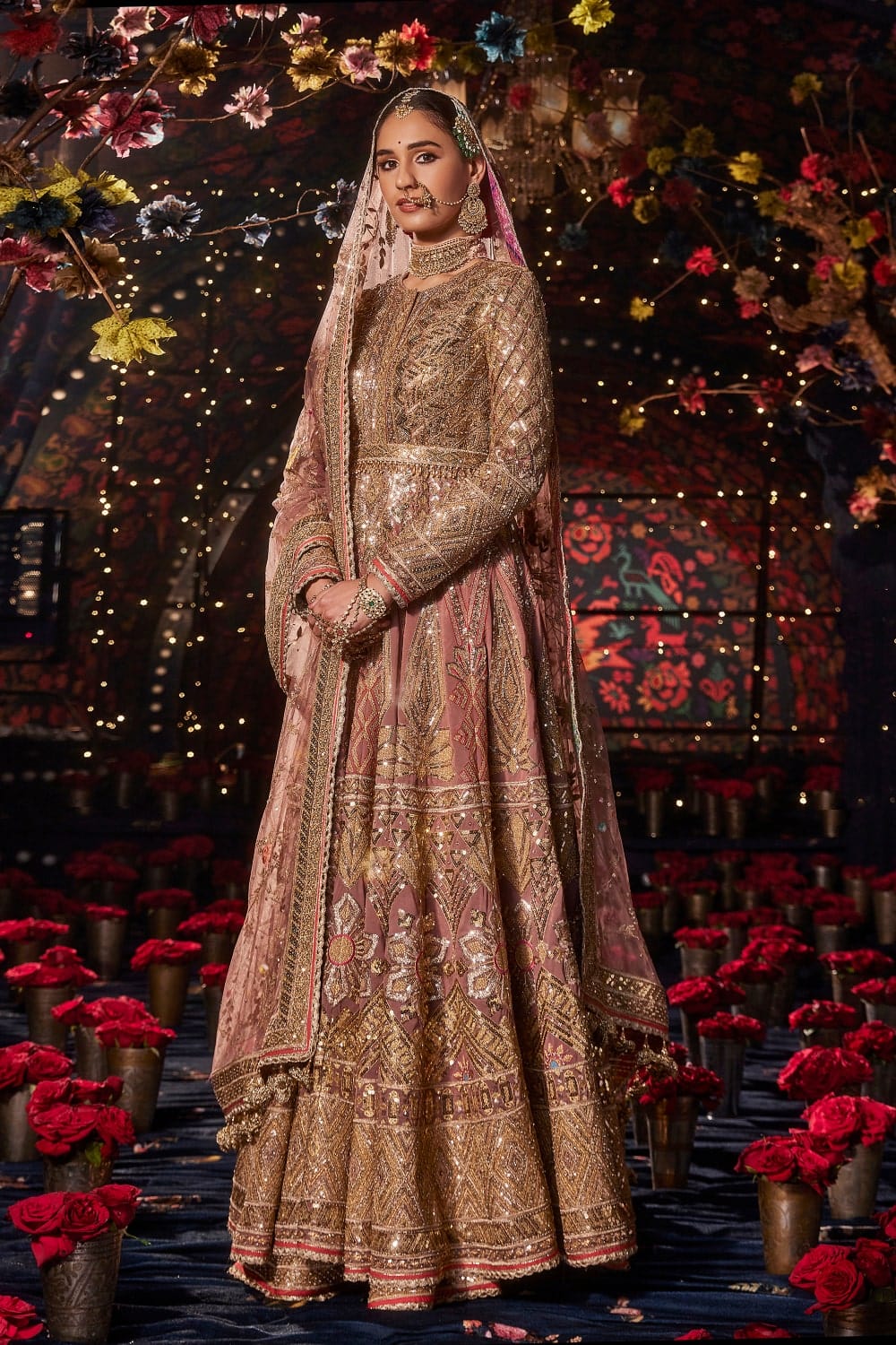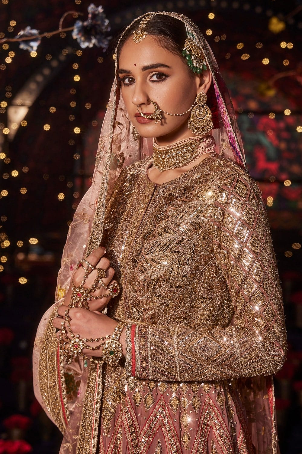 A blush pink kalidar. The set features geometric motifs derived from an archival 19th century Assuit robe and sacred geometry. The embroideries are rendered using kasab-dori marodi ka kaam, dabka, naqshi, sequins, pearls and semi-precious stones. The look is completed with a georgette sharara, a sequin encrusted belt and a diaphanous tulle dupatta. Kalidar:Georgette