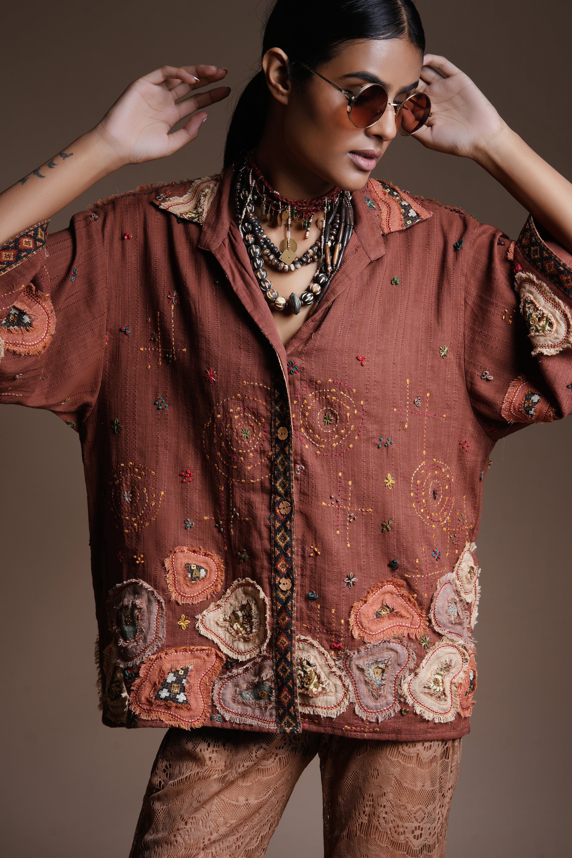 Brown patch cape kimono shirt - a relaxed oversized shirt with drop shoulder and featuring a bohemian look with print patches and colourful fray work.