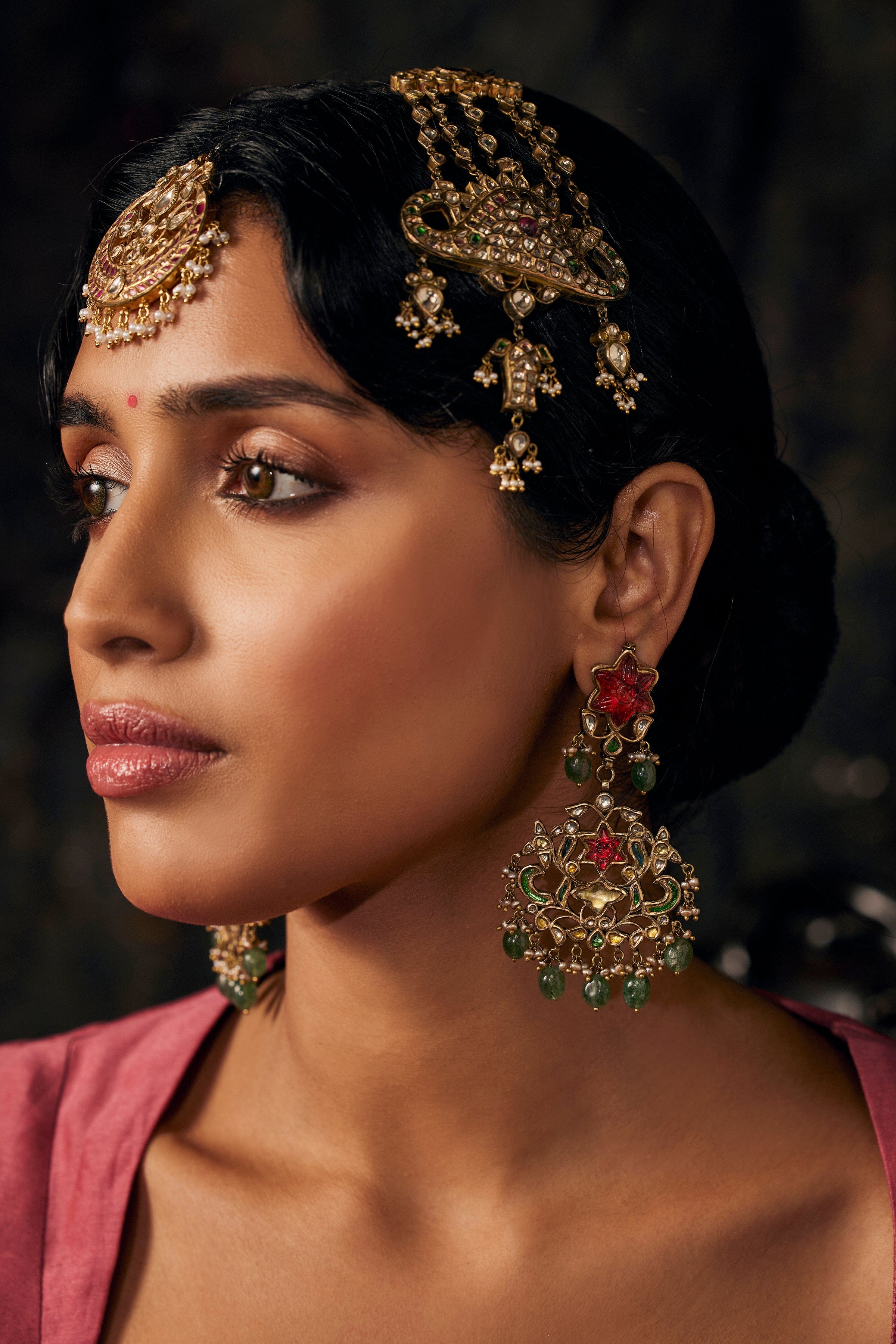 Sitara earrings in gold infused 92.5 silver with carved ruby, polki and stringing in emeralds. Comes with a clip at back for extra support and push screw.