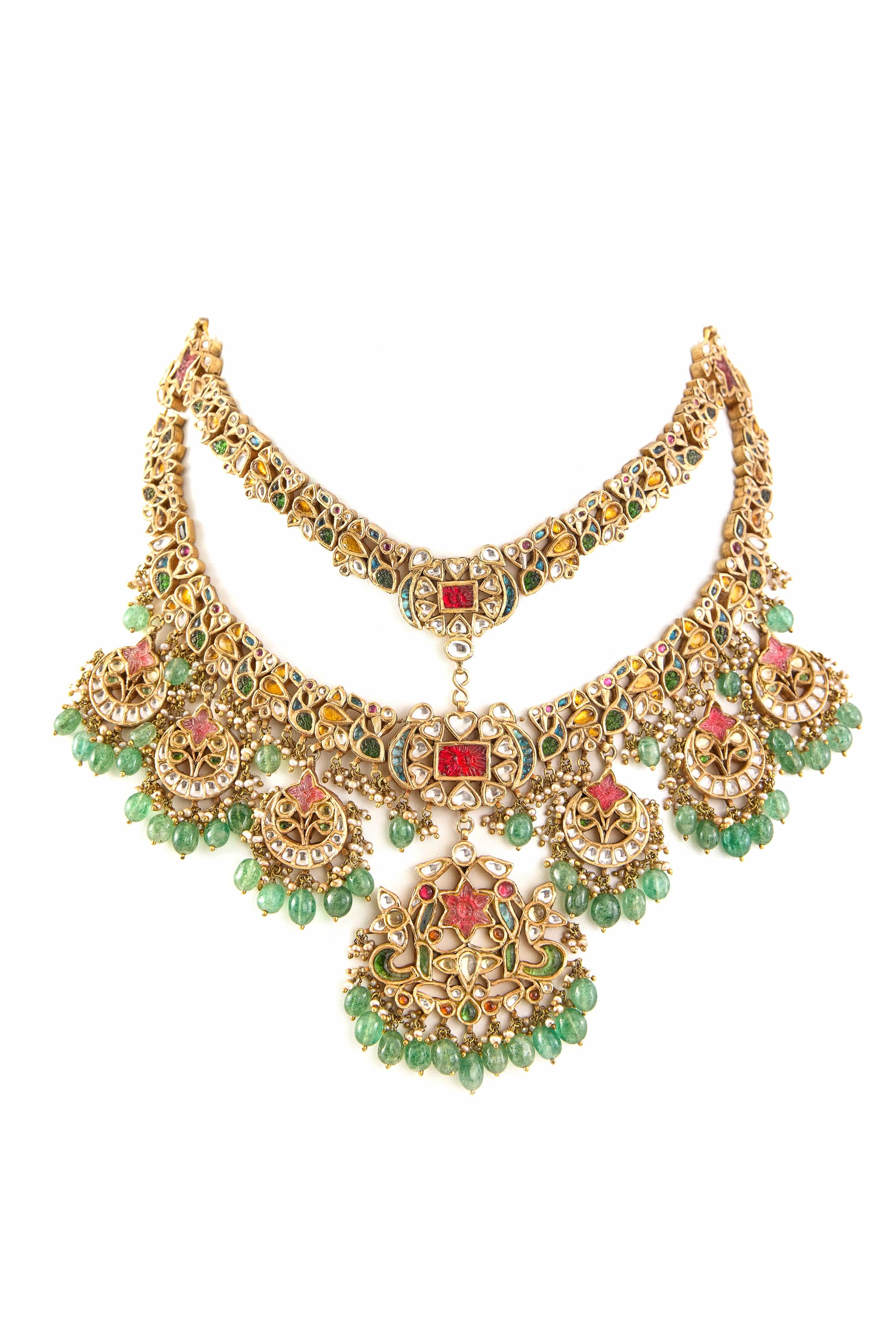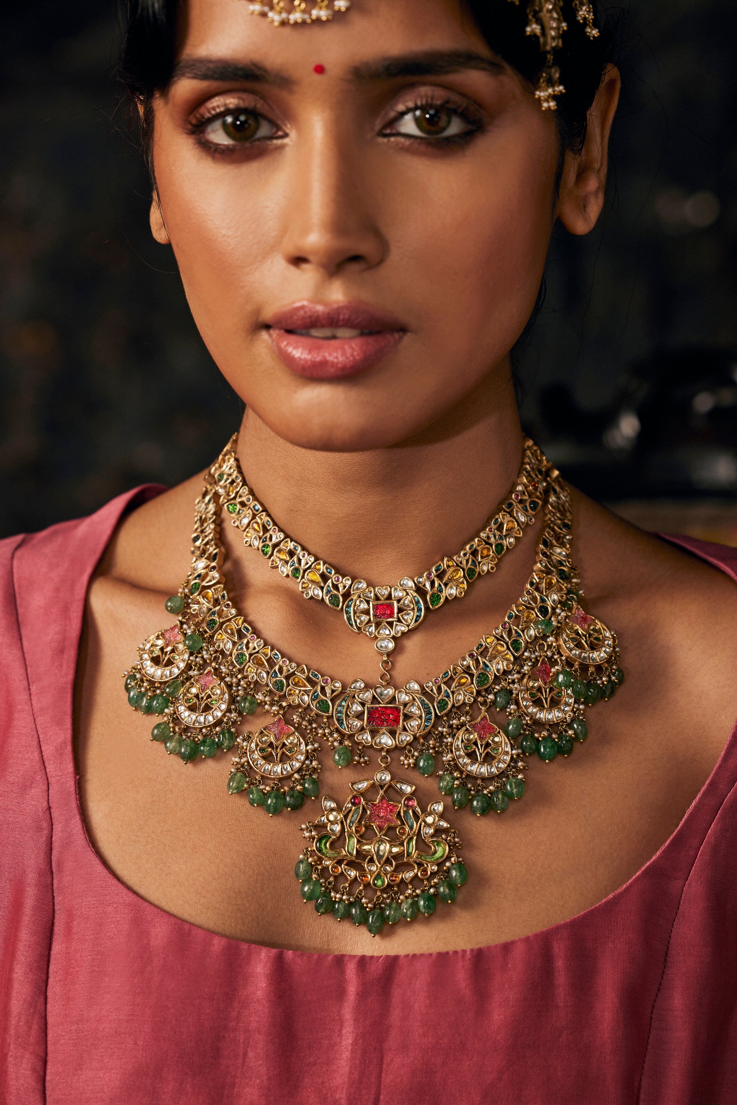 Jadau Gulband two layer necklace in gold infused 92.5 silver with polkis, rubies, mogas, blue sapphires, yellow sapphires and stringing of moti and aventurines. Comes with a traditional indian dori closure.