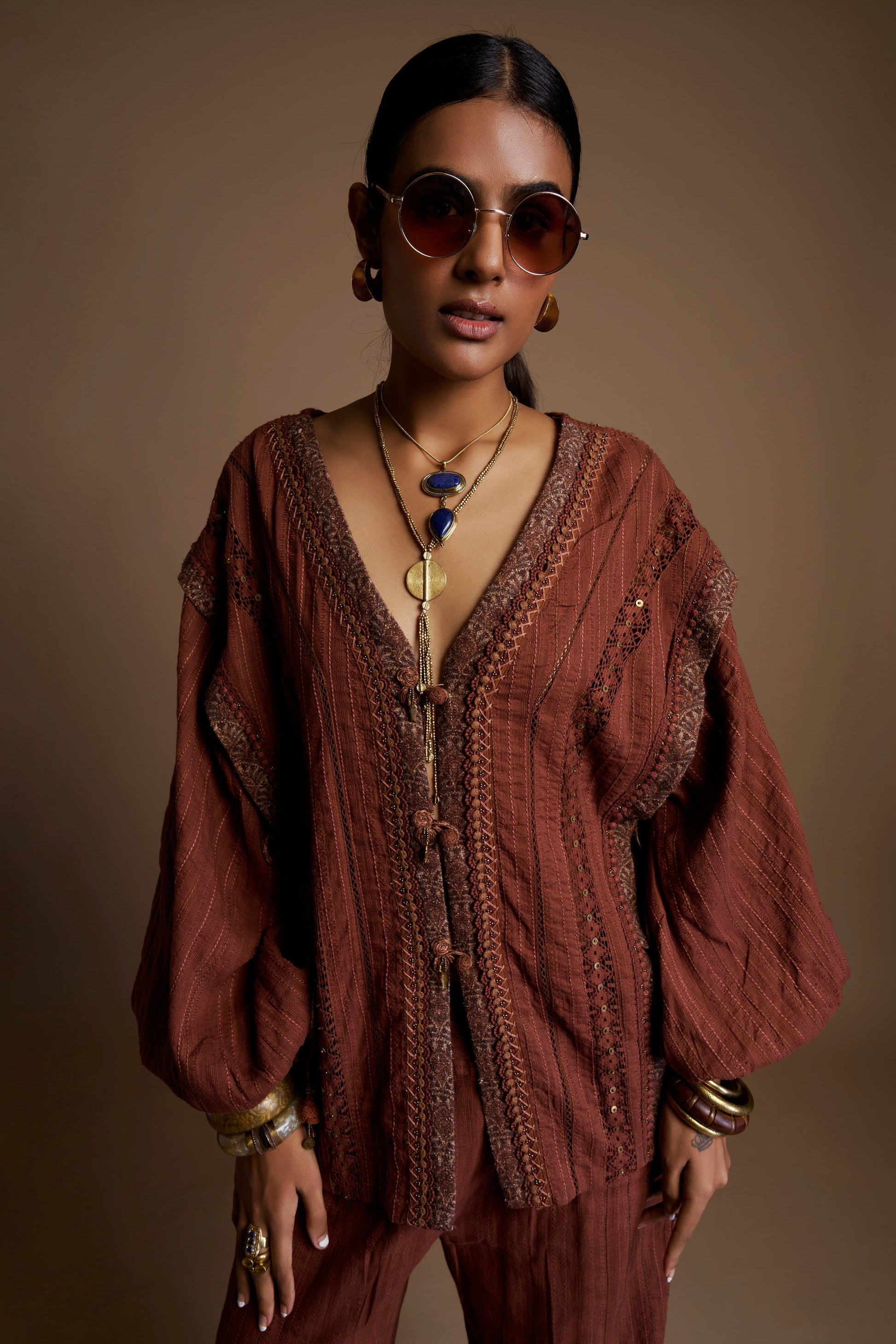 Inspired by earthy craft traditions, this coffee cord set blends textured lines, lacework, and delicate metal work to create a warm, artisanal story. Every stitch and trim adds depth—bringing a rustic charm and handcrafted richness to the silhouette.