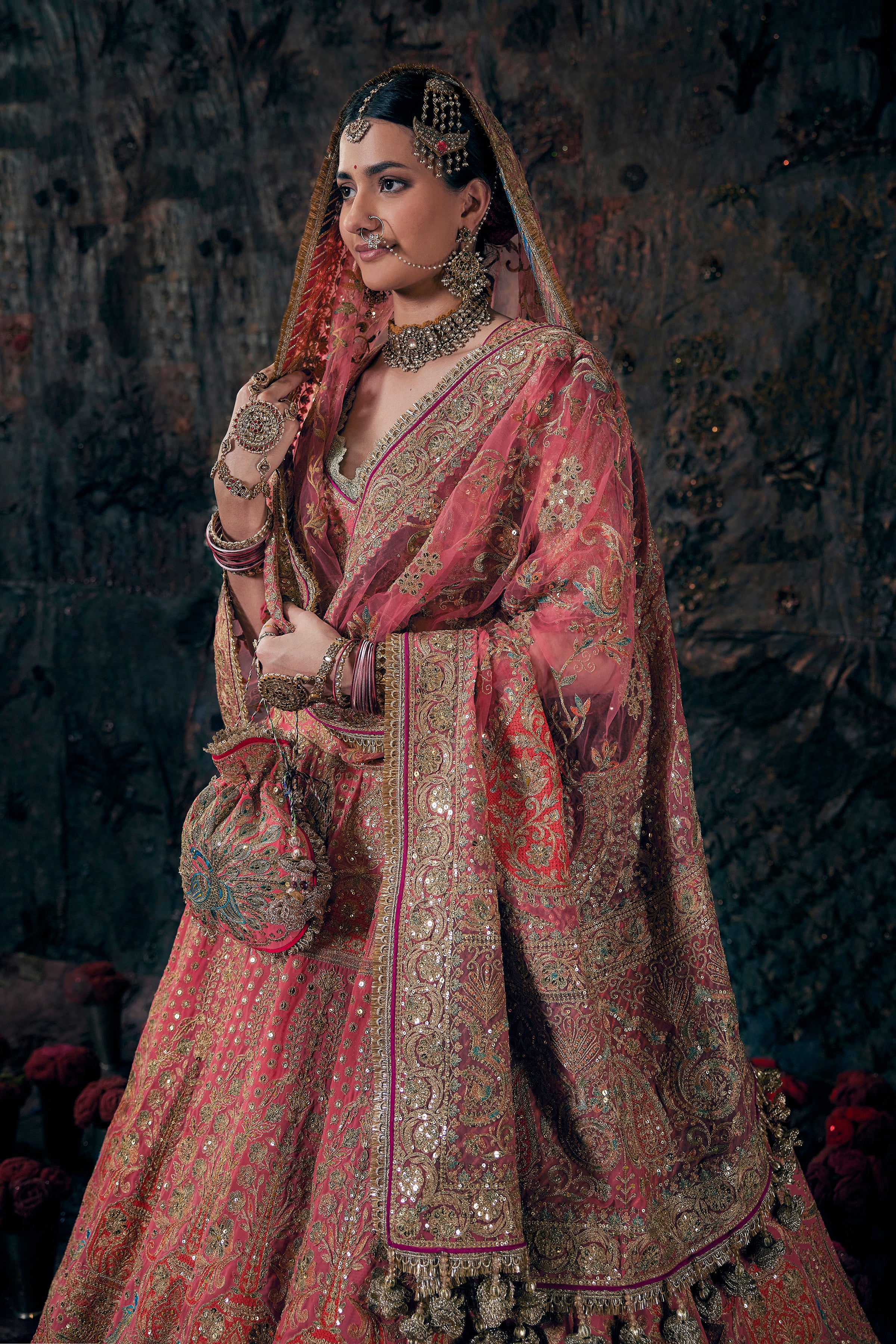 A coral hued georgette lehenga. The skirt features artworks gleaned from Mughal era artefacts, inlay work and architectural details. It is paired with an embroidered choli and diaphanous tulle dupatta.