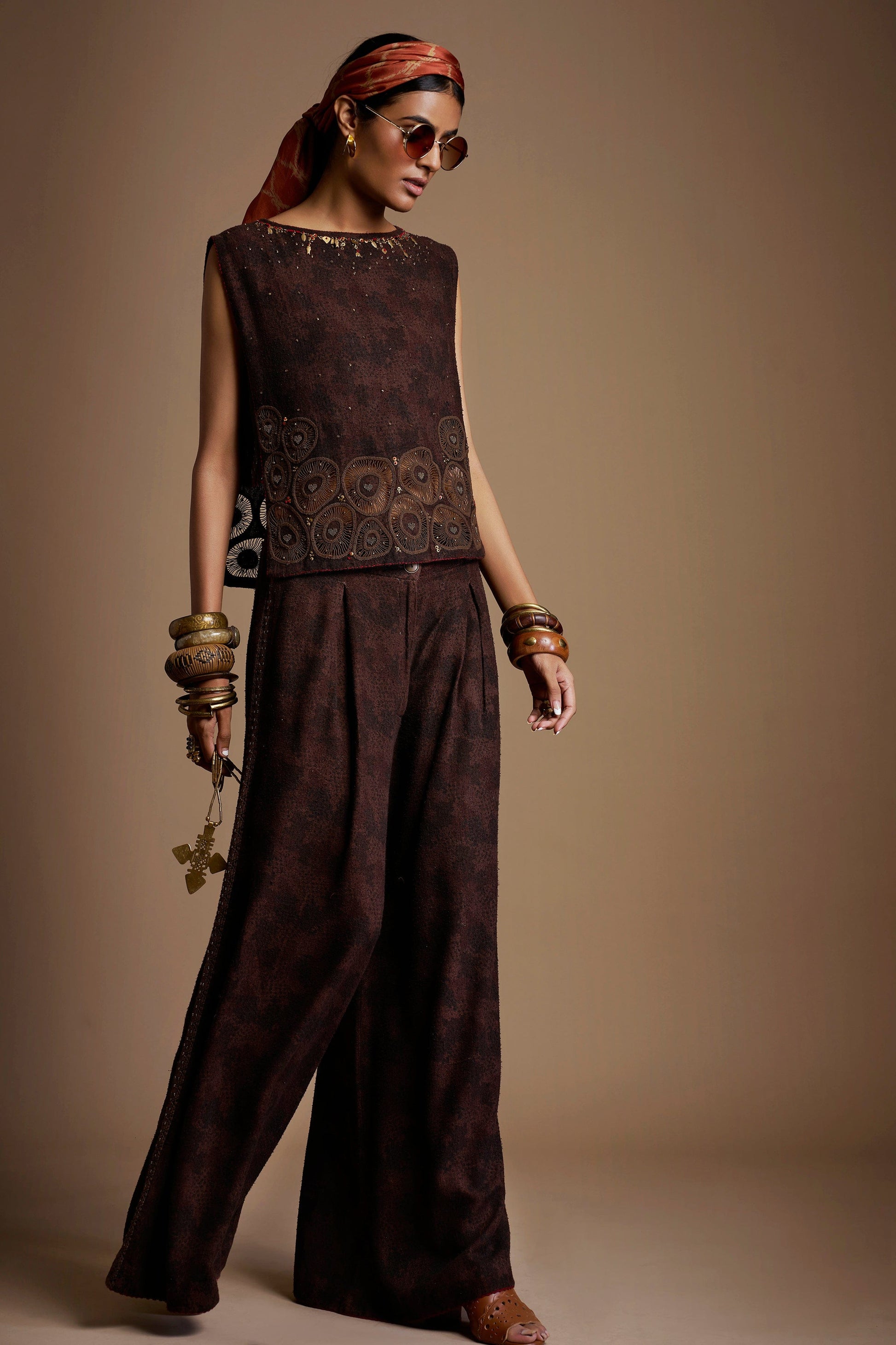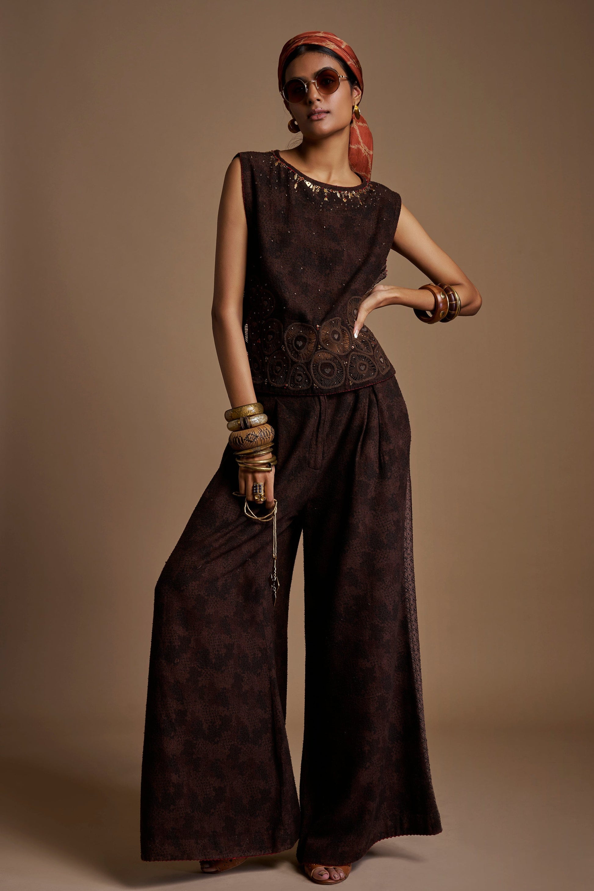 This dark brown co-ord is shaped by the poetry of earth and time. The cutwork along the lower half of the top creates a breathing surface—revealing as much as it holds—while scattered metal embroidery appears like fleeting moments, deliberately unaligned and human. The deep brown base anchors the piece in warmth and depth, allowing light to move gently across its textured surface. Thoughtfully crafted and instinctive in spirit, the ensemble speaks of patience, imperfection, and the quiet power of details that reveal themselves slowly.