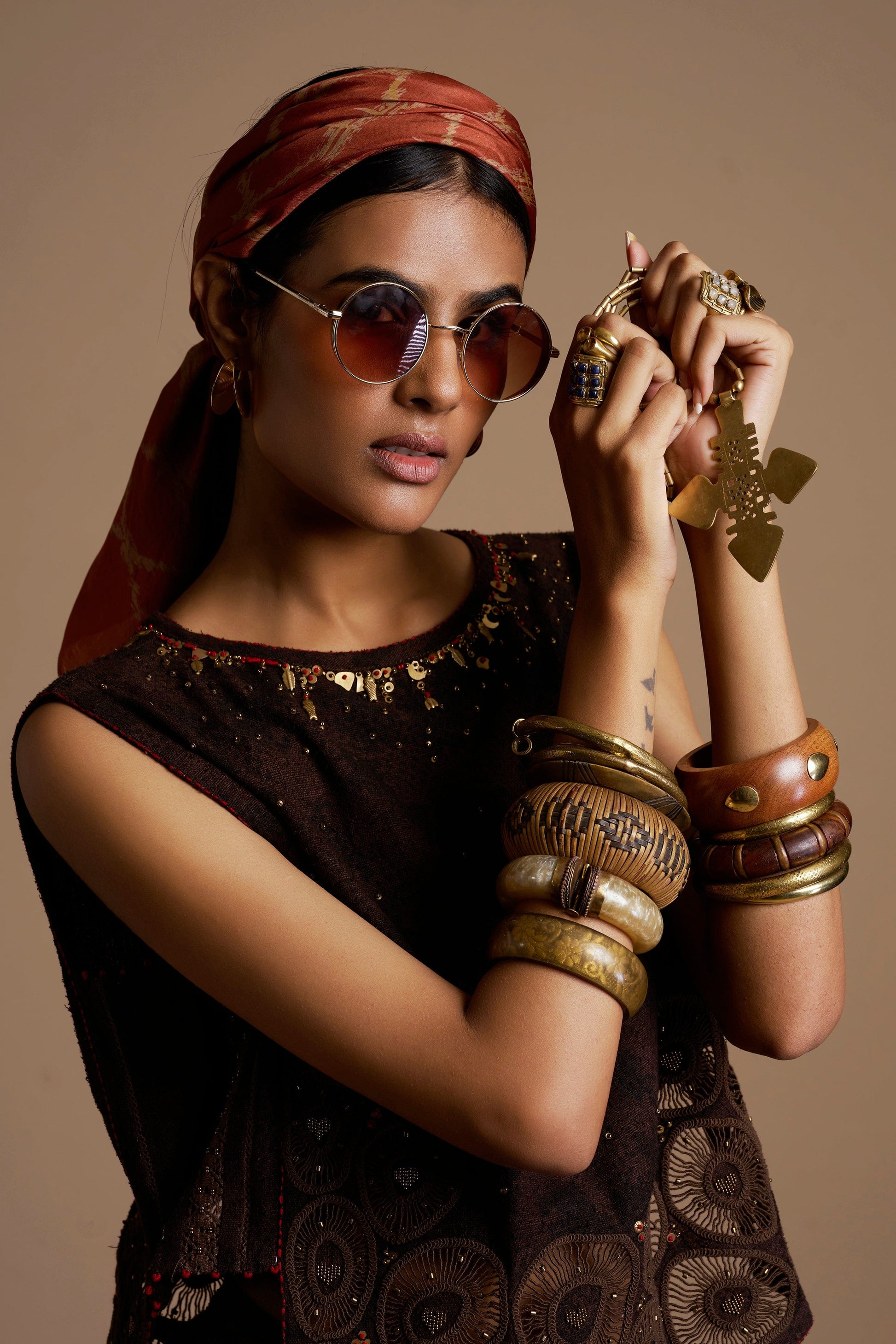 A dark brown coord set featuring intricate cutwork, brass metal embroidery, and bold red anchor edging for a rich, artisanal finish.
