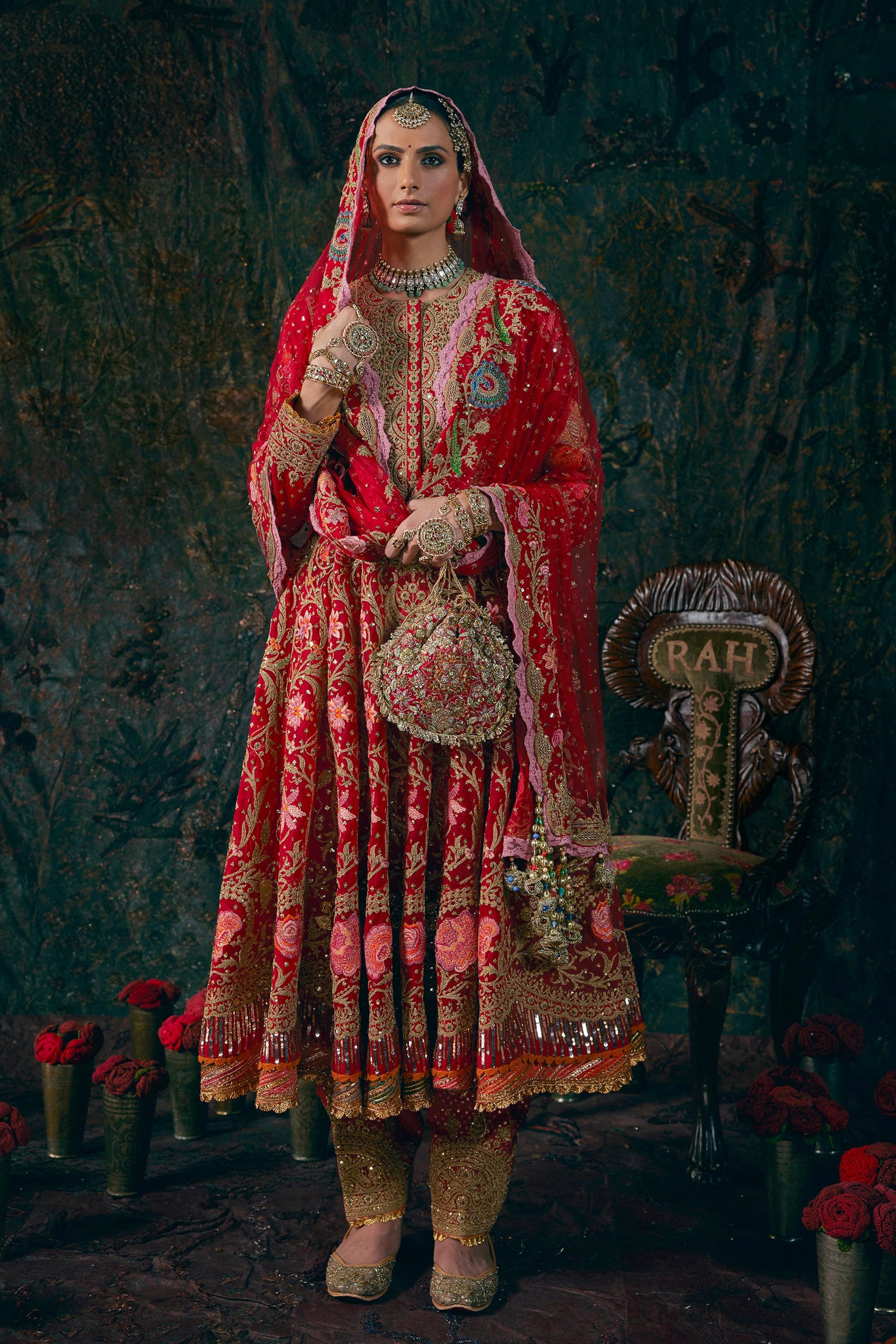 A deep red floral tulle kalidar paired with an embroidered salwar and a tulle dupatta.