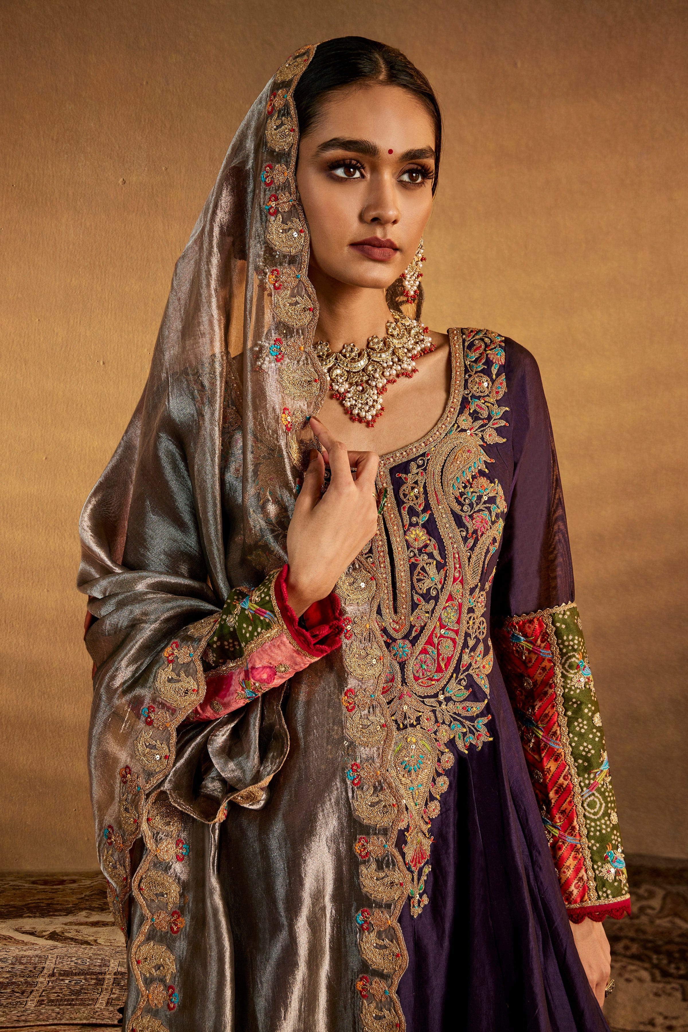 A deep purple silk kalidar kurta paired with a salwar and a tissue dupatta