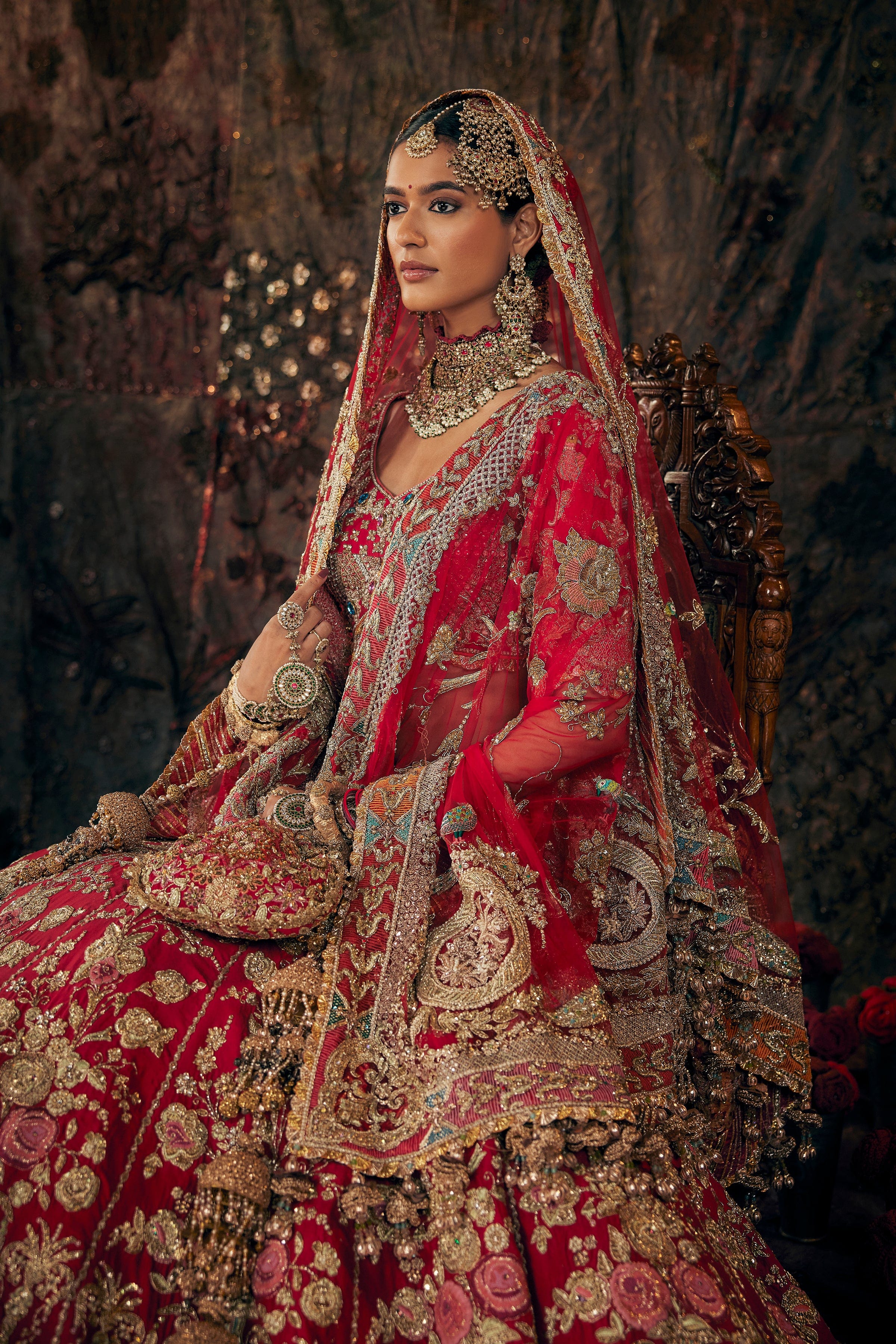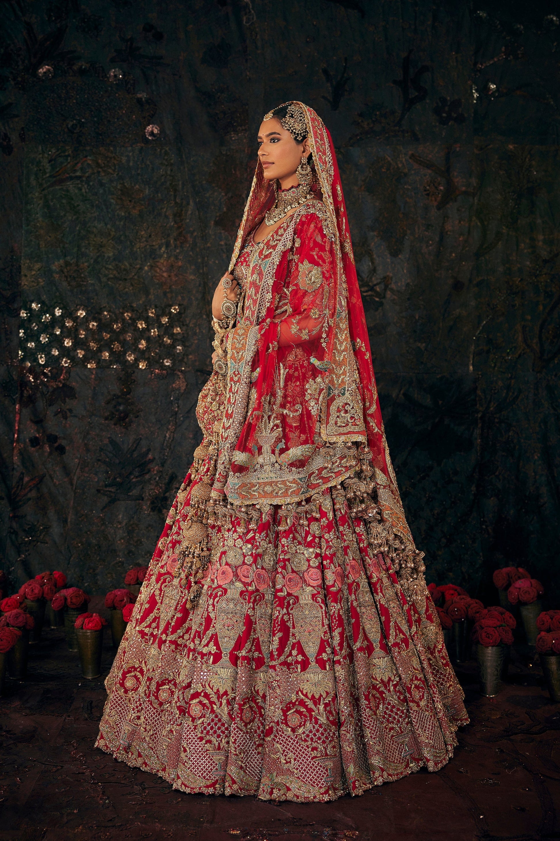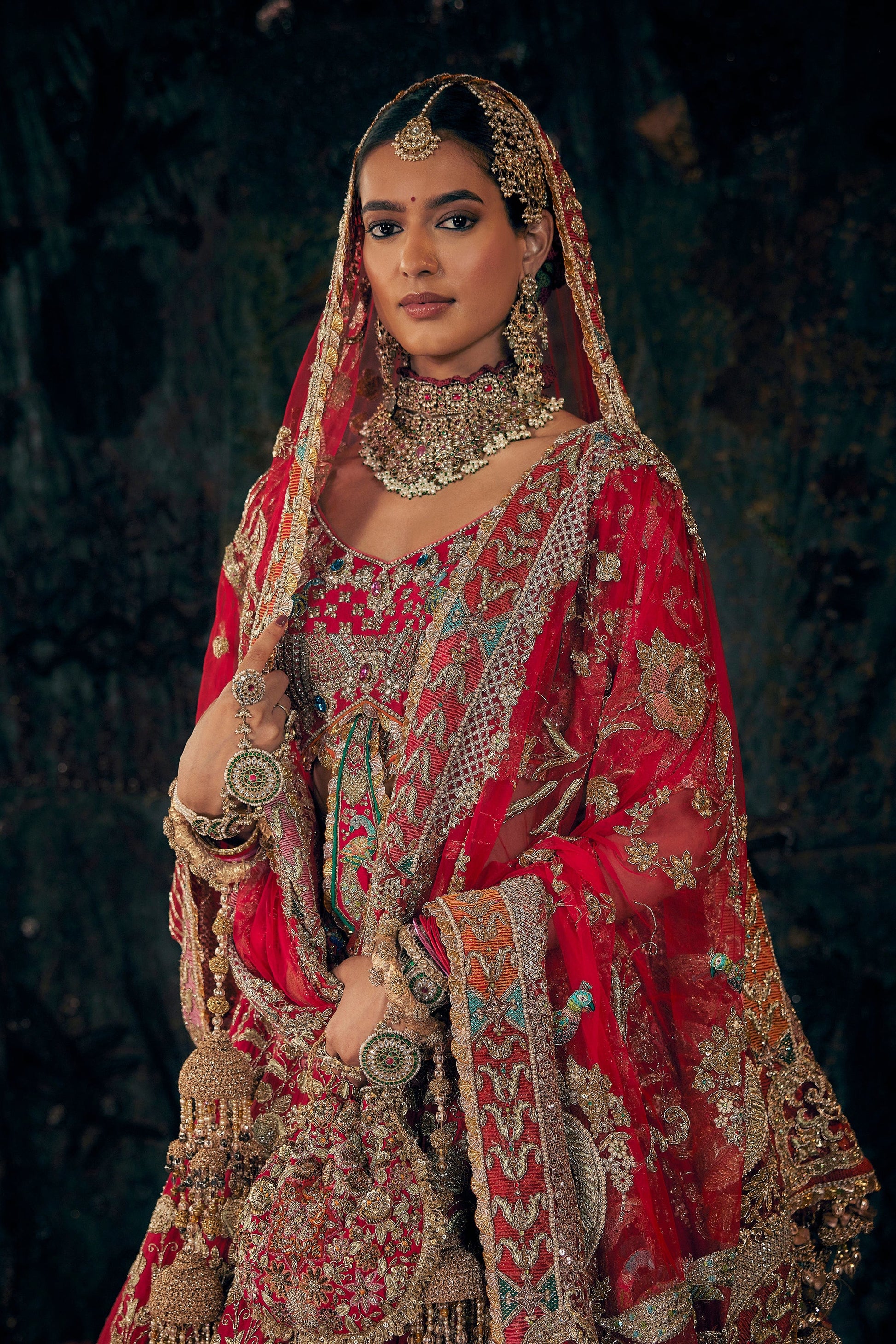 A deep red silk lehenga. The handcrafted skirt features bejeweled vases brimming with rosette bouquets gleaned from Persian carpets which are layered with geometric patterns derived from archival fragments of jaali ka kaam and sacred geometry. It is paired with an embroidered illusion tie-up choli and diaphanous tulle dupatta.