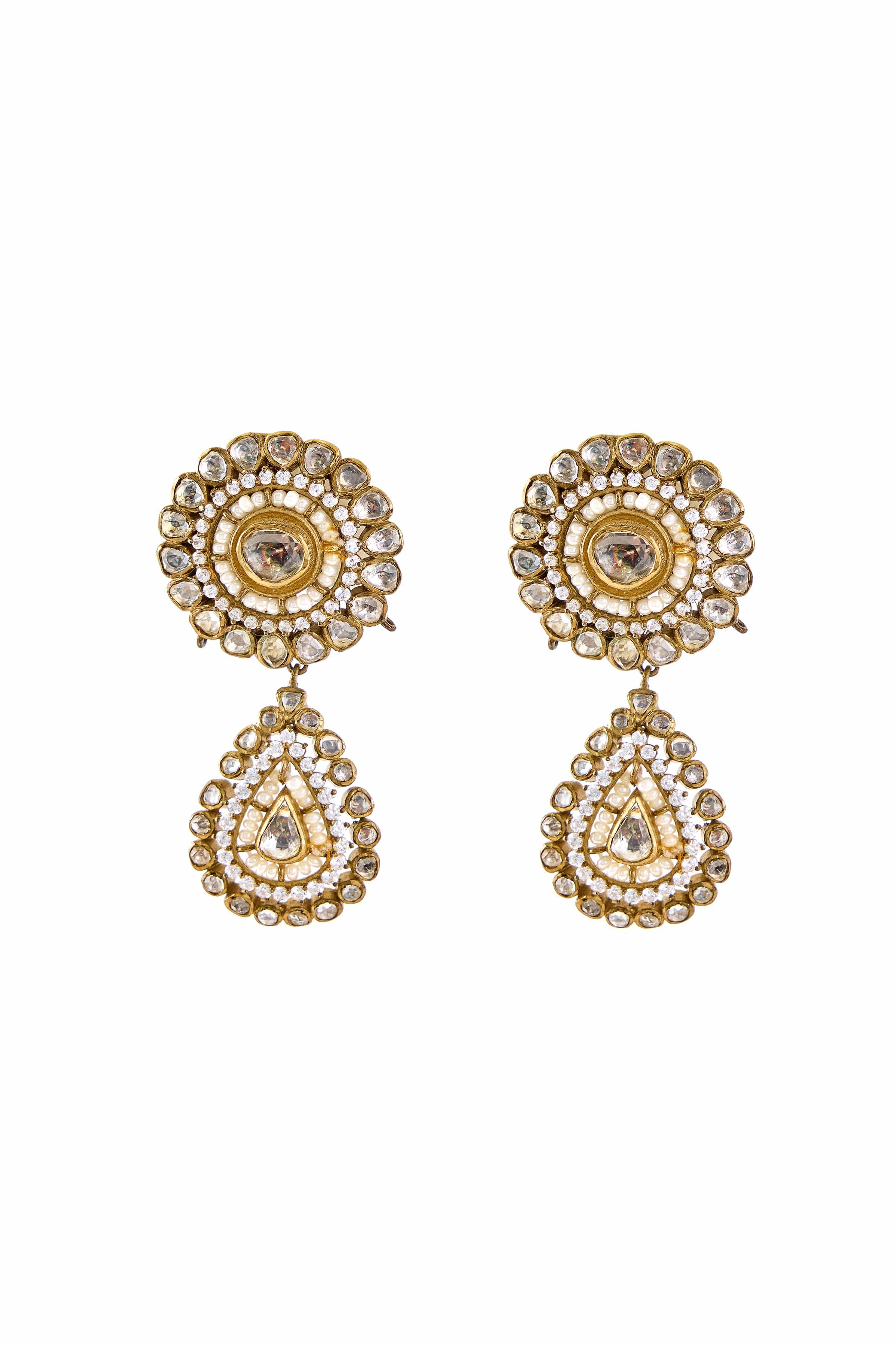 Victorian earrings in gold infused 92.5 silver with polki and fresh water pearls. Comes with a clip at the back for extra support and push screw.