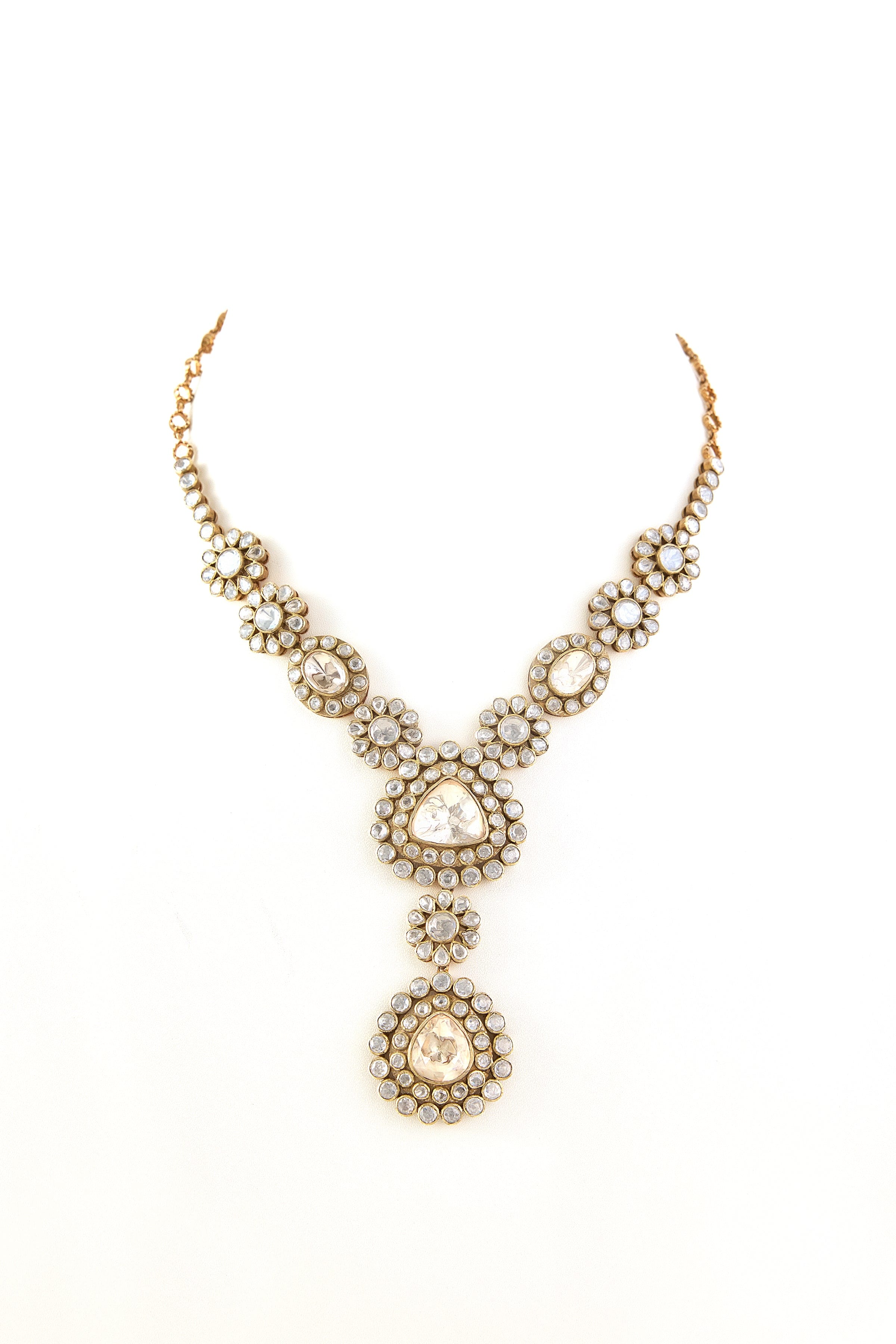 Victorian necklace in gold infused 92.5 silver with polki. Comes with an adjustable chain closure.