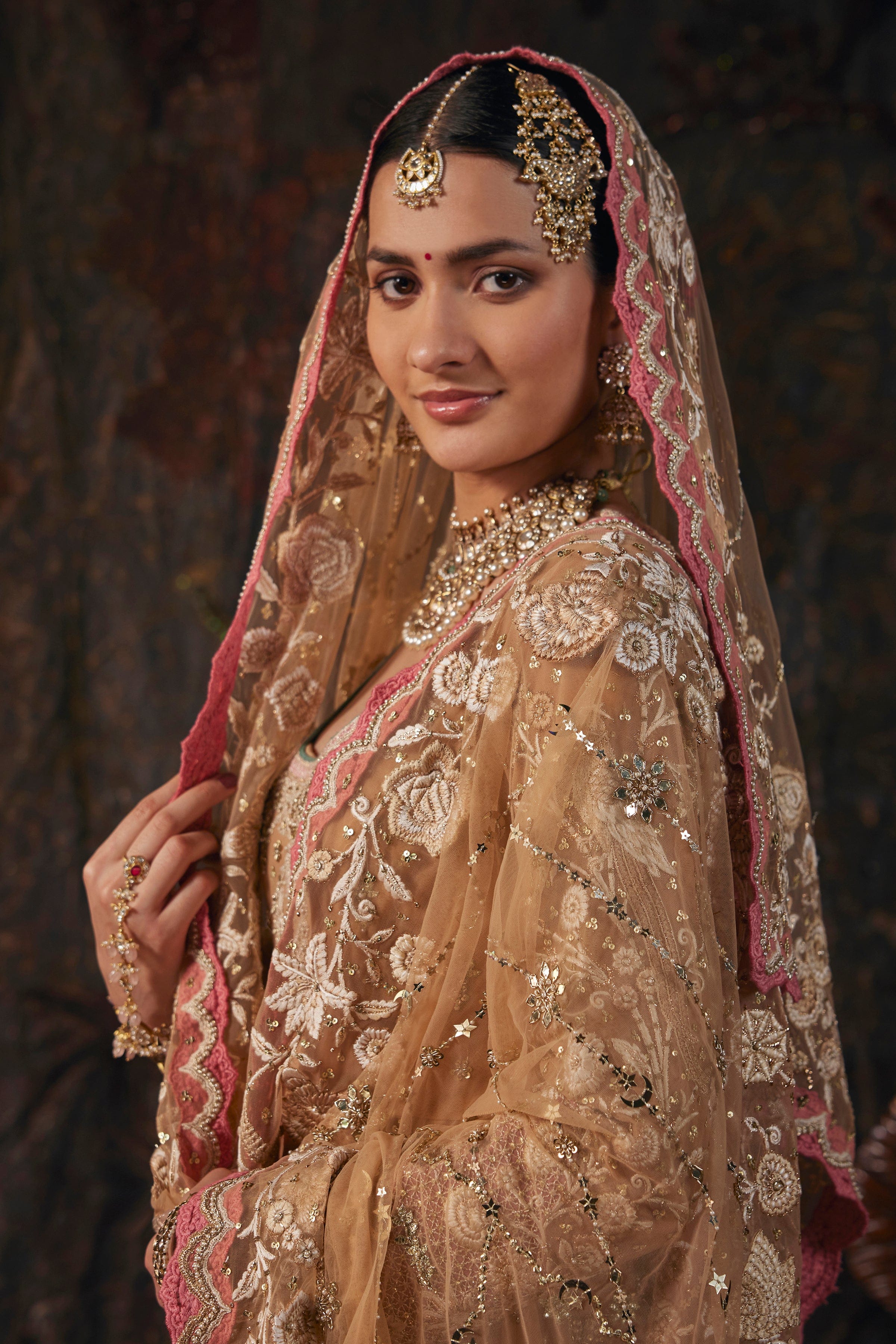 An earthy beige tulle kalidar paired with an embroidered salwar and a tulle dupatta