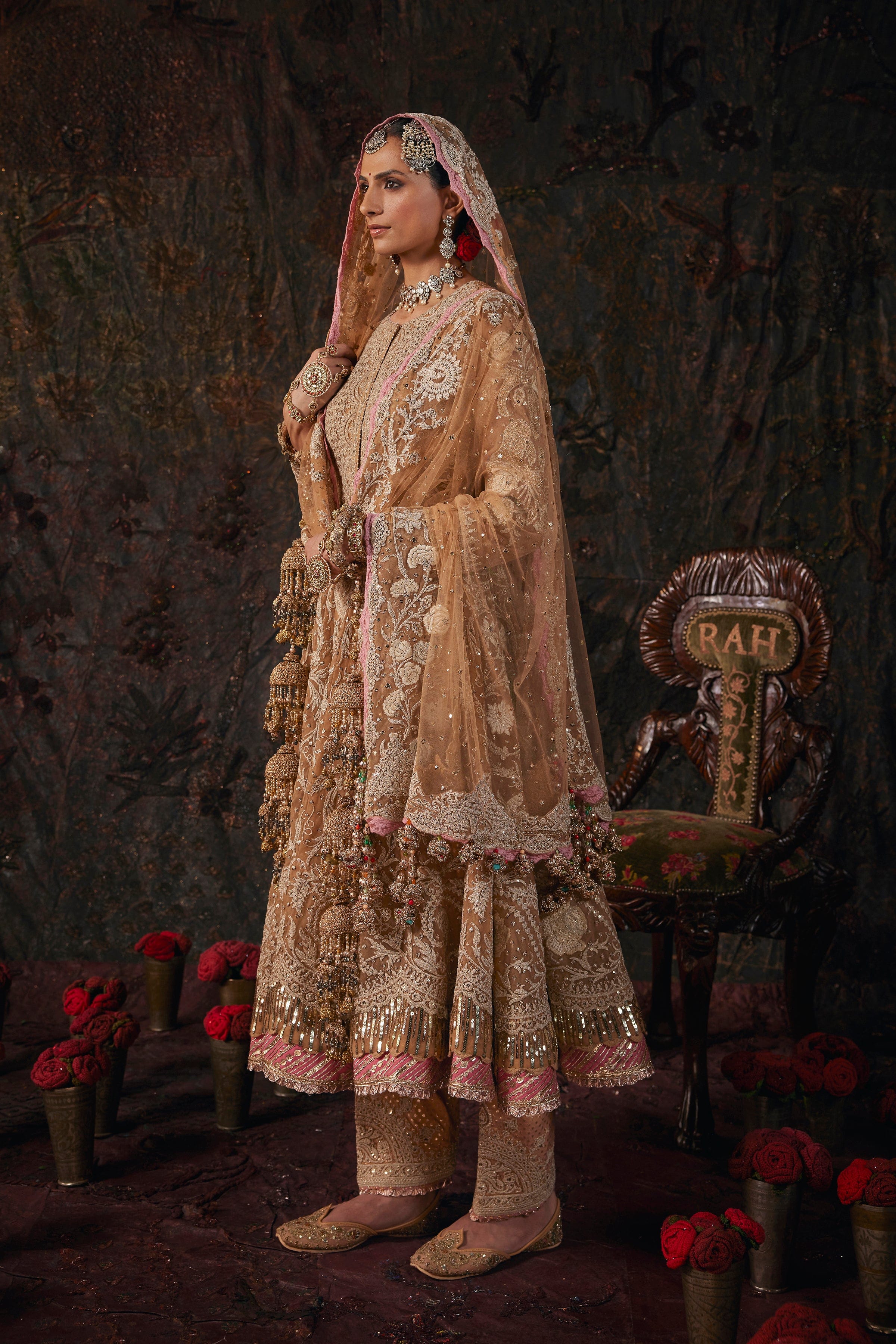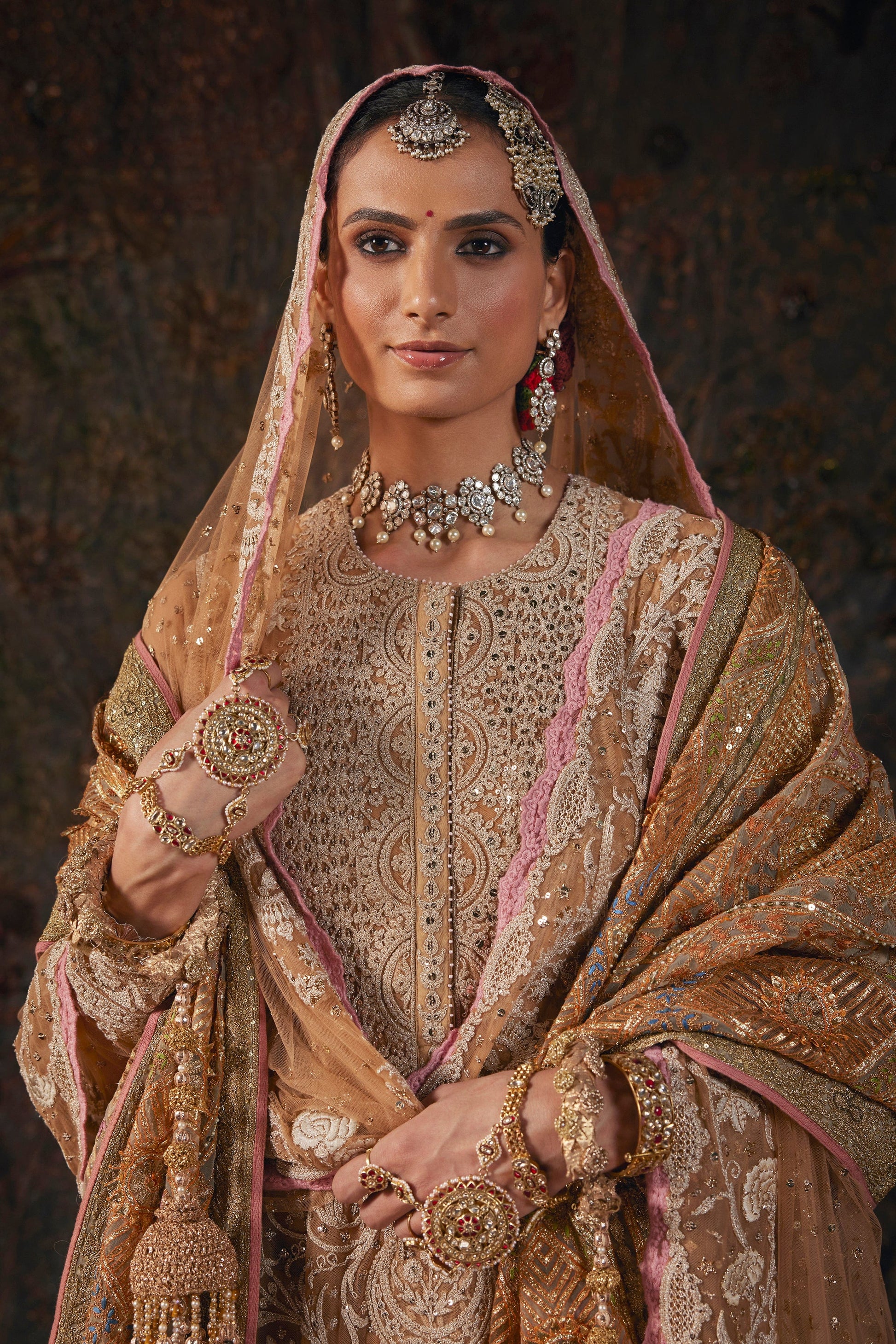 An earthy beige tulle kalidar paired with an embroidered brocade salwar. The set features artworks comprising of floral vines and swirling tendrils encasing blooming roses and lilies, gleaned from a 17th century chasuble robe as well as archival Kashmiri tilla shawls. It is offset with an embroidered tulle dupatta.