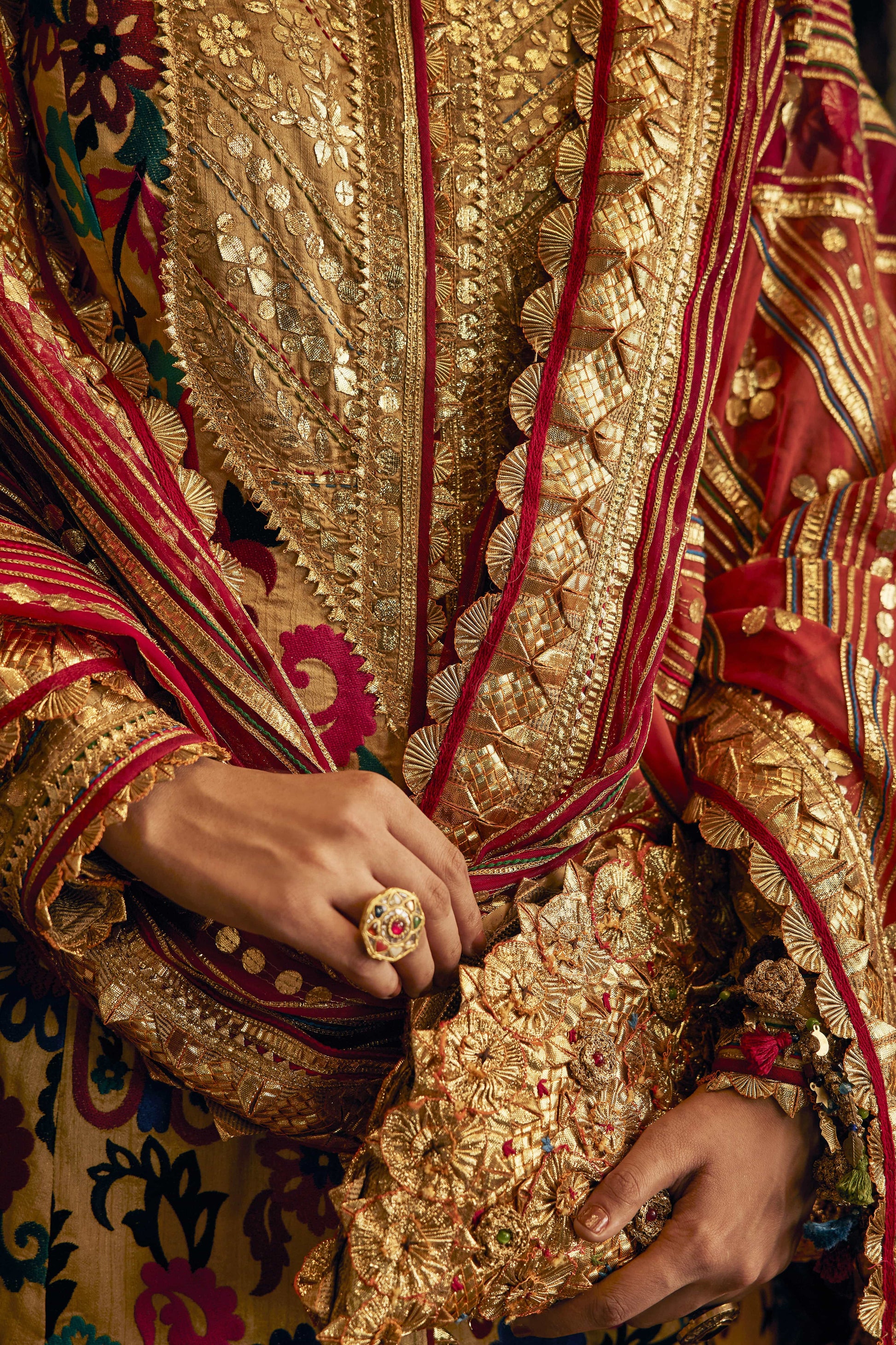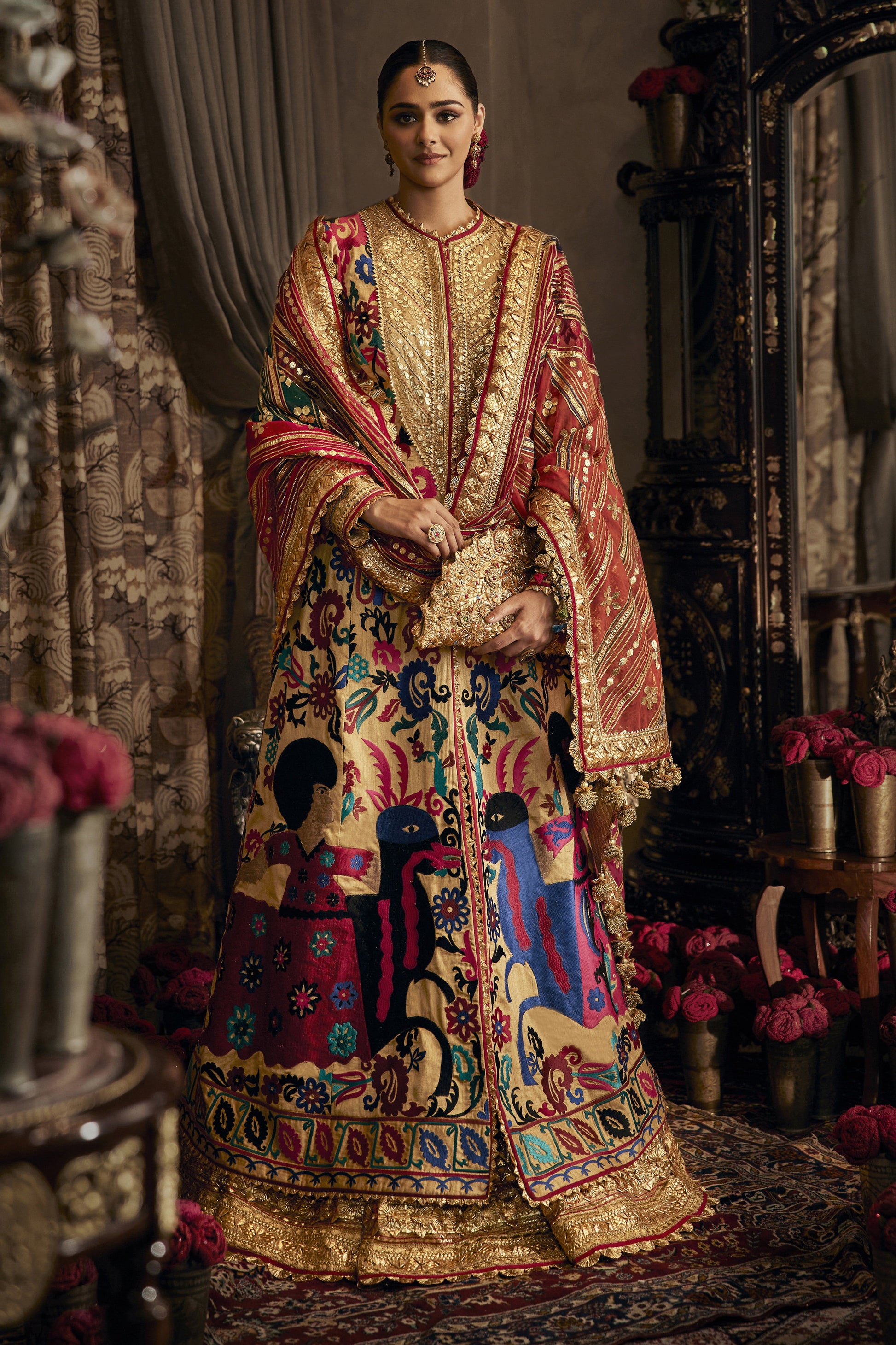 An earthy gold kalidar which is layered with multi-colored artworks and embroideries gleaned from a vintage archival Suzani textile (most likely from Uzbekistan). It is paired with a georgette skirt that has a base print derived from antique Jamawar shawls and stacked gota texture borders. The look is completed with a multi-hued organza dupatta.