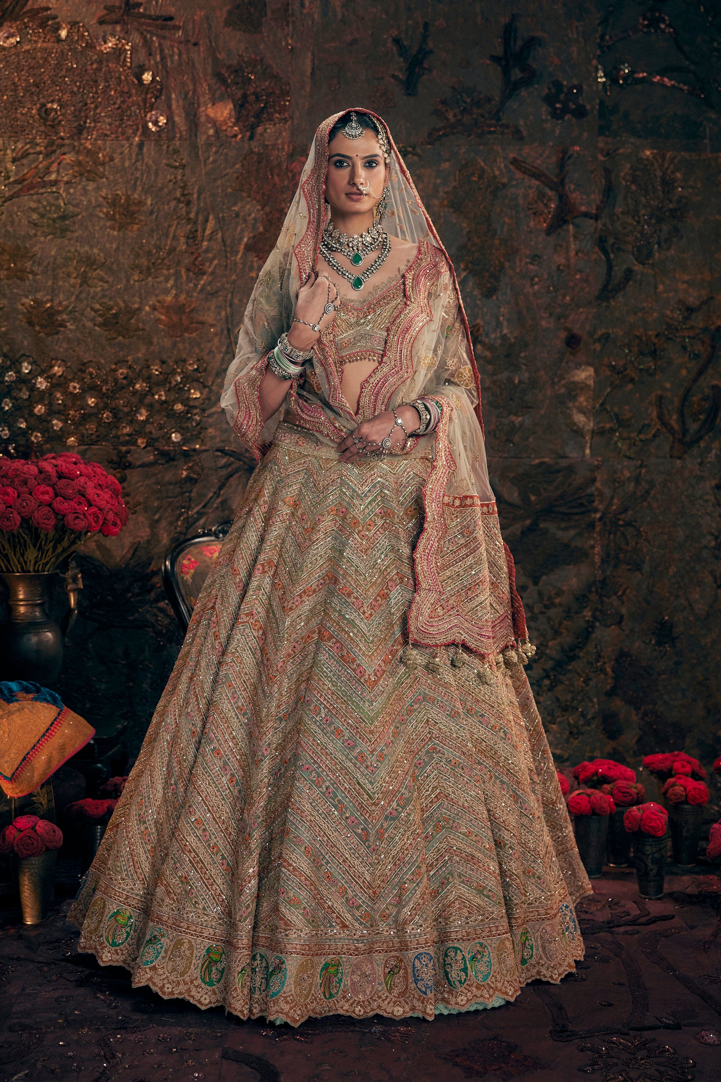 An earthy ice blue tulle lehenga with a choli. The set features and all over geometric motifs derived from art deco embroidered using marodi ka kaam highlighted with sequins, applique and pearls. The look is completed with a tulle dupatta.