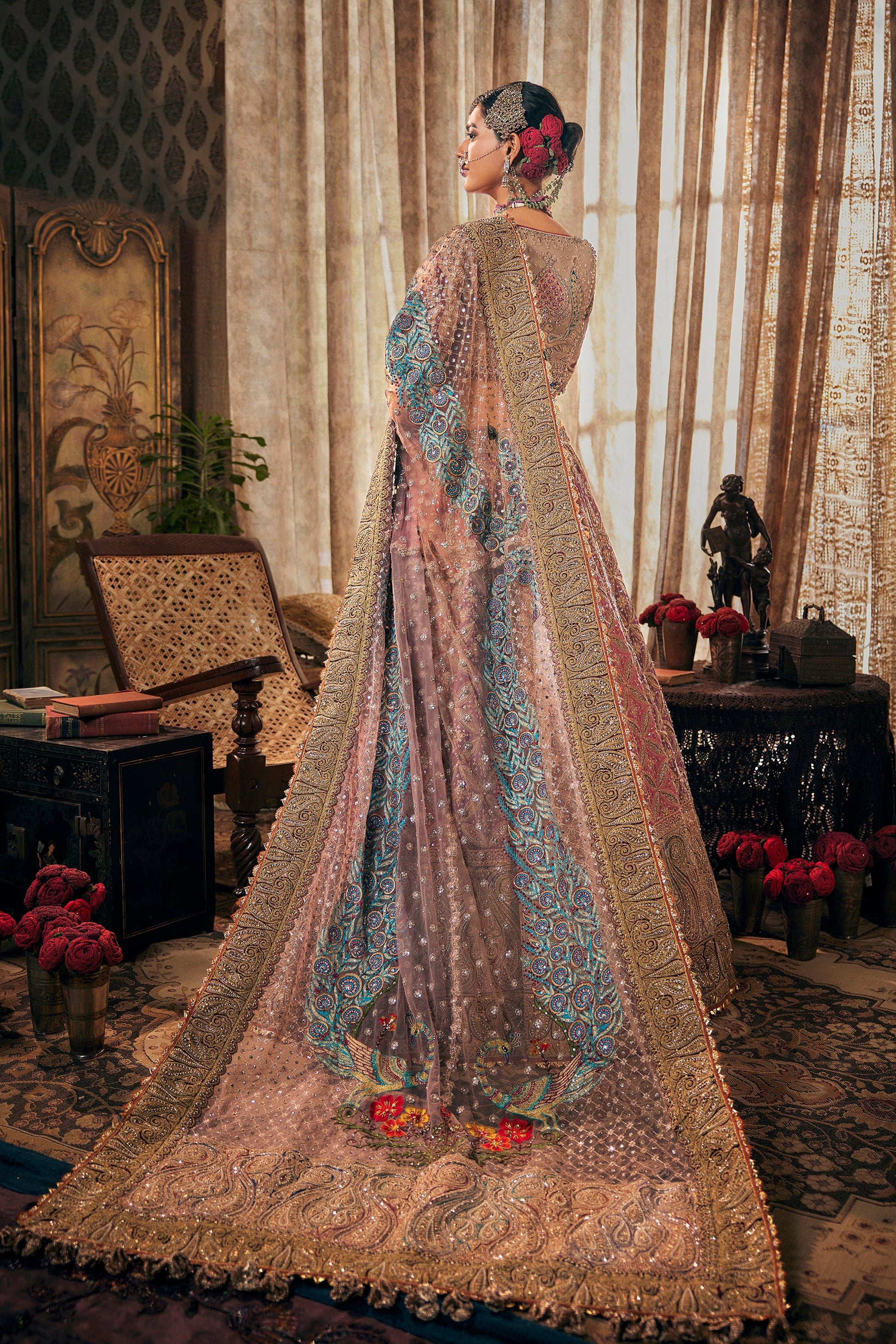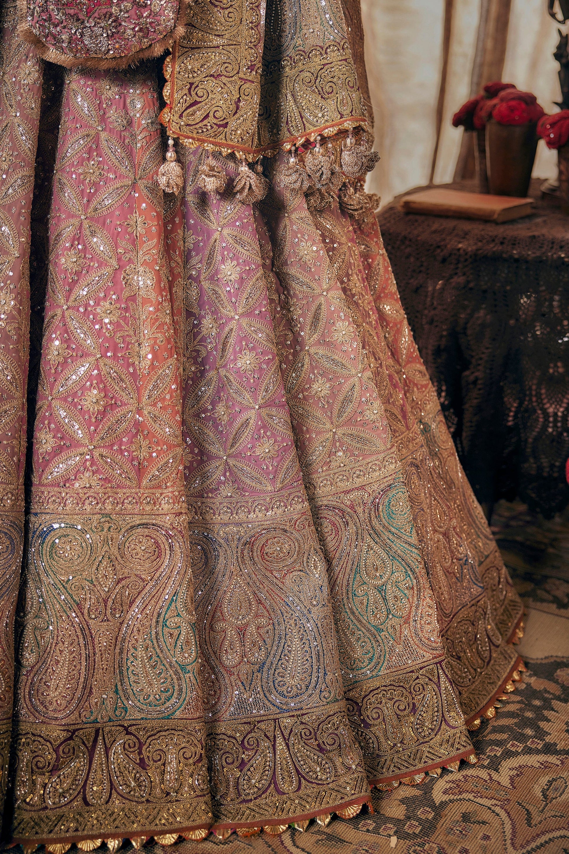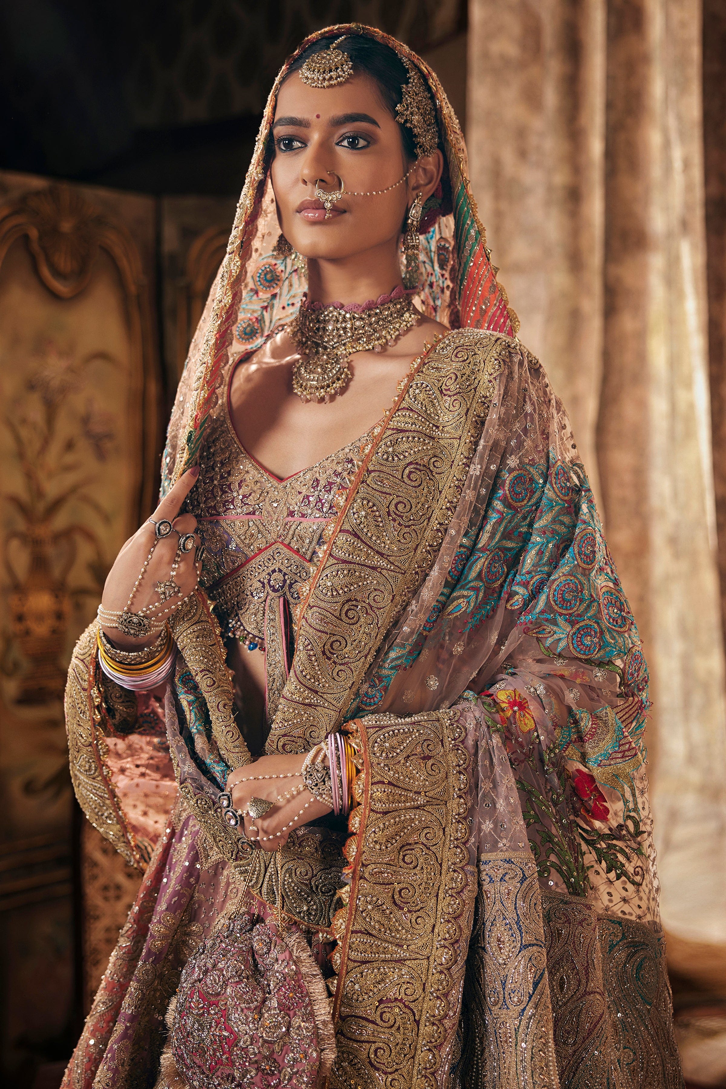 A multi-hued lehenga in earthy tones of pink, lilac and lavender. The skirt features artworks and embroideries gleaned from archival suchi zari dushalas from Najeemabad. It is paired with an illusion tie-up choli and a diaphanous tulle dupatta.