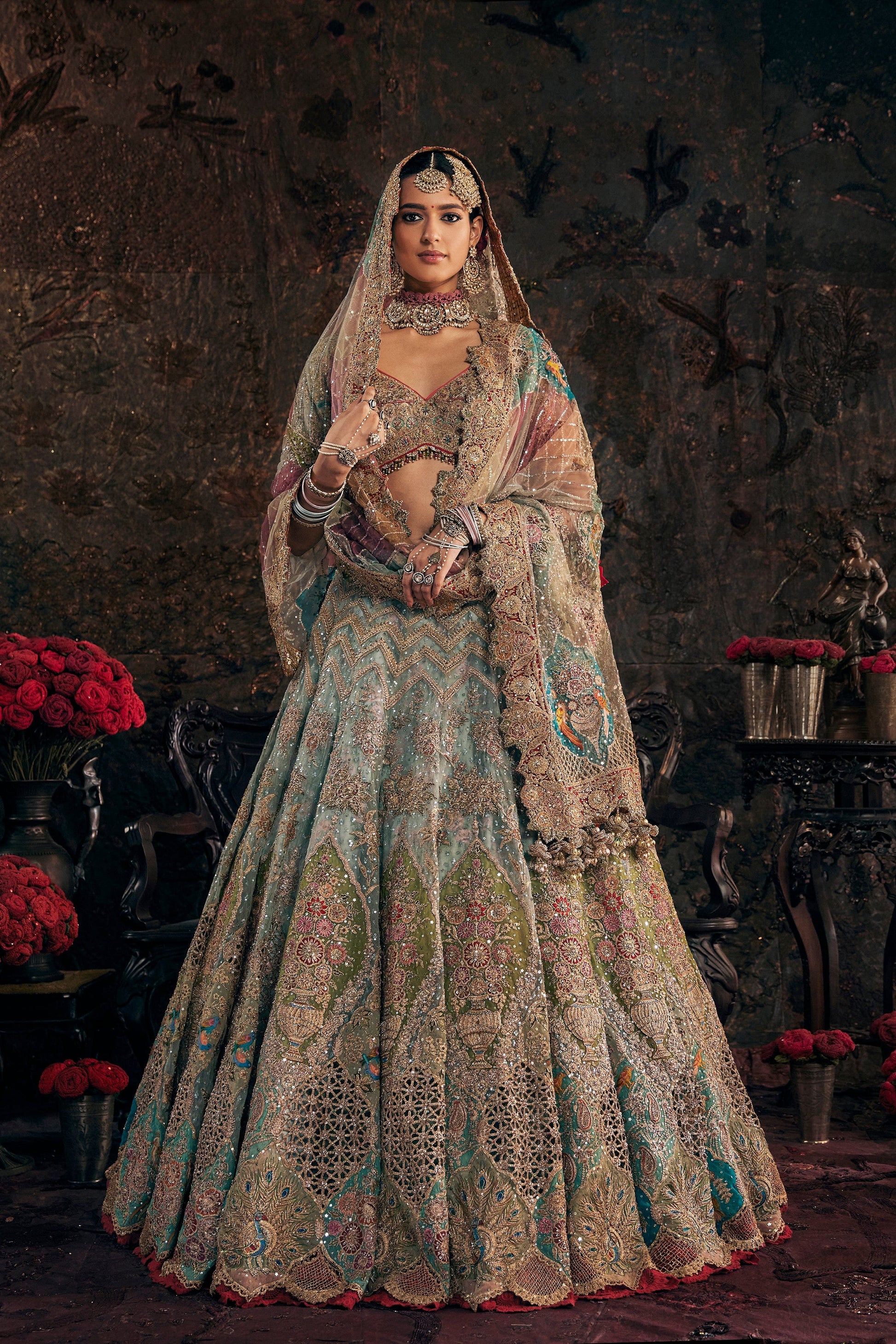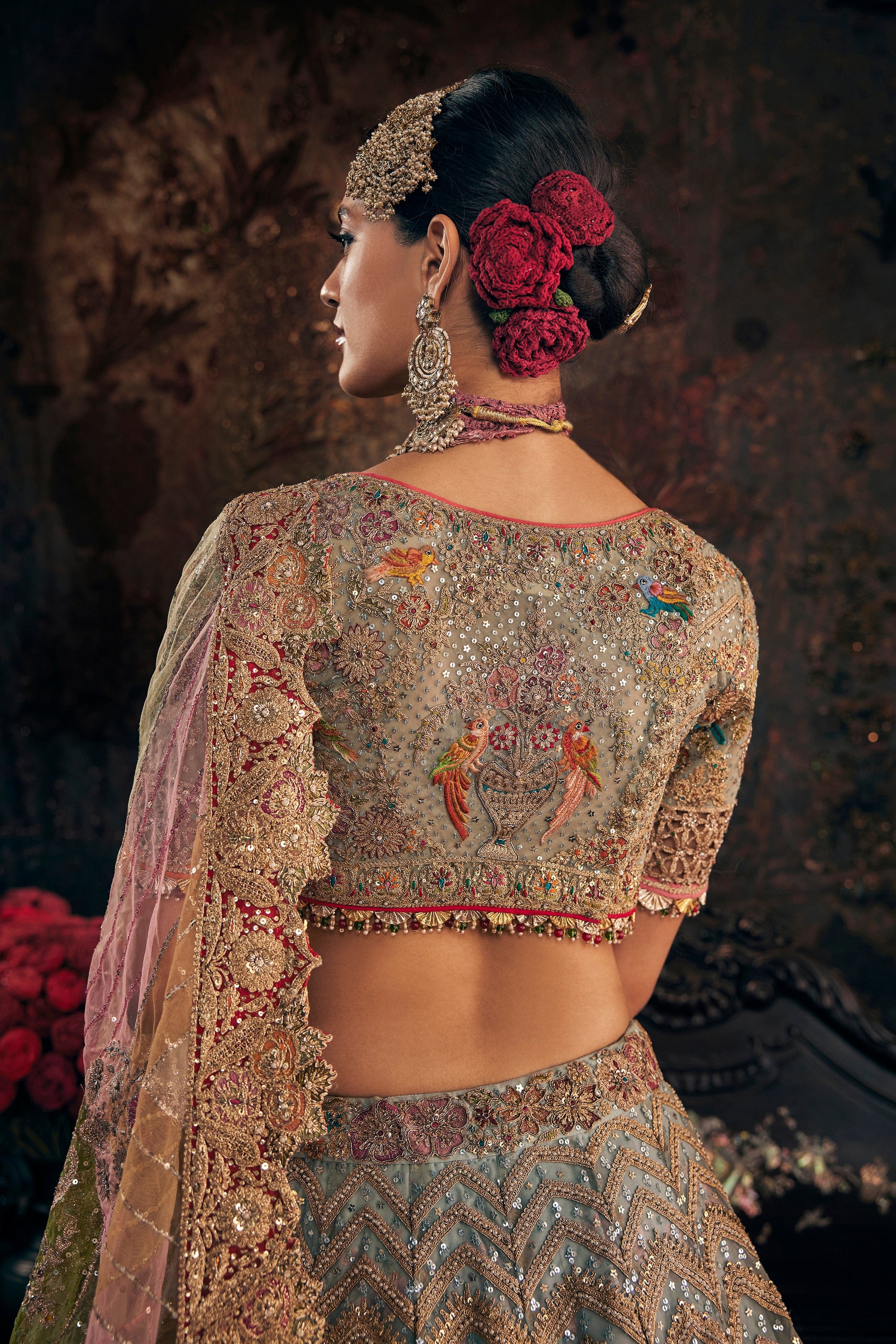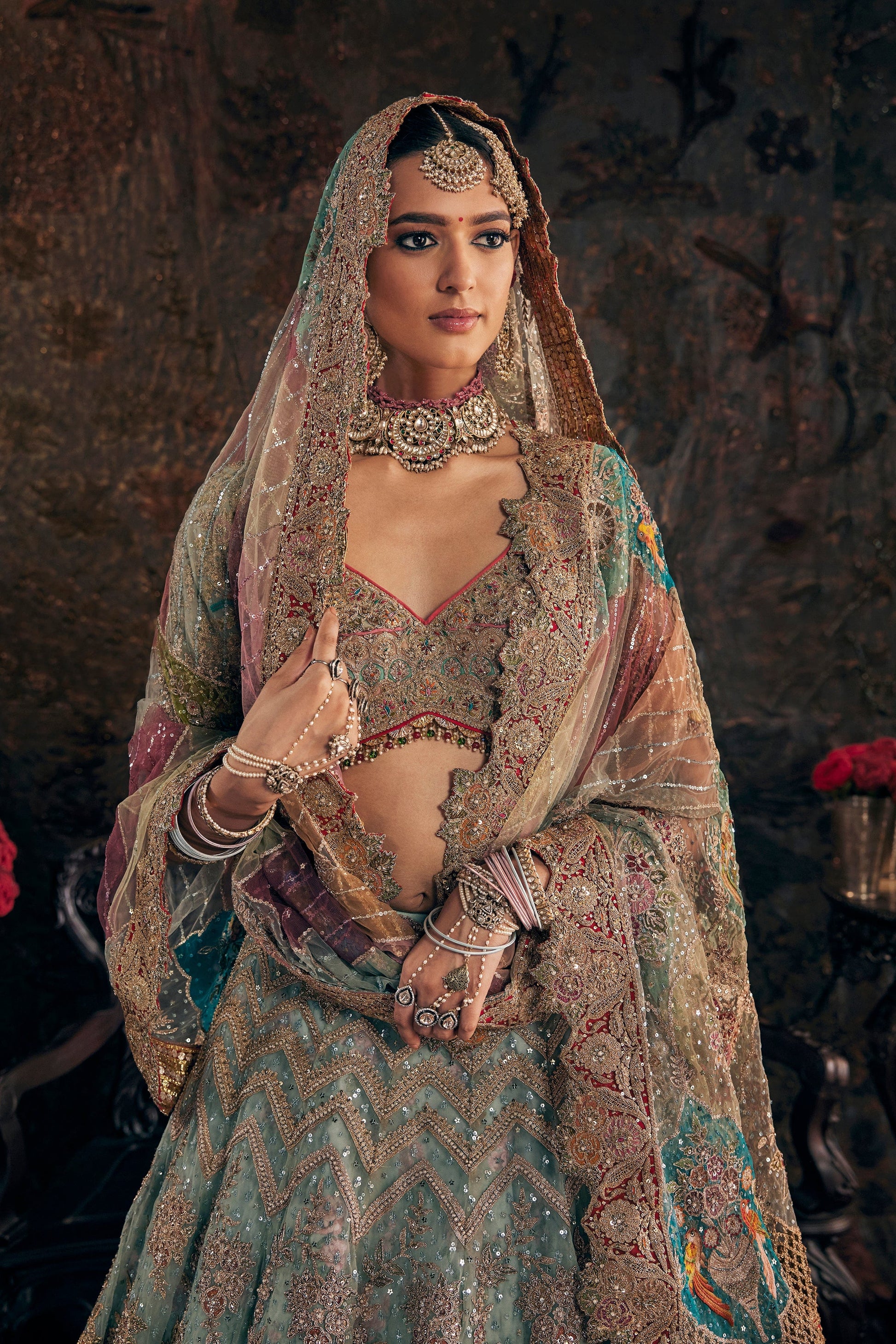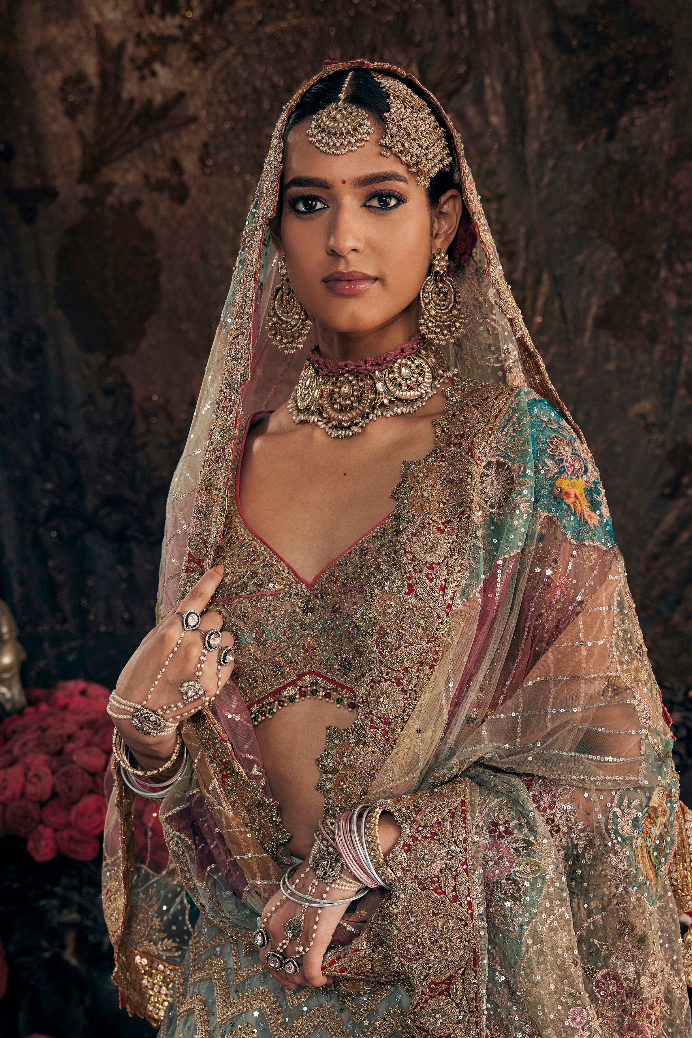 A frosted blue tulle lehenga. The skirt features floral and avian artworks gleaned from Victorian era textiles and Mughal inlay work. It is paired with an embroidered choli and a multi-hued tulle dupatta.