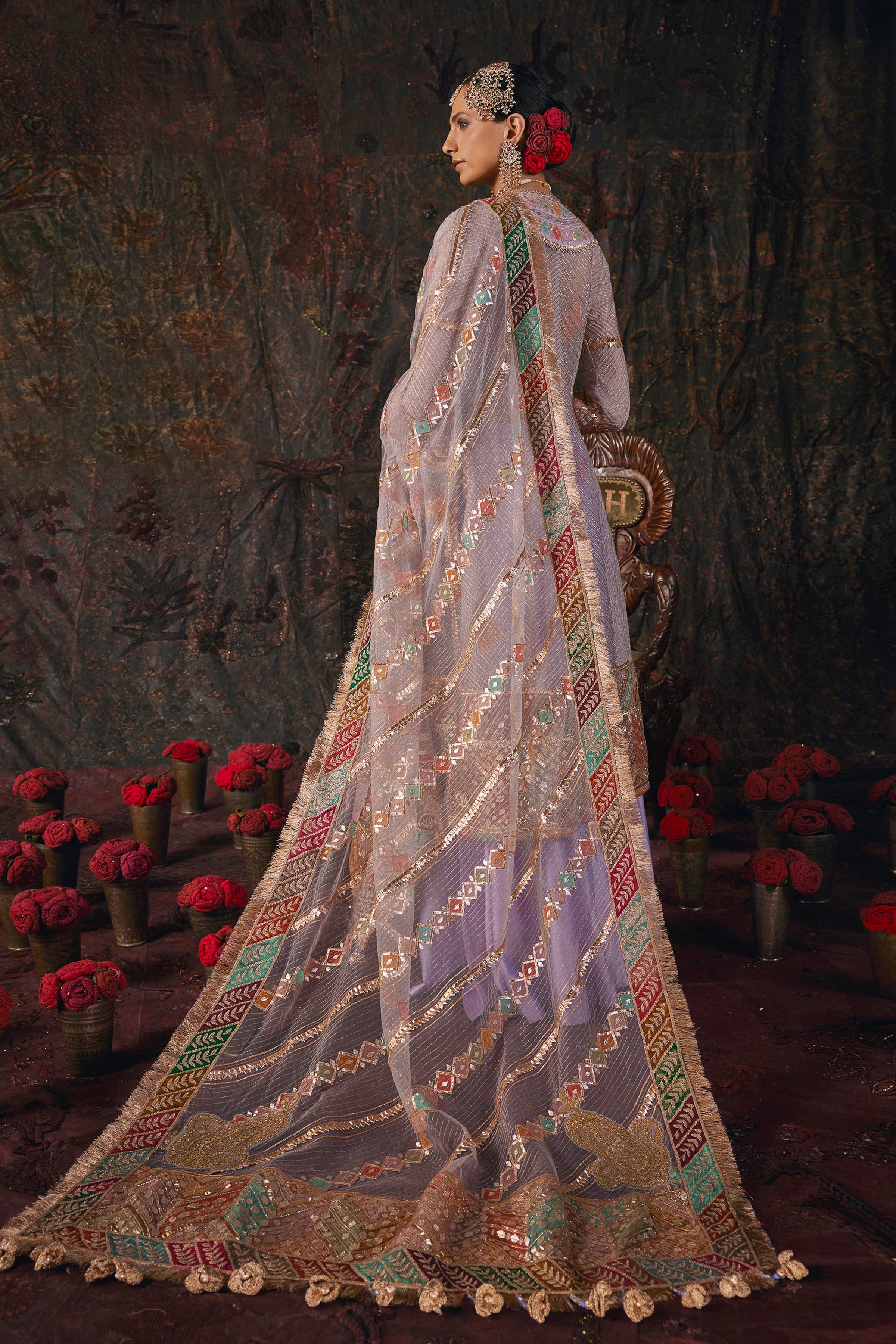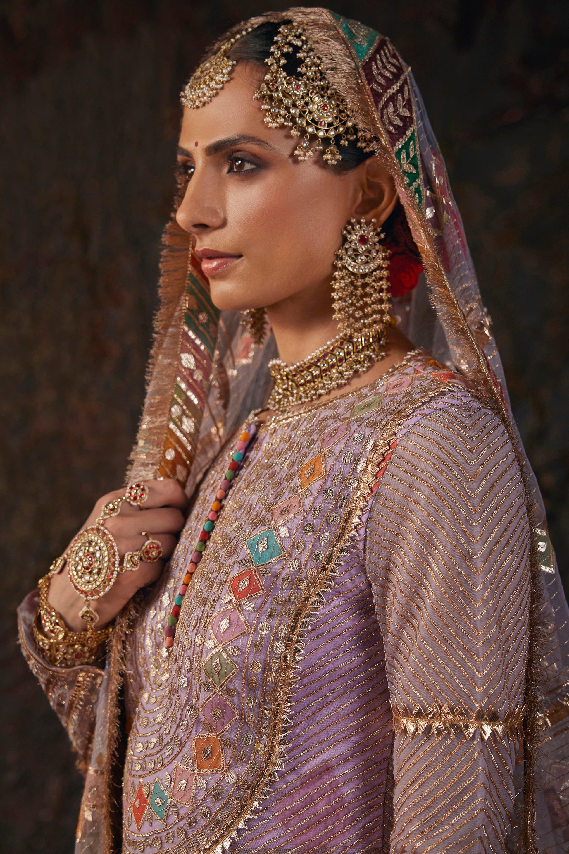 A frosted lilac kurti paired with a silk sharara. The set features sucha gota textures derived from sacred geometry. The set is paired with a diaphanous tulle dupatta.