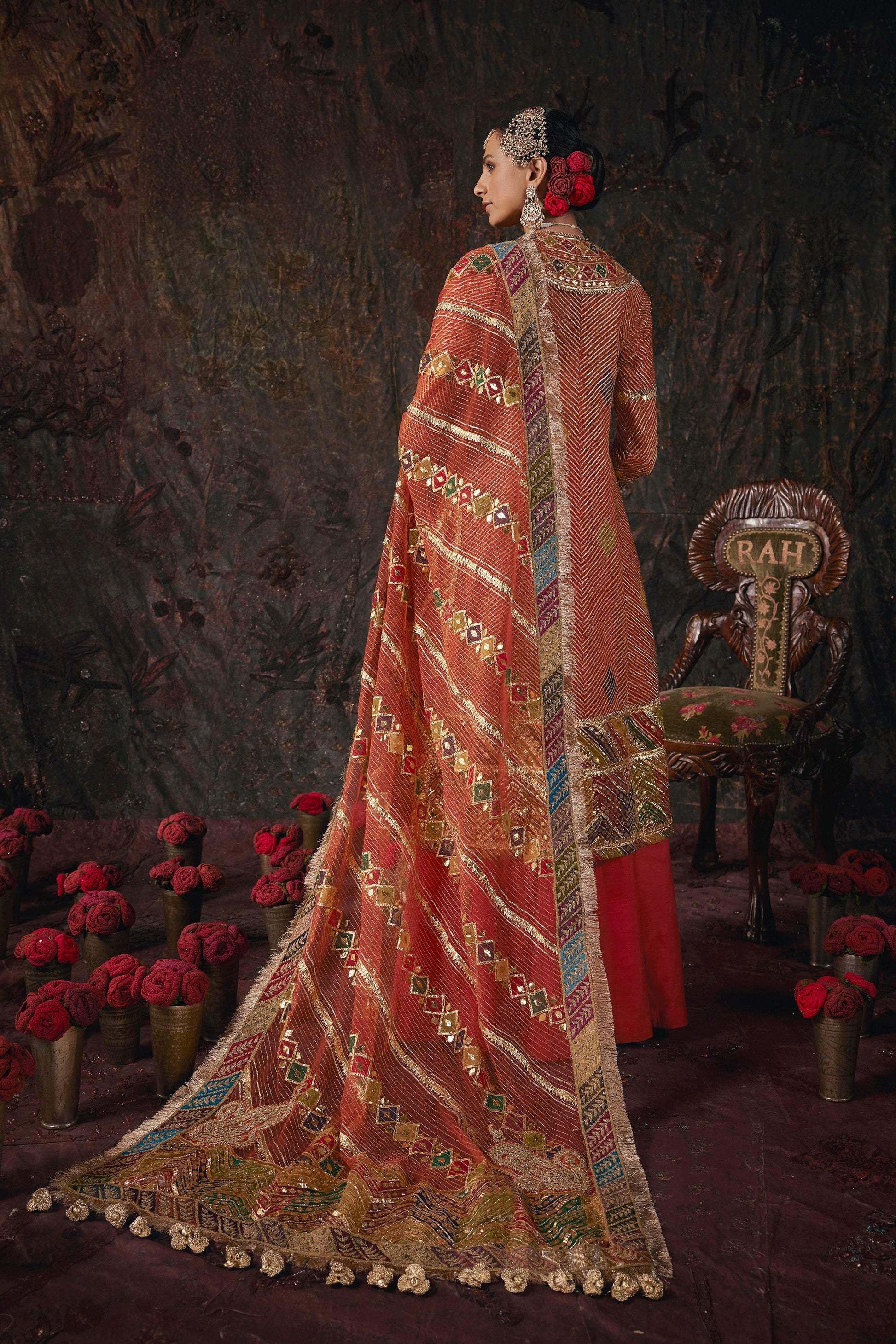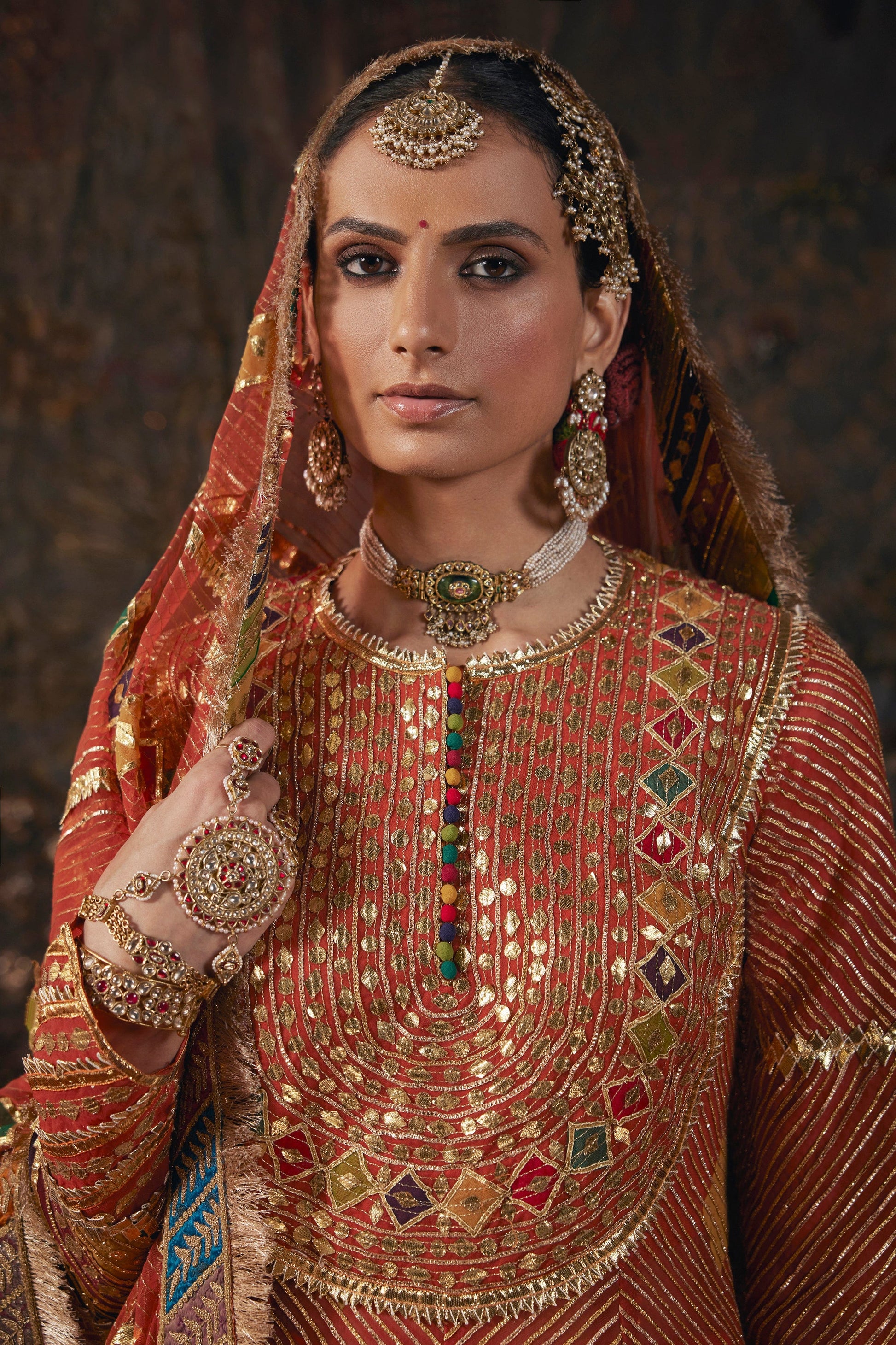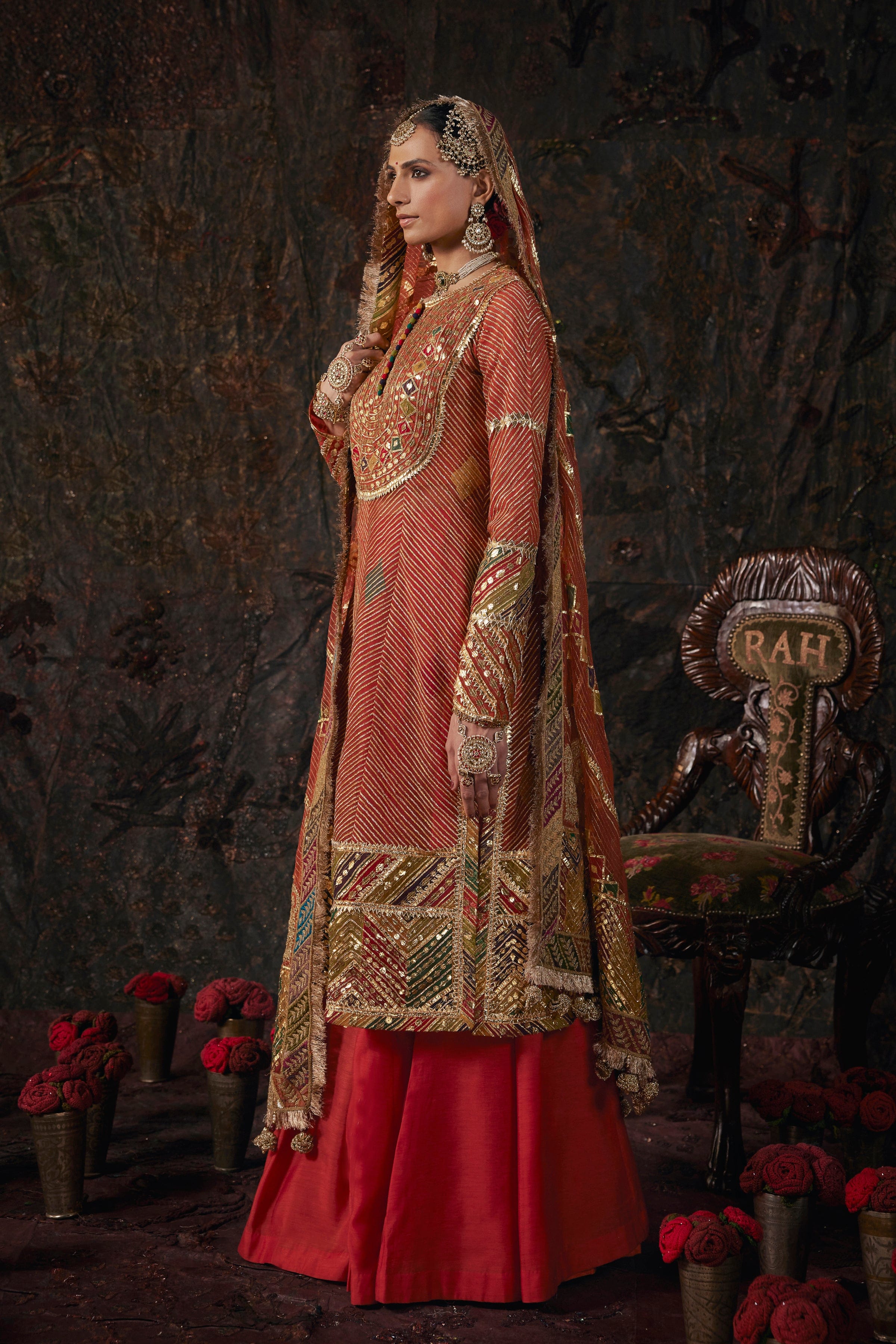 A frosted rust kurti paired with a silk sharara. The set features sucha gota textures derived from sacred geometry. The set is paired with a diaphanous tulle dupatta.