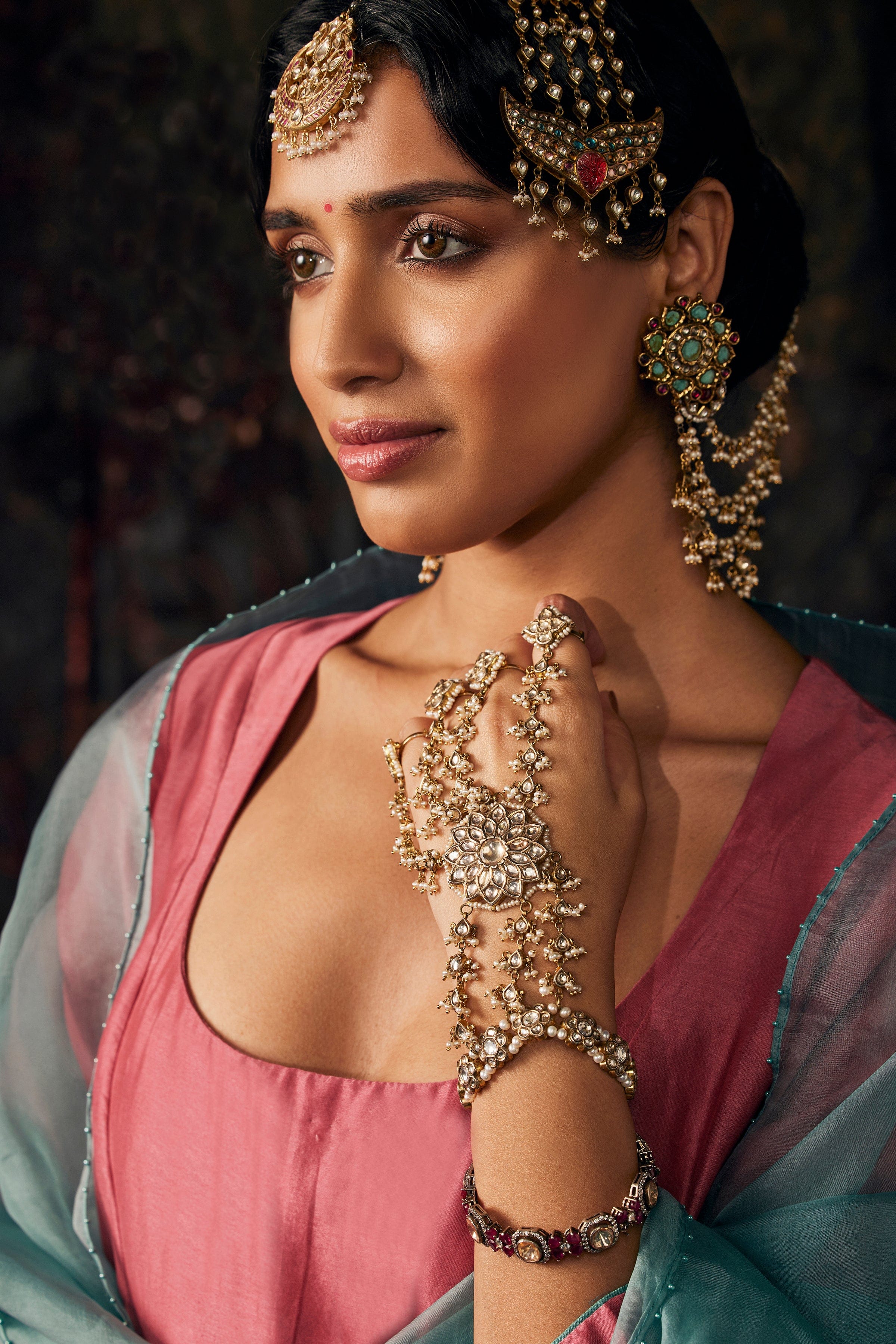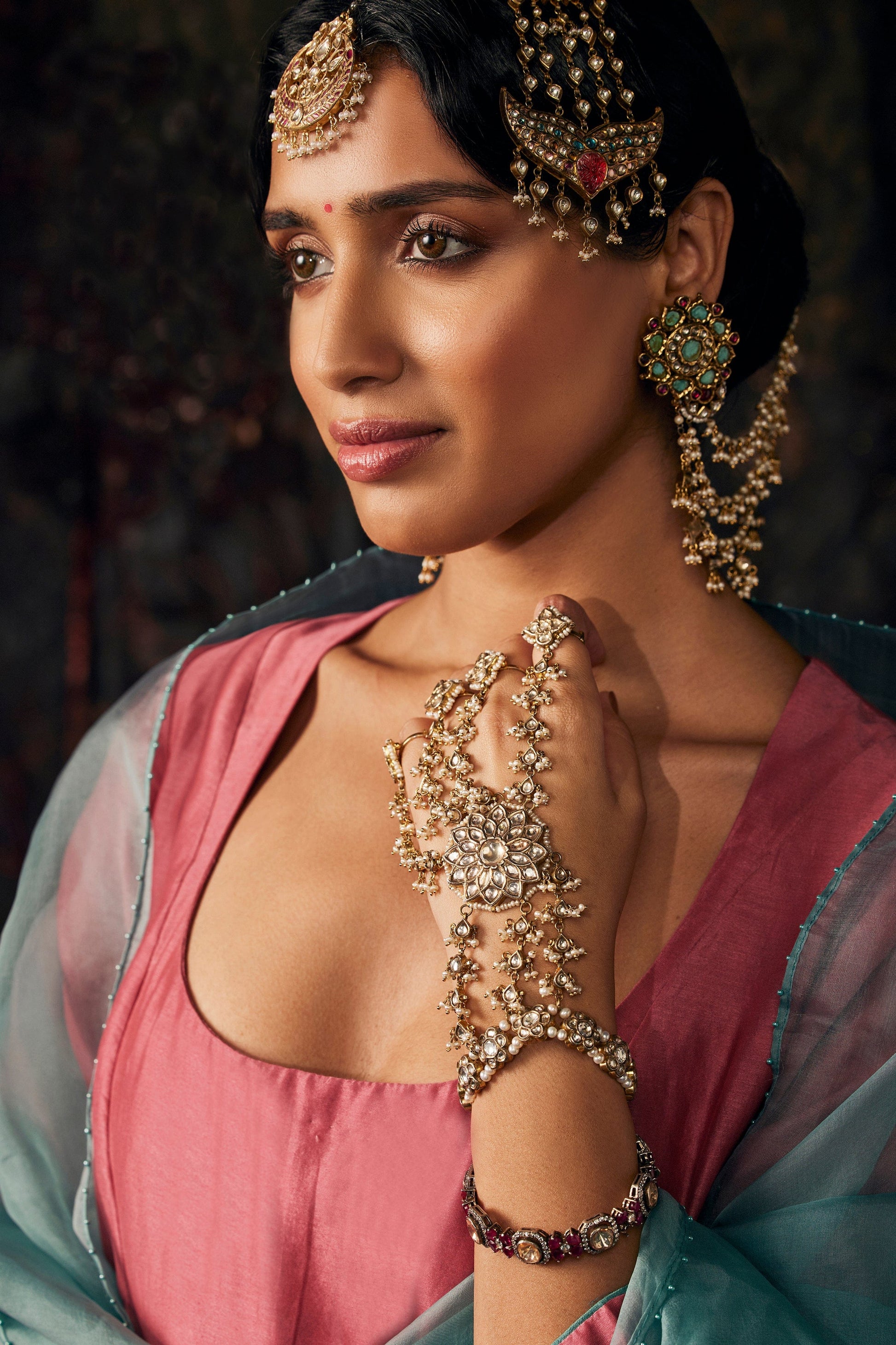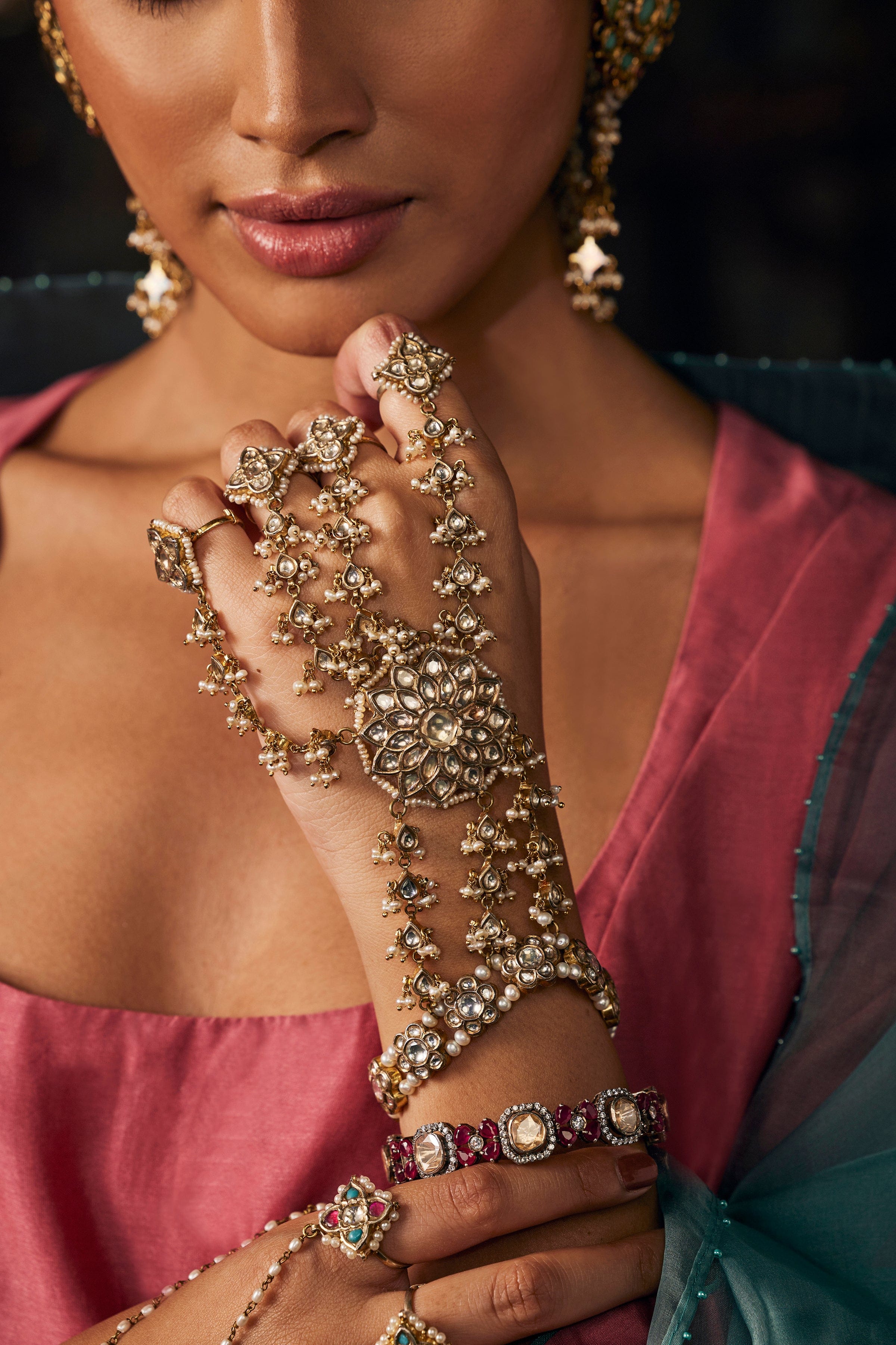 4 finger adjustable rings polki hath phool in gold infused 92.5 silver. Comes with a bracelet lock for closure.
