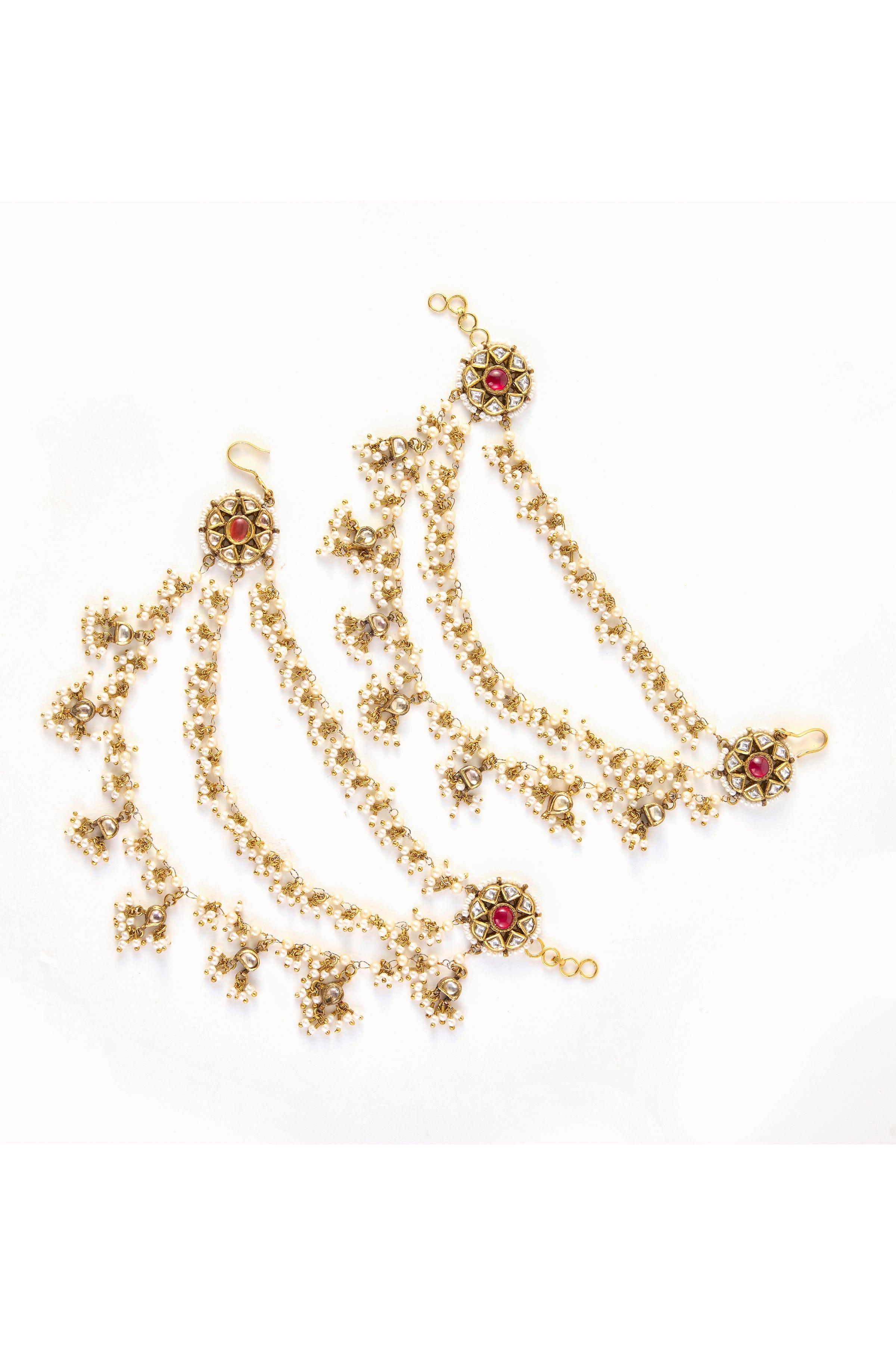 3 layer pearl Kaan chain in gold infused 92.5 silver with polki biyas at bottom layer and ruby flowers.
