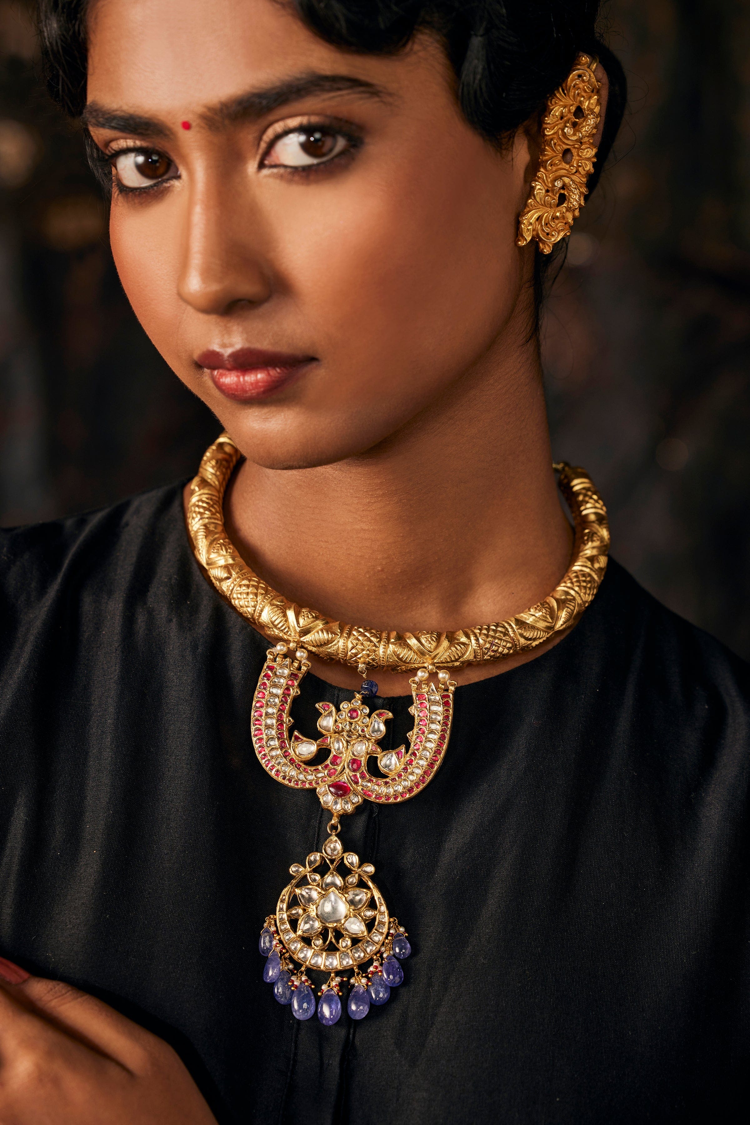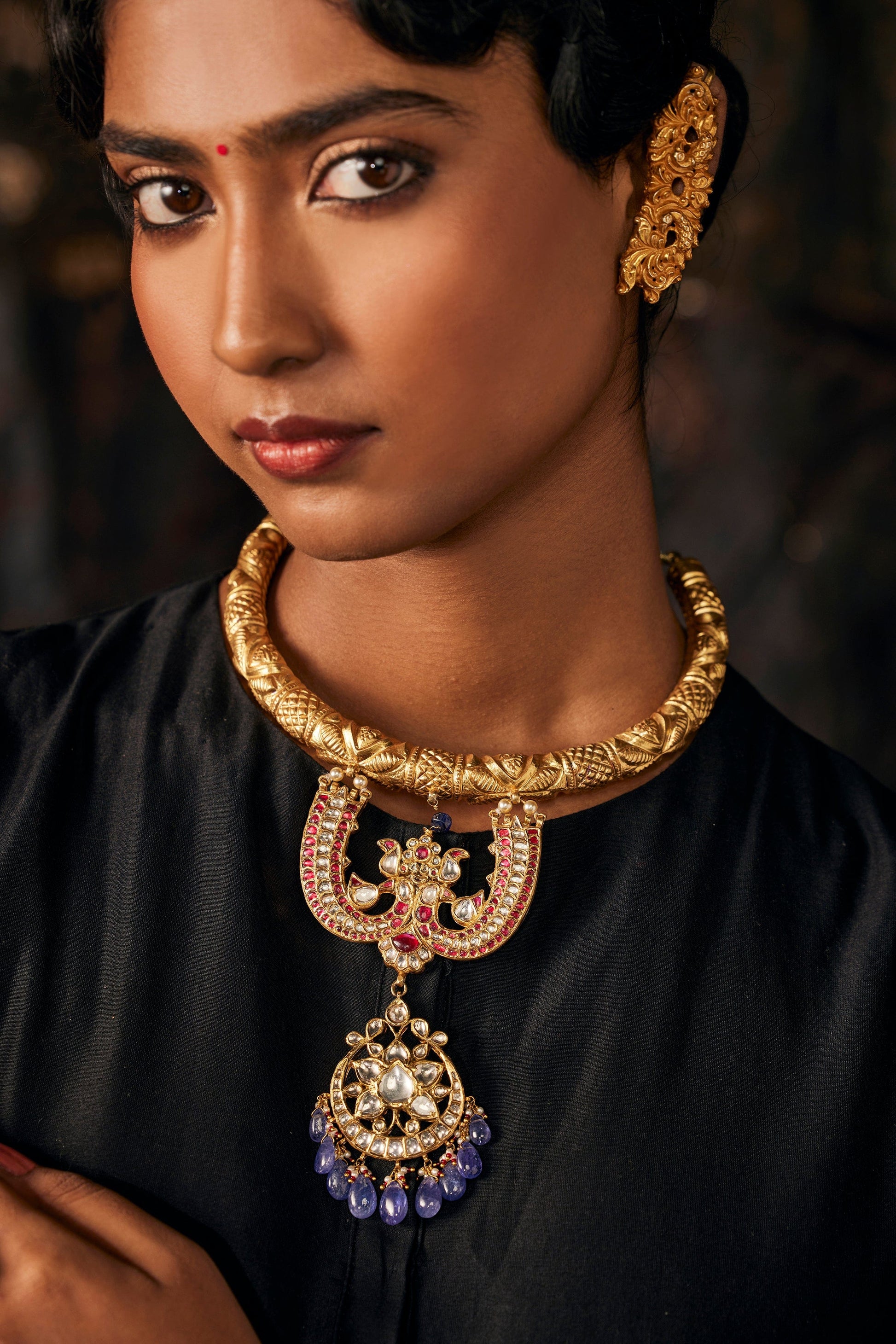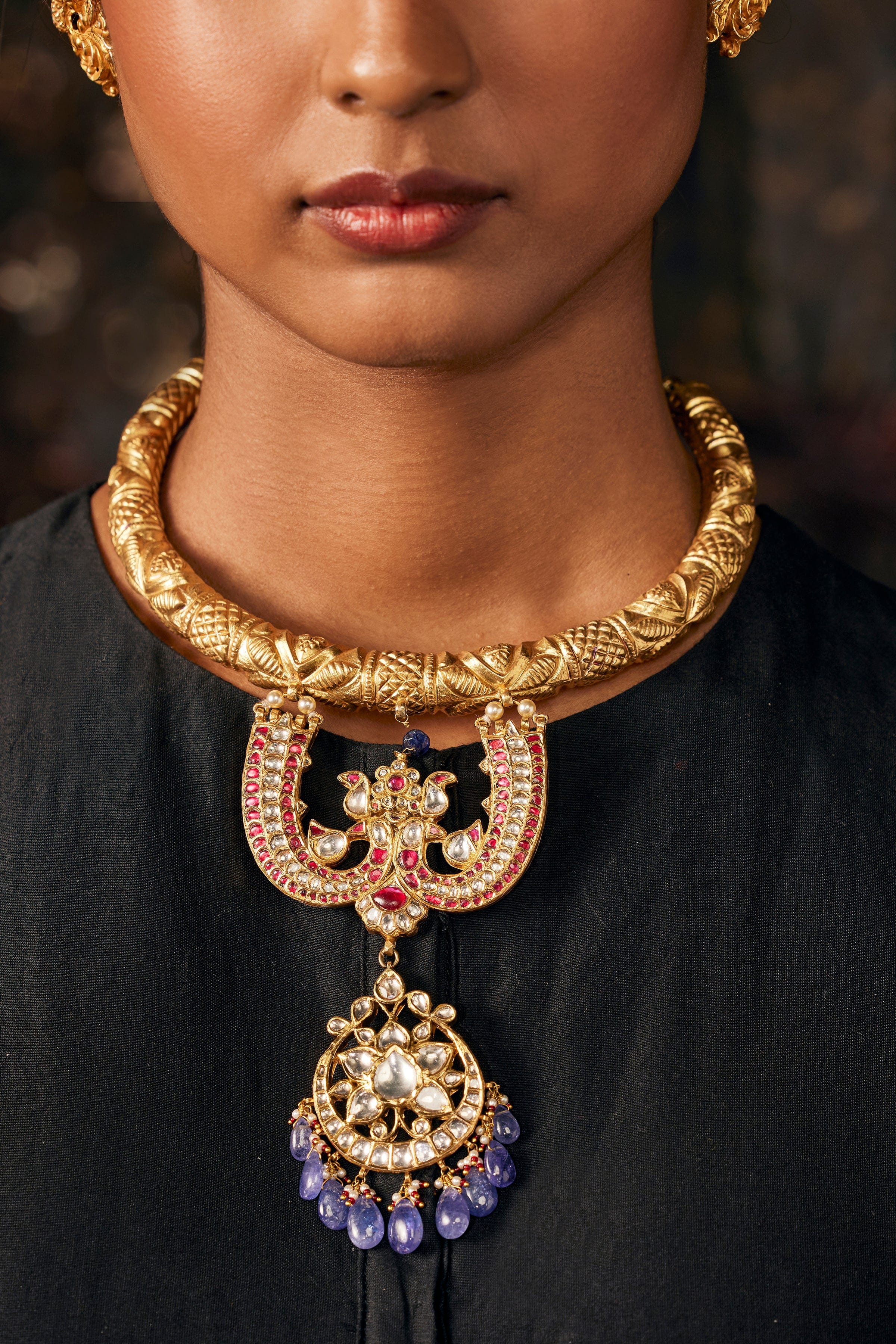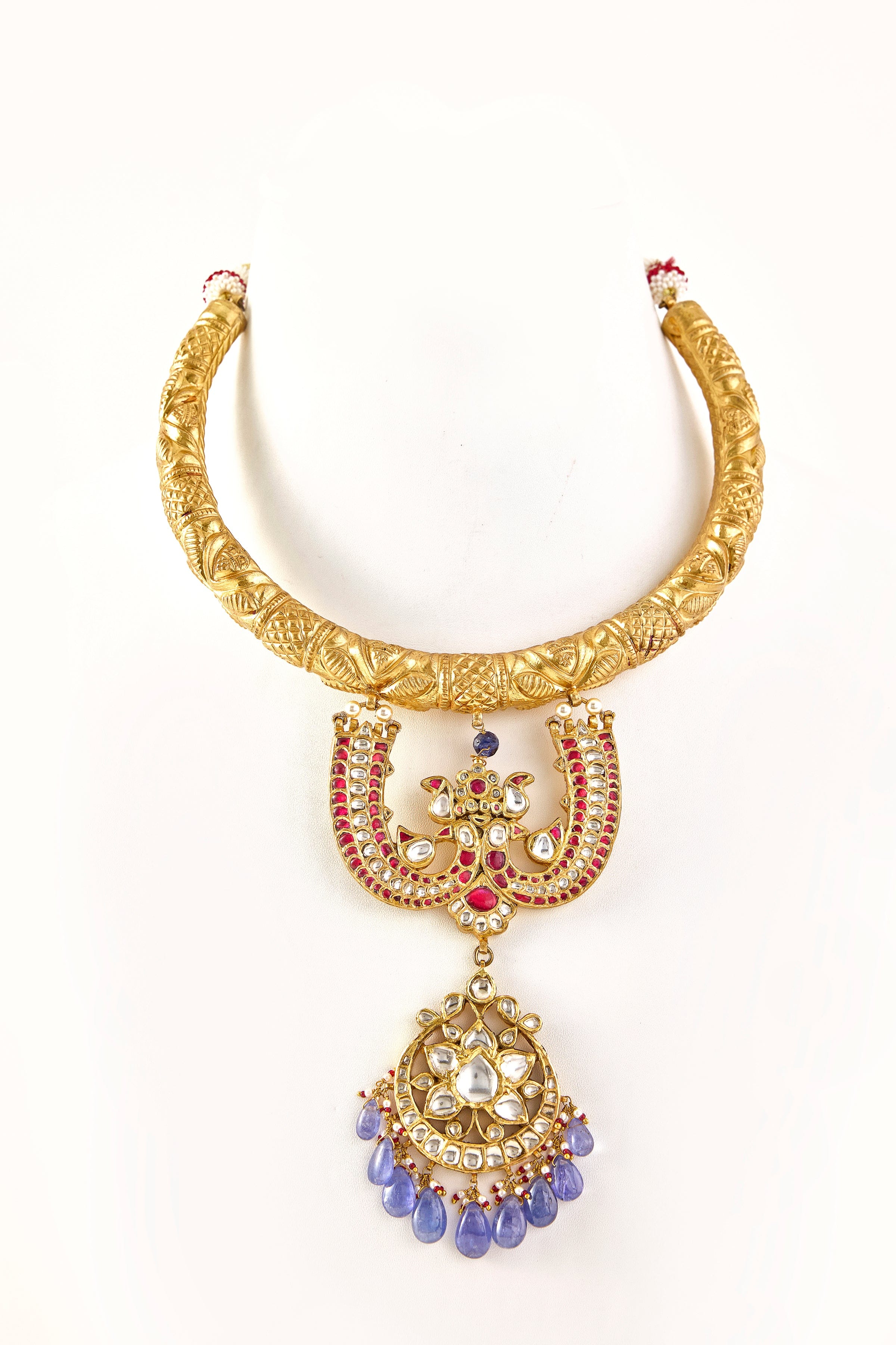 Chand hassli in gold infused 92.5 silver with rubies, polki and stringing in tanzanite. Comes with a traditional indian dori closure.