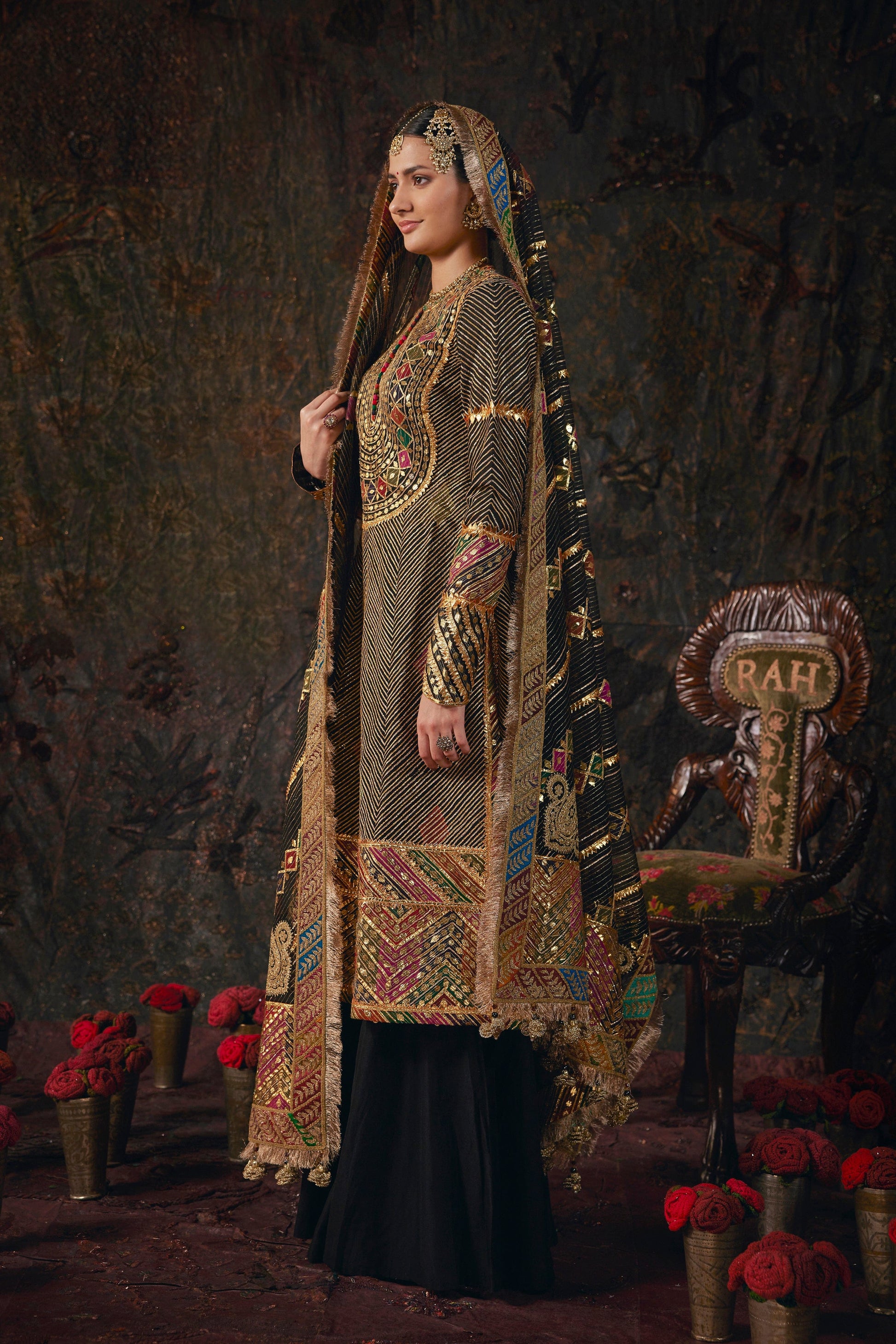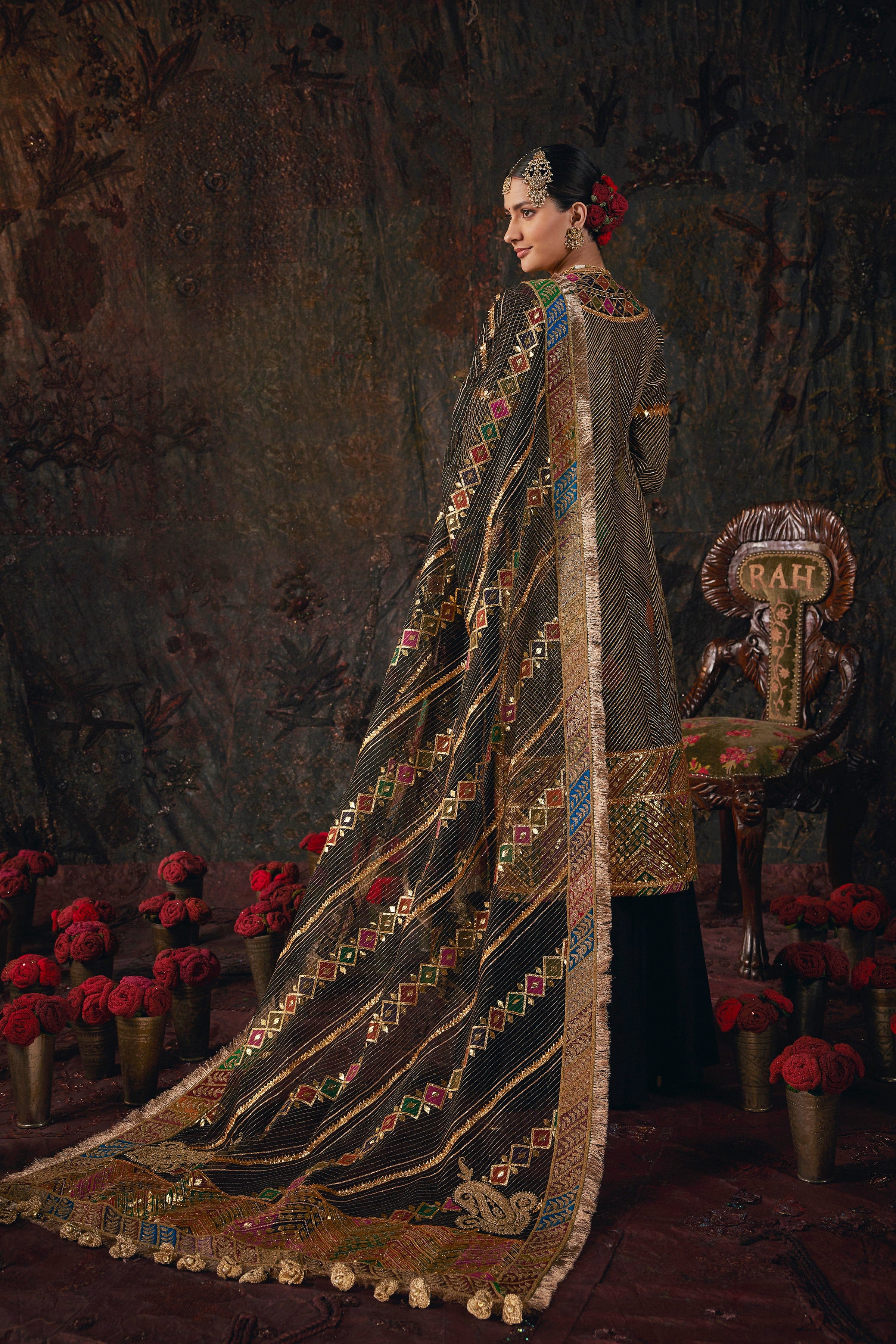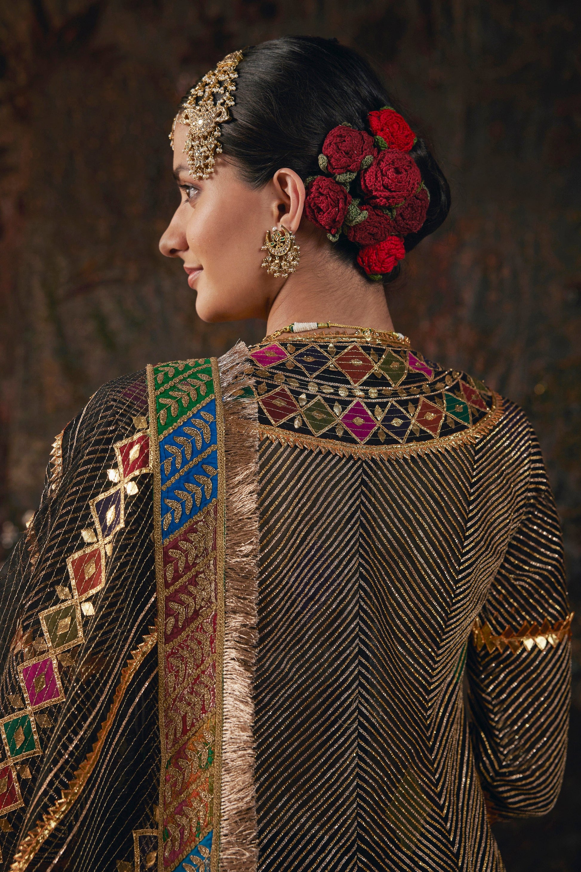 An inky black kurti paired with a silk sharara. The set features sucha gota textures derived from sacred geometry. The set is paired with a diaphanous tulle dupatta.