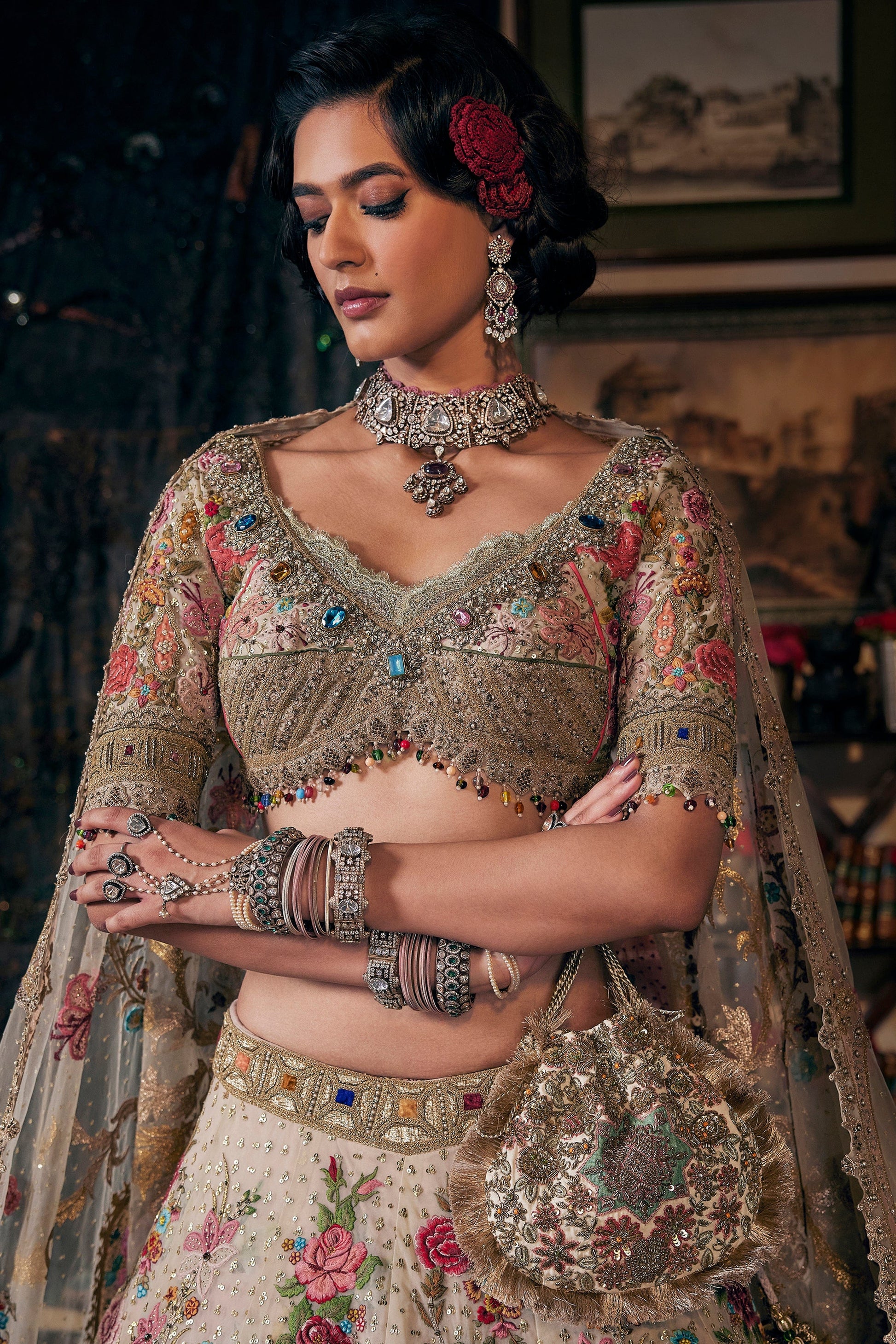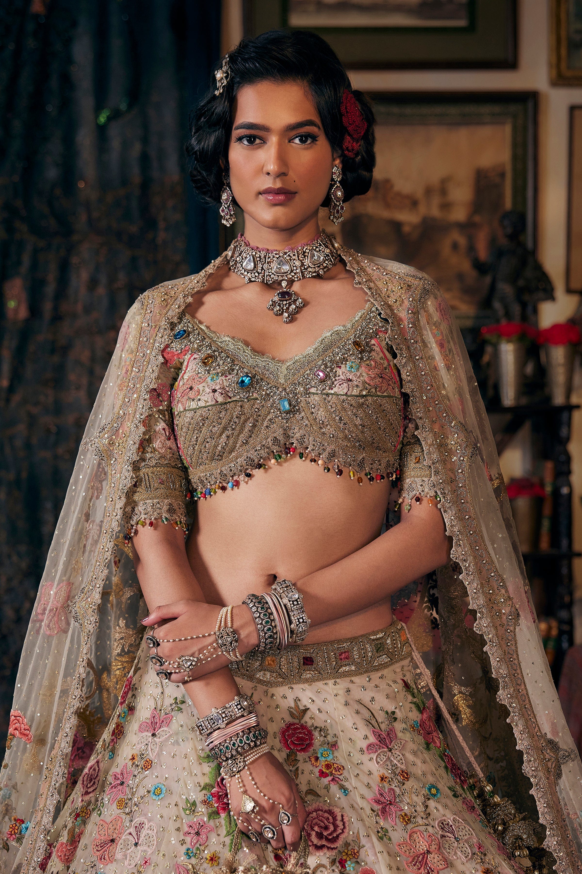 An ivory tulle lehenga. The vivid skirt is an interpretation of an antique Suzani textile as well as Persian, Palampore and Chinoiserie textile fragments from the RAH Archive , amalgamated and reimagined through various techniques. The skirt features a surreal city-scape surrounded by an enchanted forest brimming with multi-hued flowers and two eternal wanderers- a young girl and boy, riding towards each other on top of magical stag steeds. The motifs are rendered using a special form of appliqué, marodi ka kaam, resham zardozi, kasab, dabka, naqshi, sequins, pearls and semi-precious stones. It is paired with an embroidered choli featuring a bejeweled neckline and the look is completed with a multi-hued tulle dupatta with floral organza inserts.