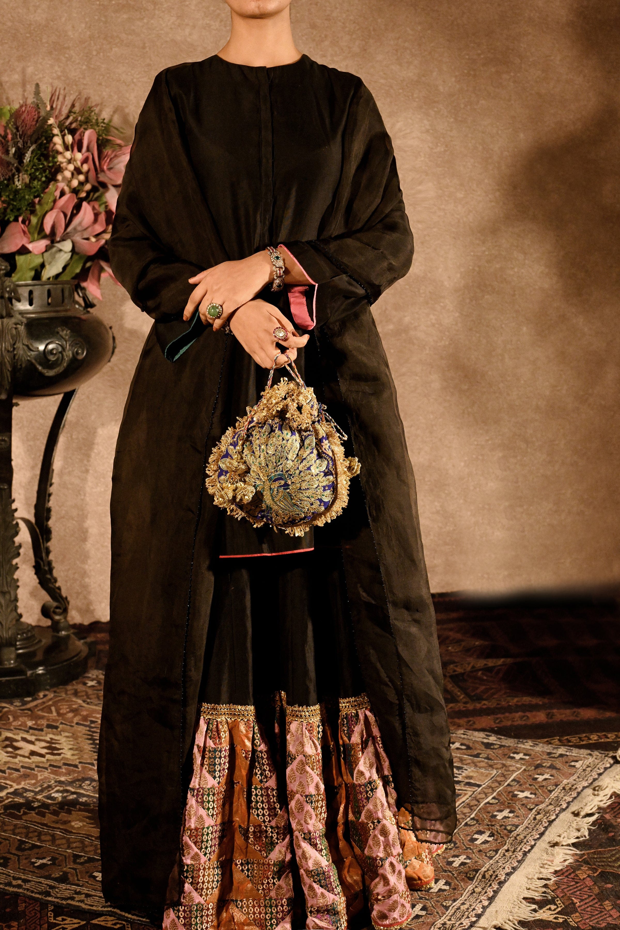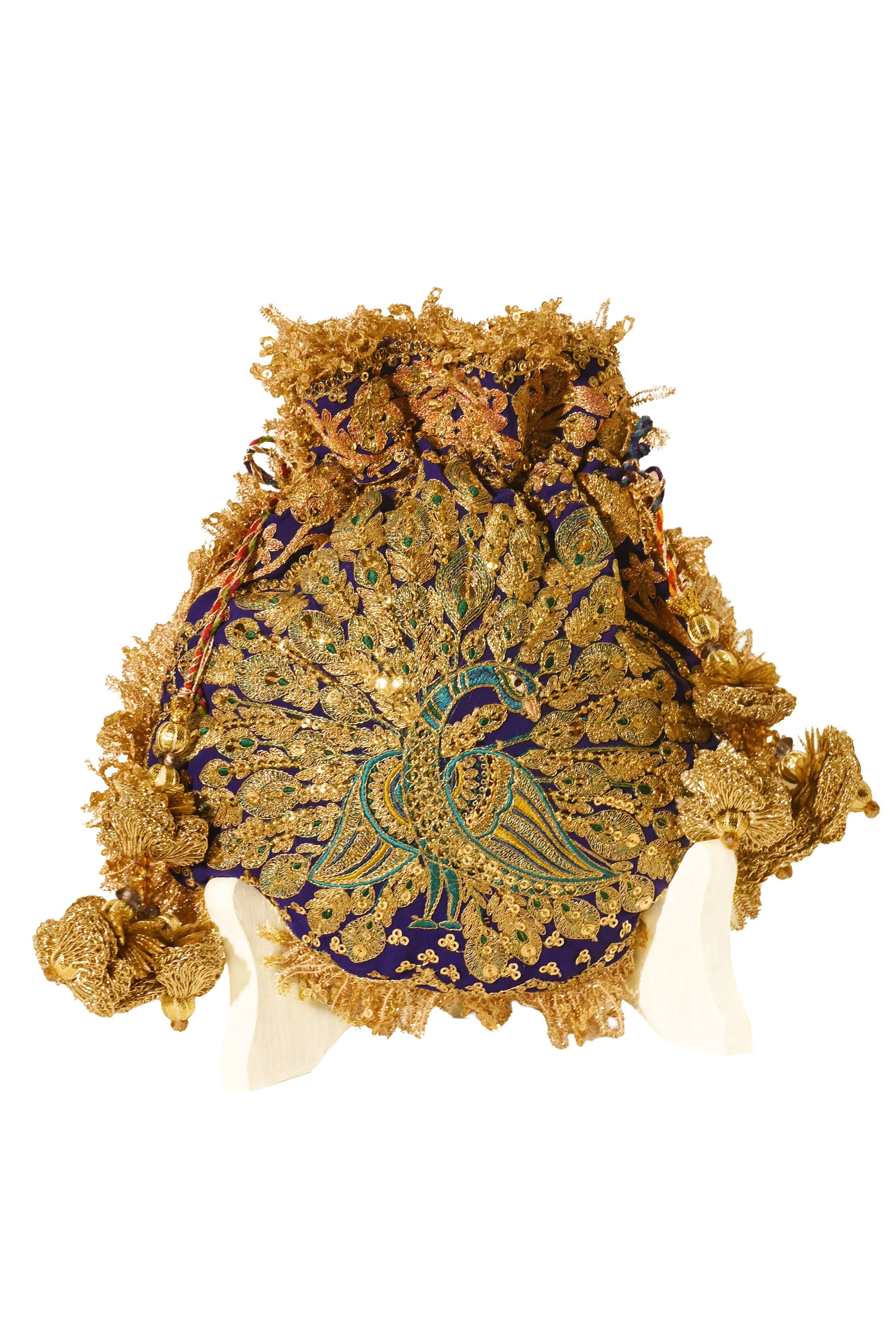 amuni Morzaar Potli is crafted on a georgette base, embroidered in rich gold and silver tones. This potli features a fanned peacock motif. The embroideries are gleaned from Mughal era artefacts, inlay work and architectural details and the potli is edged with an old-world kiran and its drawstrings are finished with handmade crochet flower tassels.