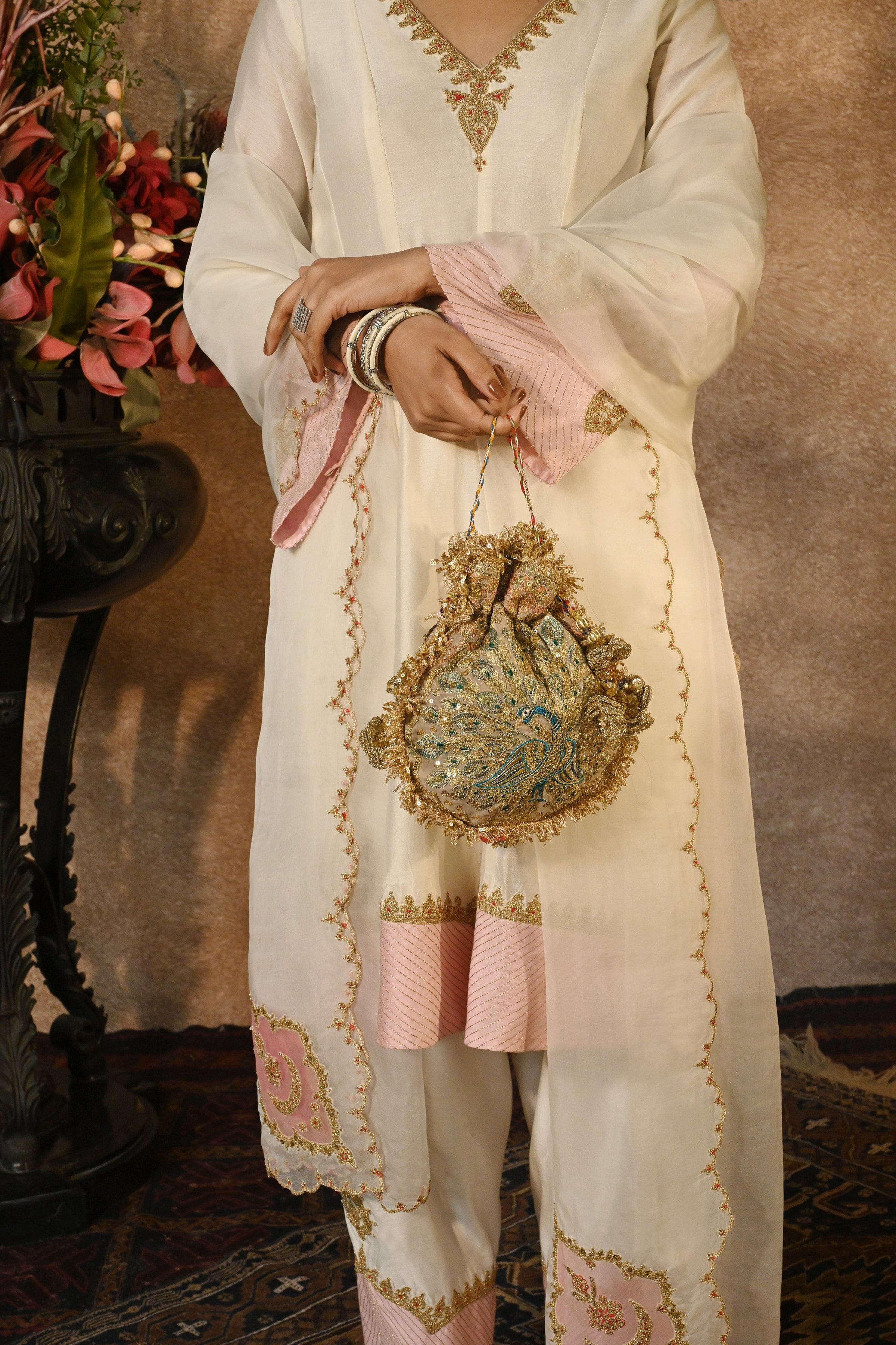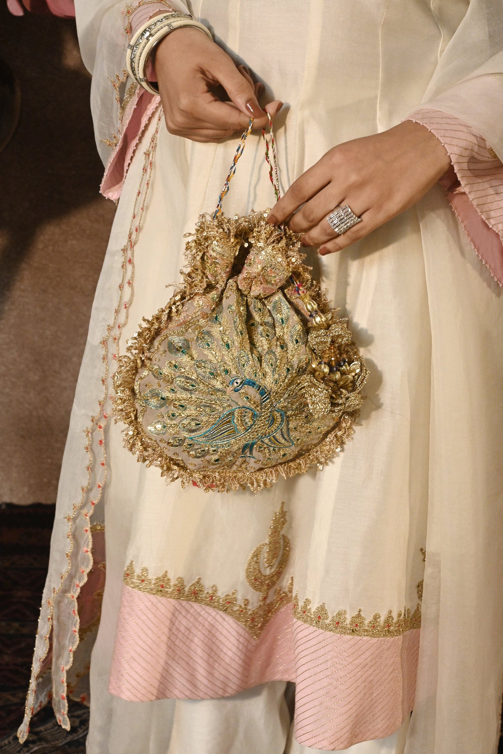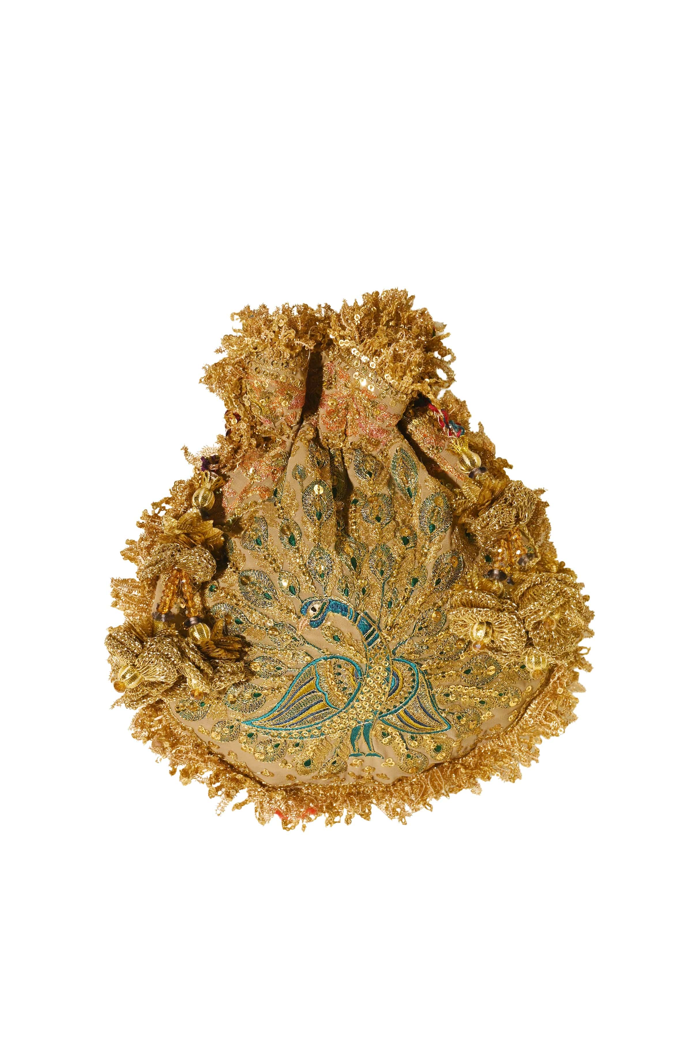 Khaki Morzaar Potli is crafted on an eathy taupe georgette base, embroidered in rich gold and silver tones. This potli features a fanned peacock motif. The embroideries are gleaned from Mughal era artefacts, inlay work and architectural details and the potli is edged with an old-world kiran and its drawstrings are finished with handmade crochet flower tassels.