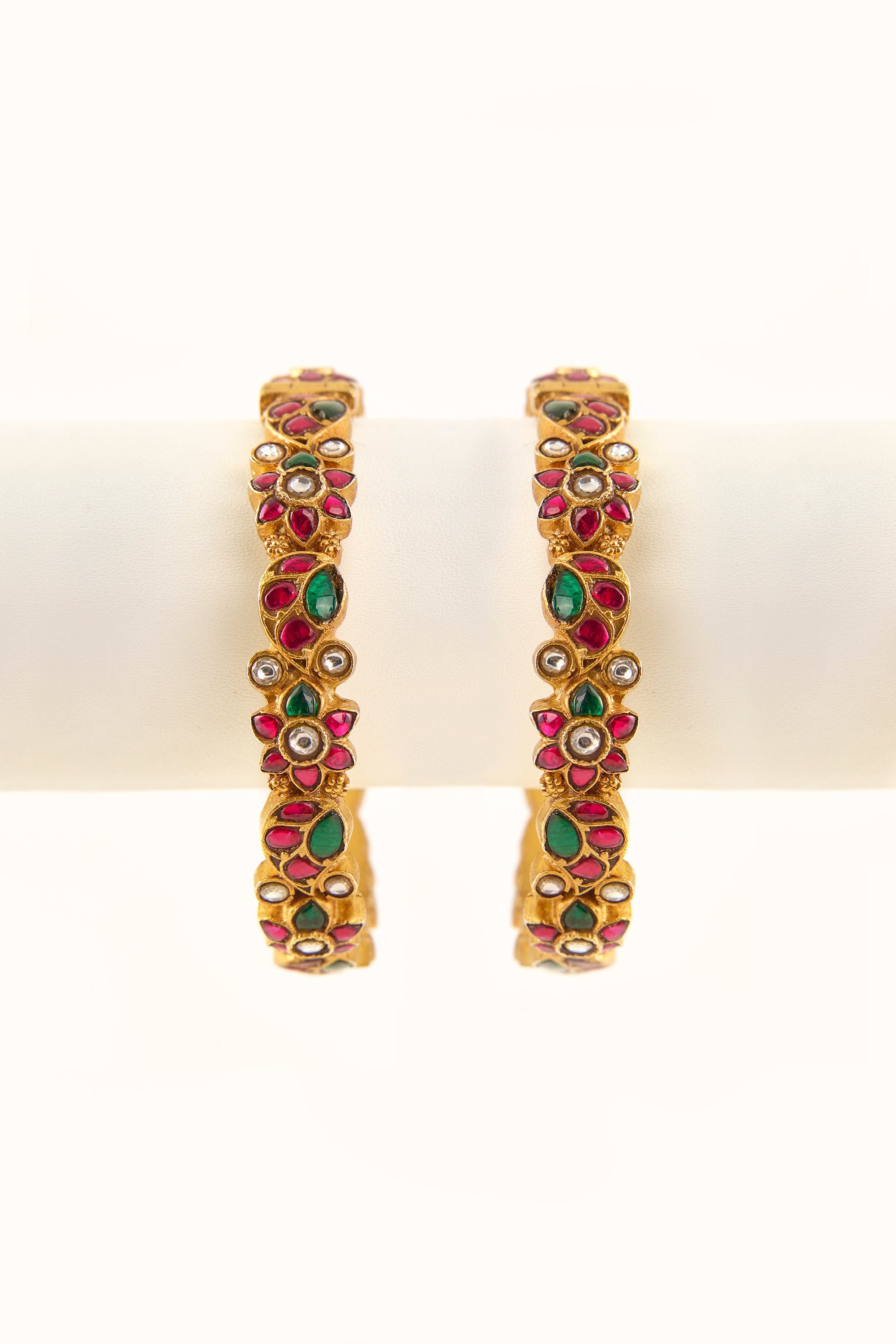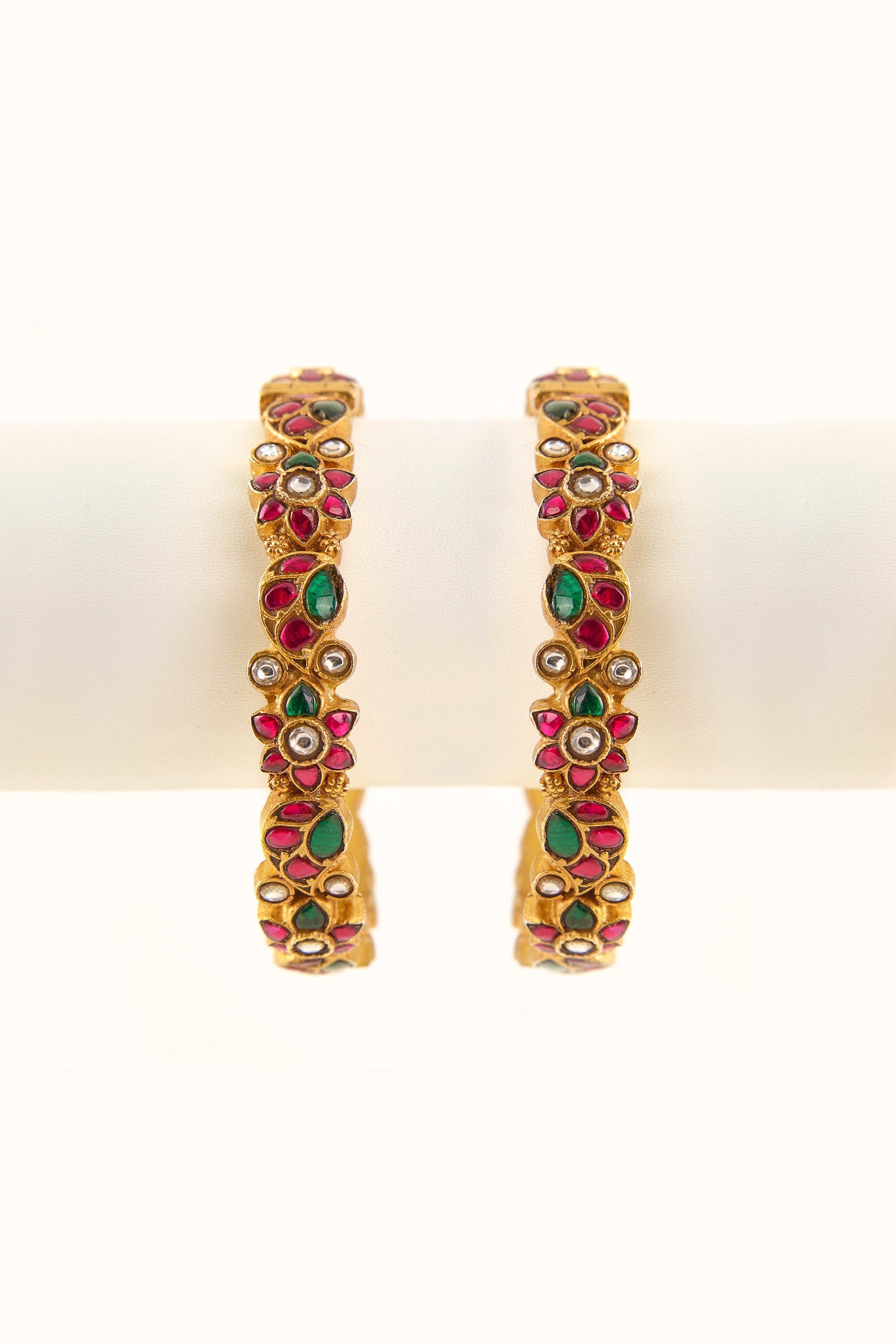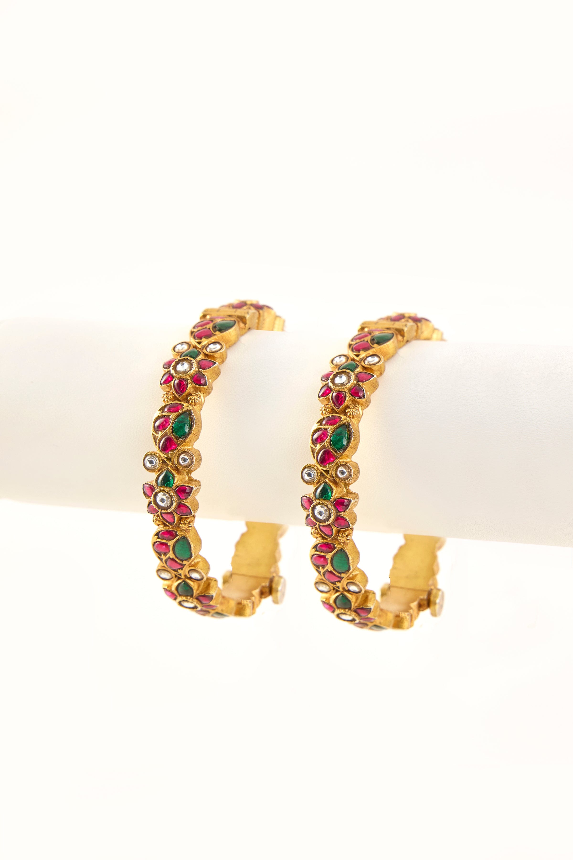 South style ruby and emerald kada in gold infused 92.5 silver with an opening and lock for easy wear.