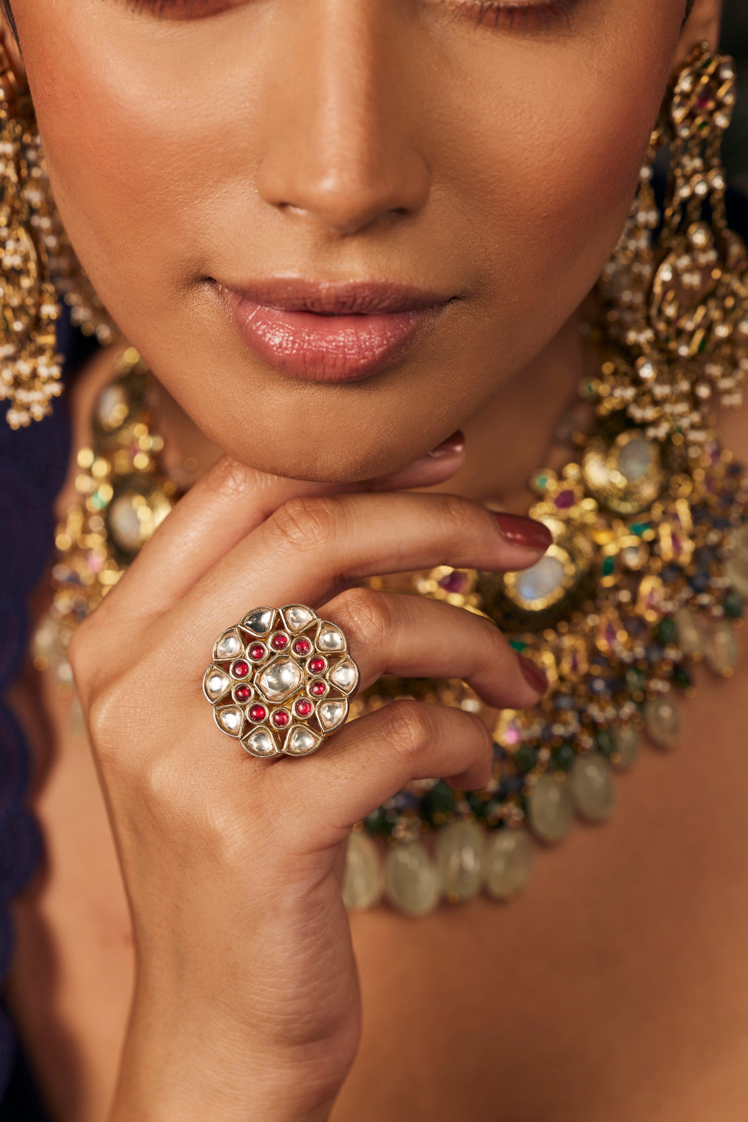 Polki ruby flower ring in gold infused 92.5 silver with adjustable band.