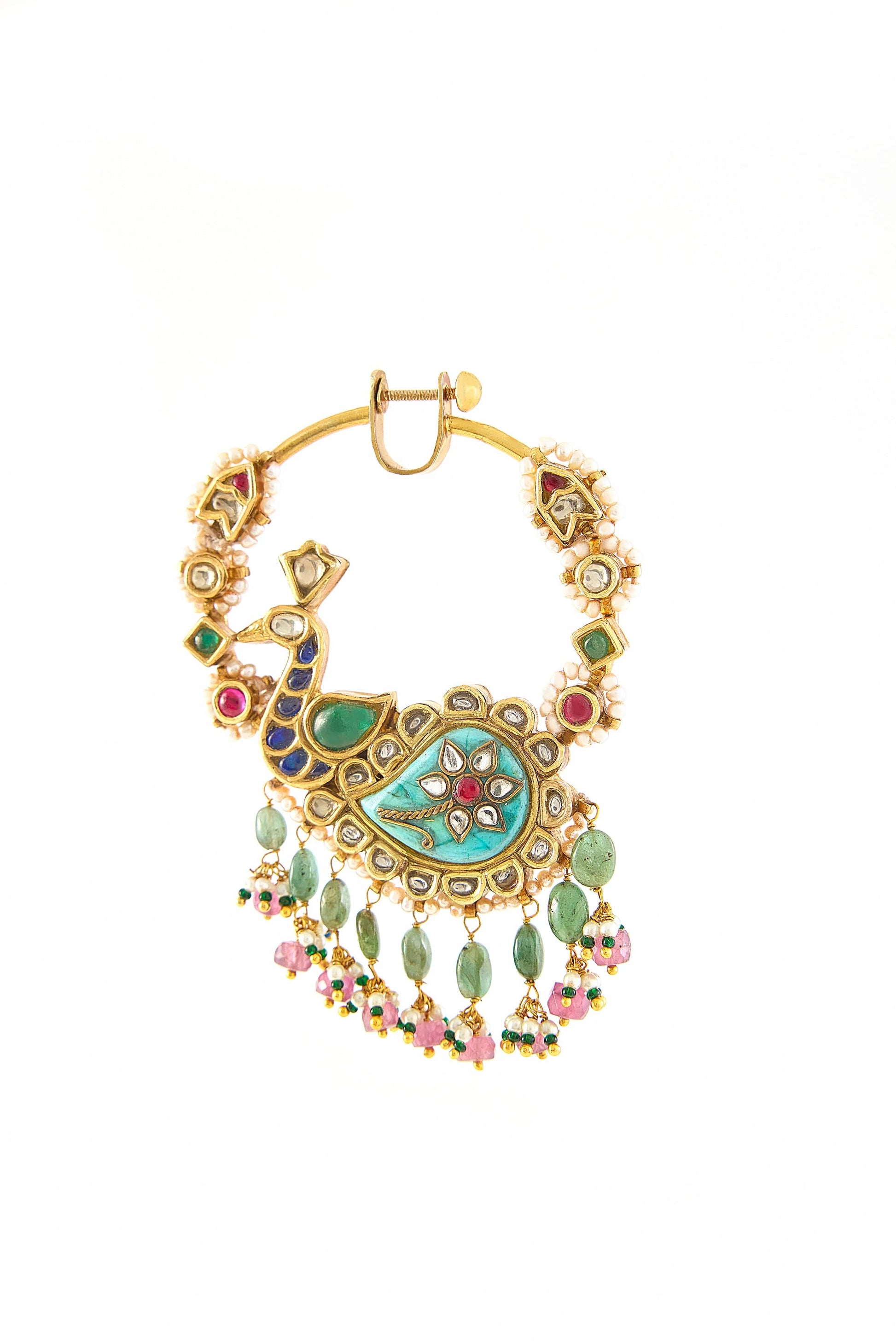 Traditional bridal peacock nath with ferozas, emeralds, sapphires, polki and stringing in aventurines and rose quartz in gold infused 92.5 silver.