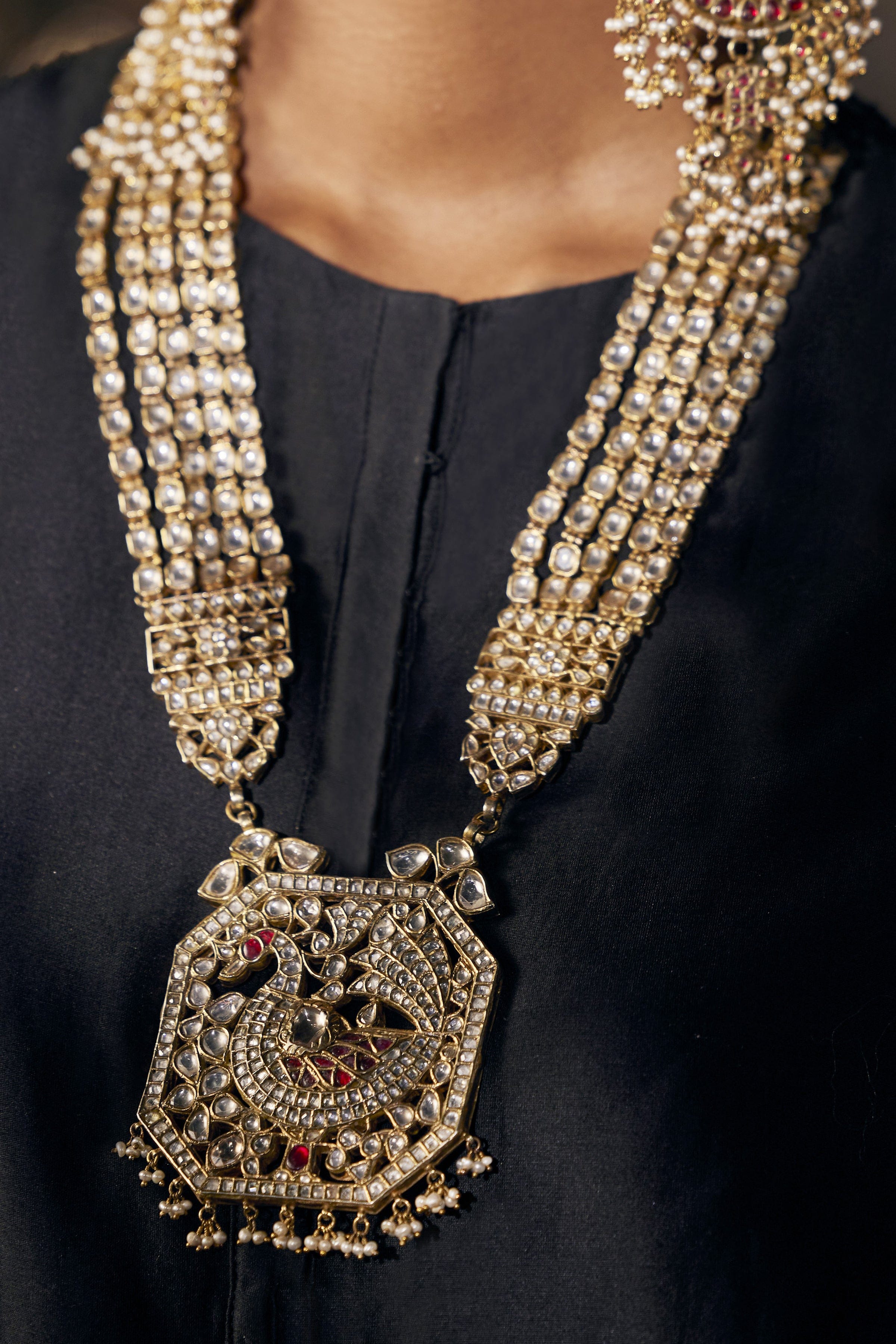 Mor polki jadau Rani haar in gold infused silver with rubies. Come with a traditional Indian dori closure.