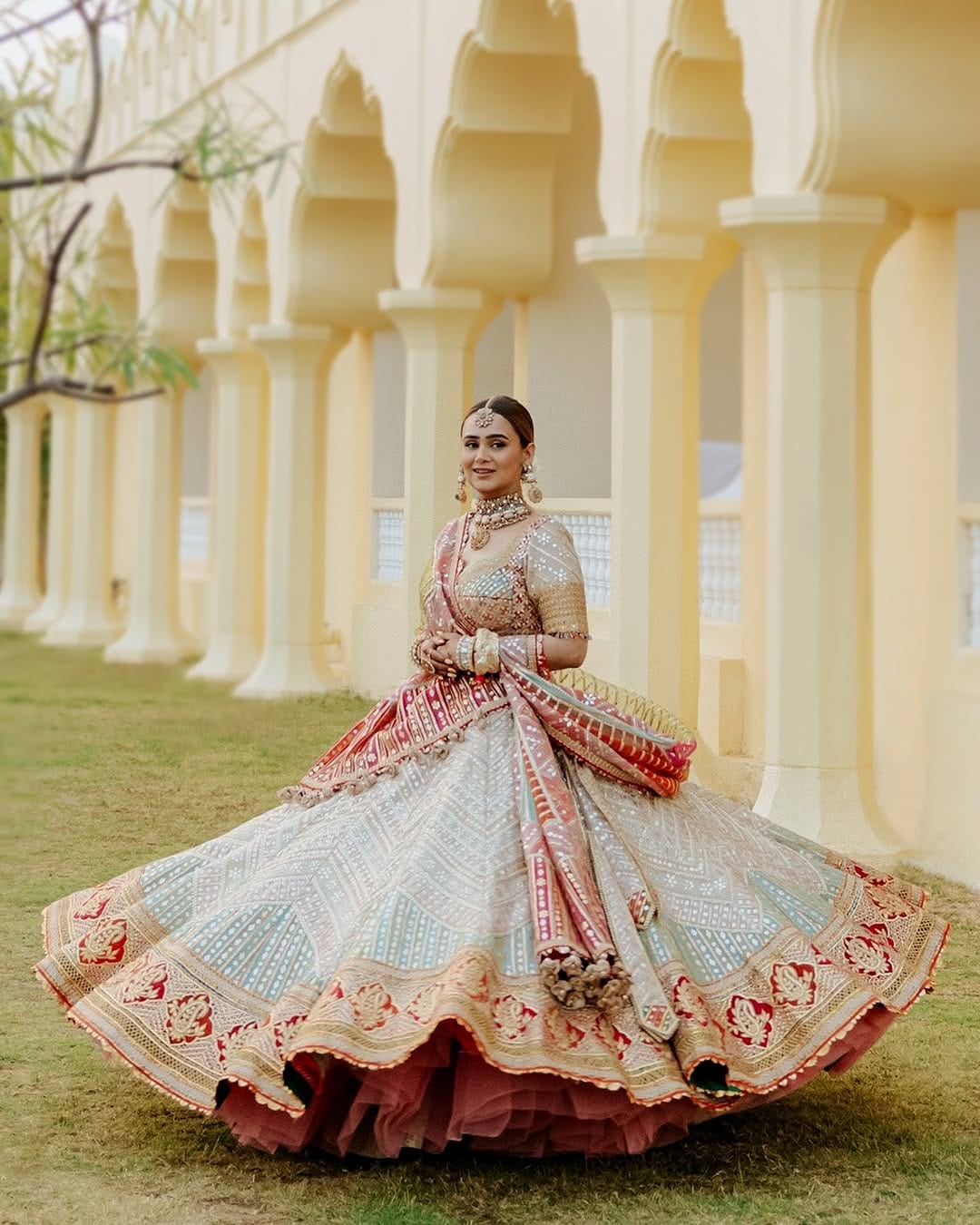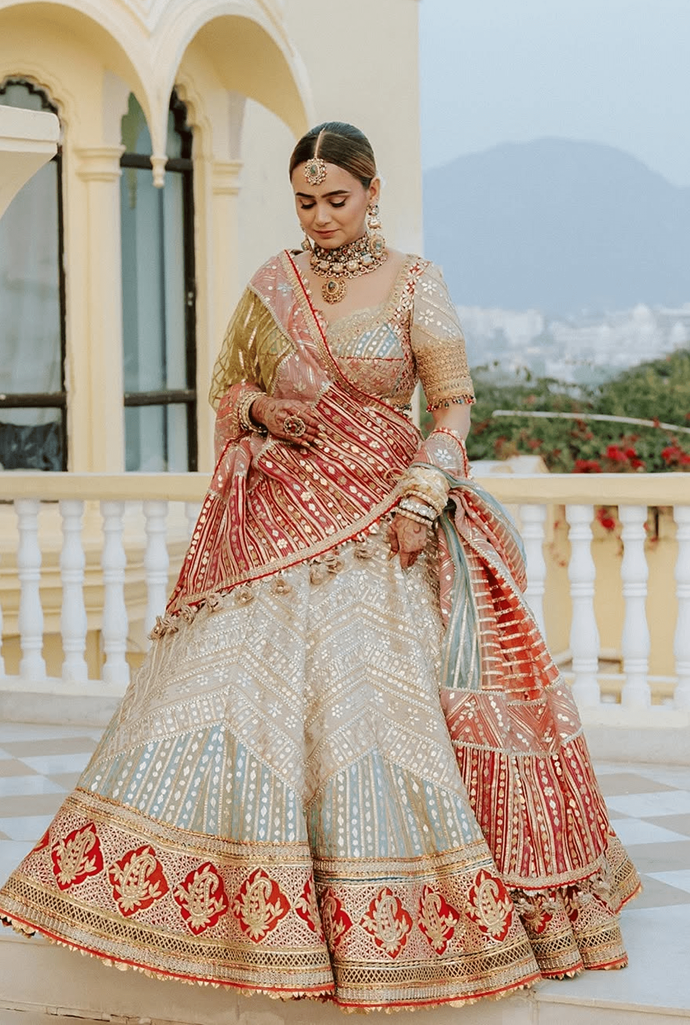 A multi-hued lehenga. The skirt featured sucha gota textures which were layered with gota-patti, kasab-dori marodi ka kaam and resham zardozi while the intricate illusion tie choli was crafted with a multitude of meticulously patched fabric tukdis (panels) and jaali ka kaam. It was paired with an embroidered dupatta.