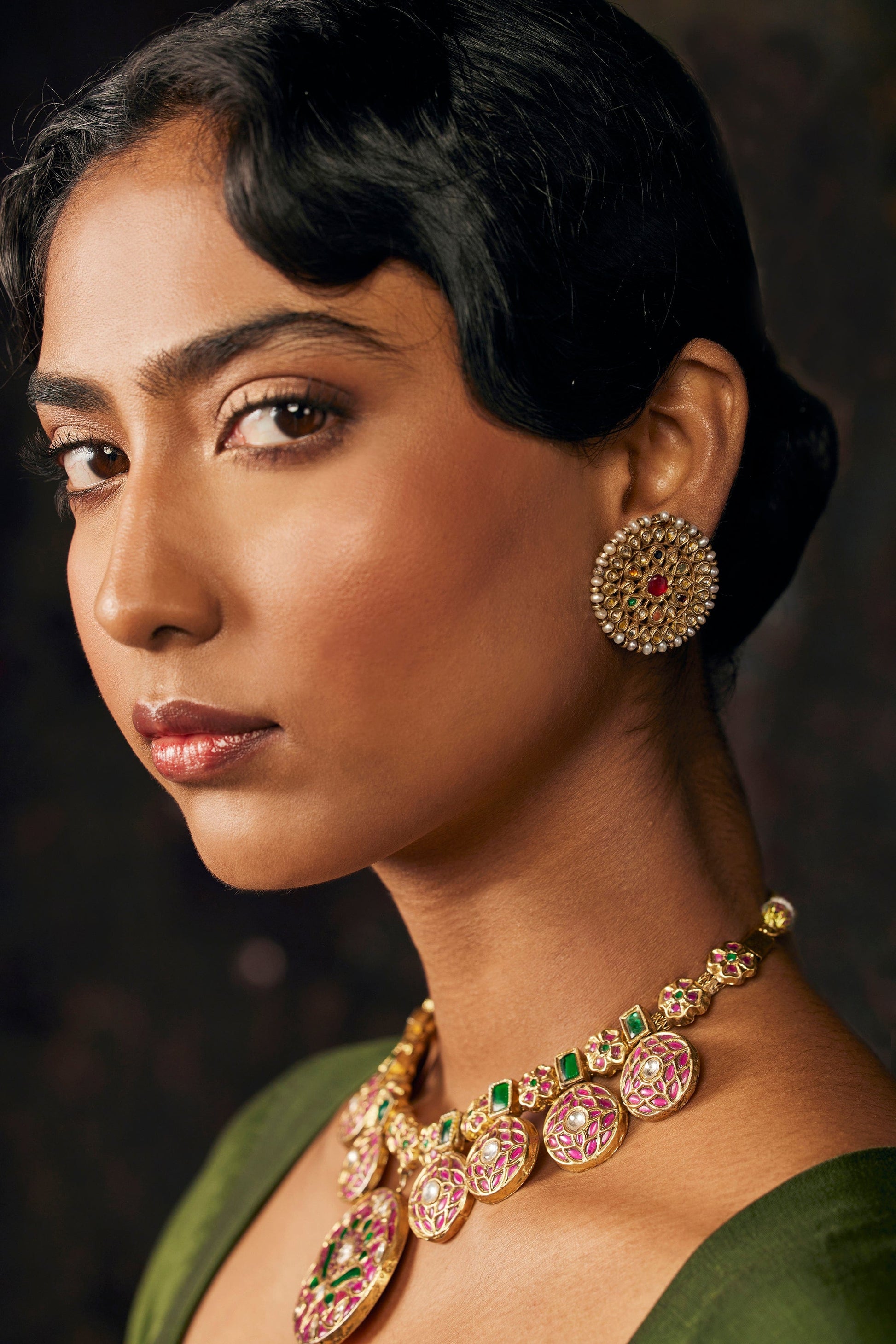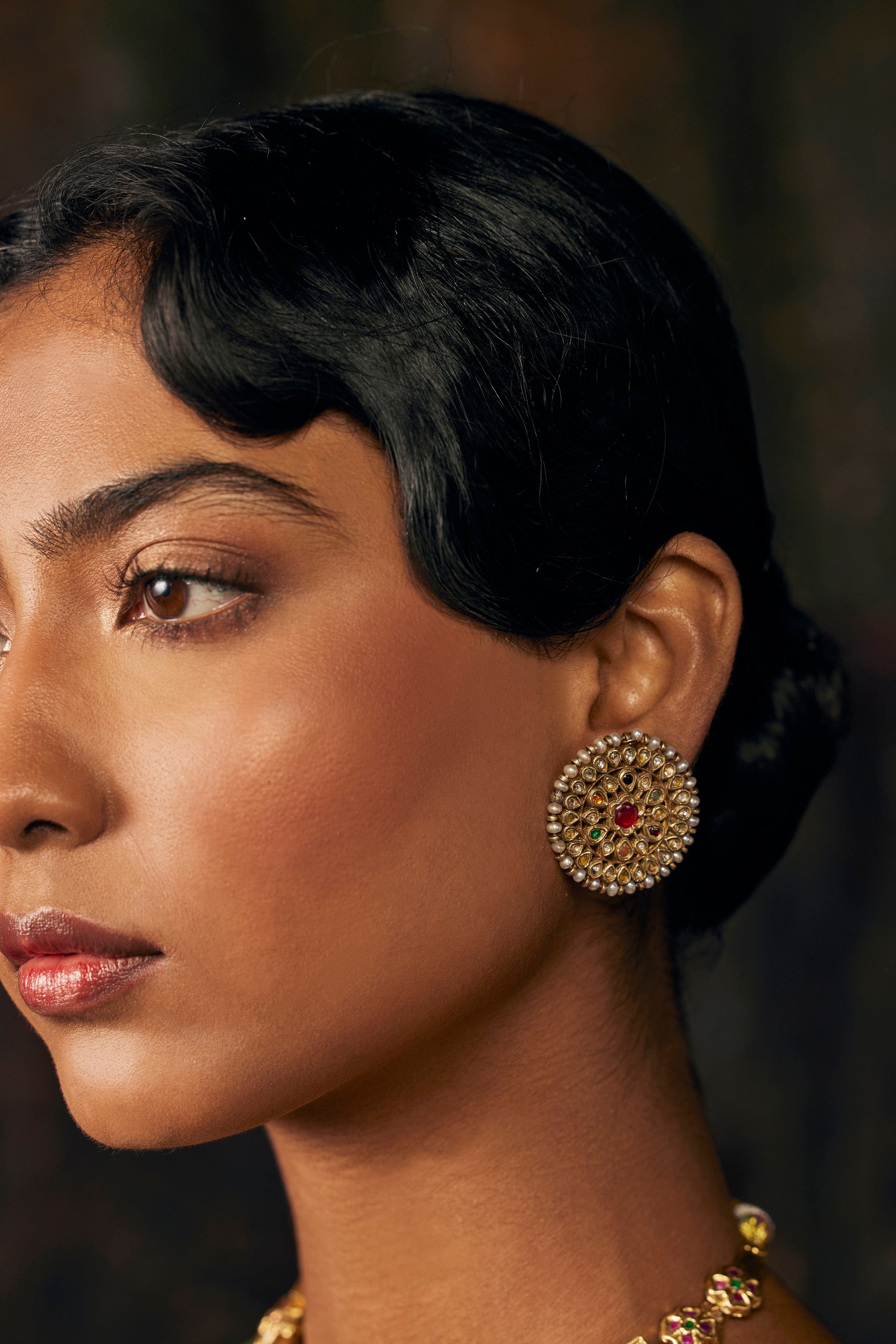 Naurattan jadau tops in gold infused 92.5 silver with polki. Comes with a clip at back for extra support and push screw.