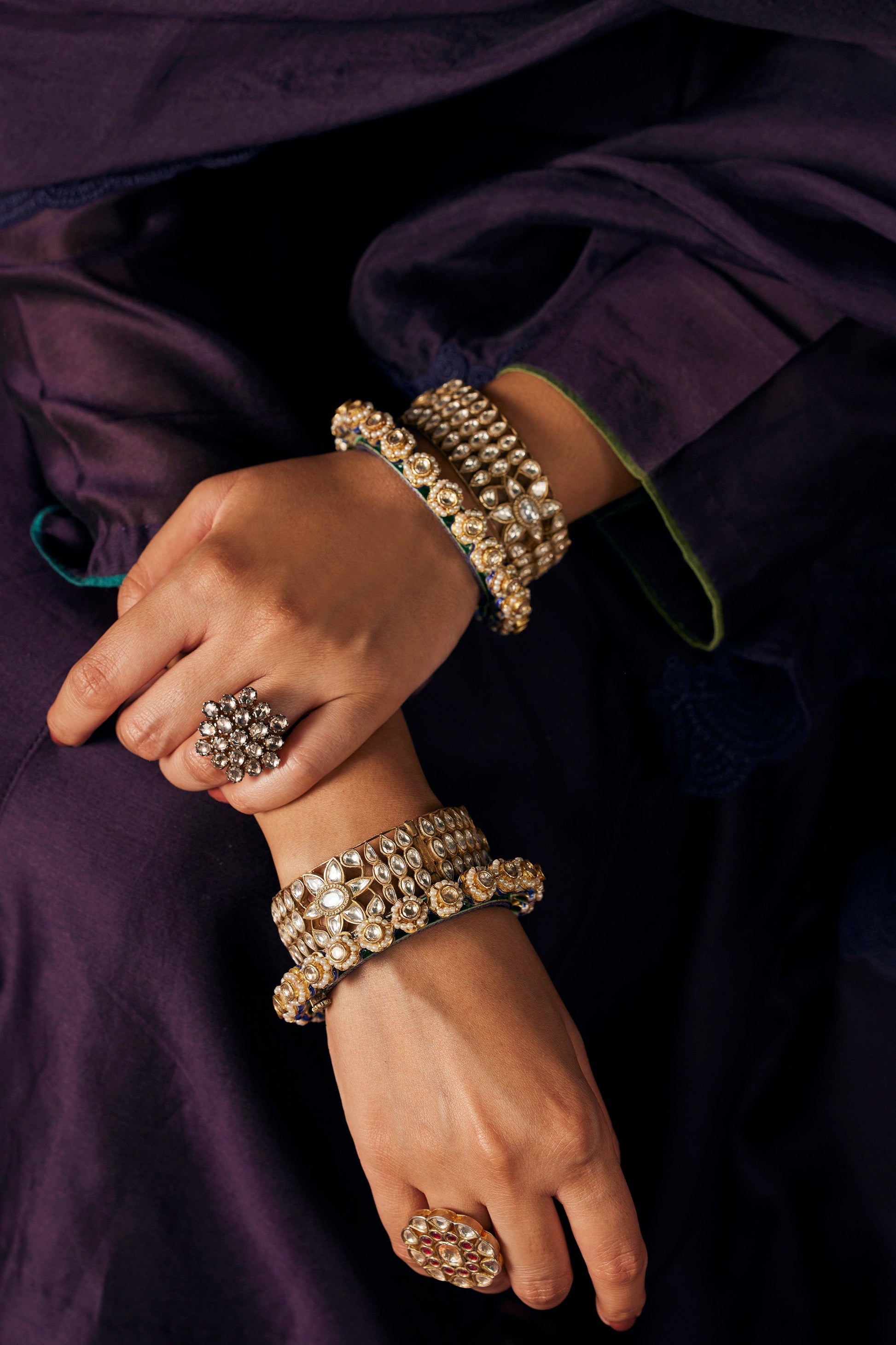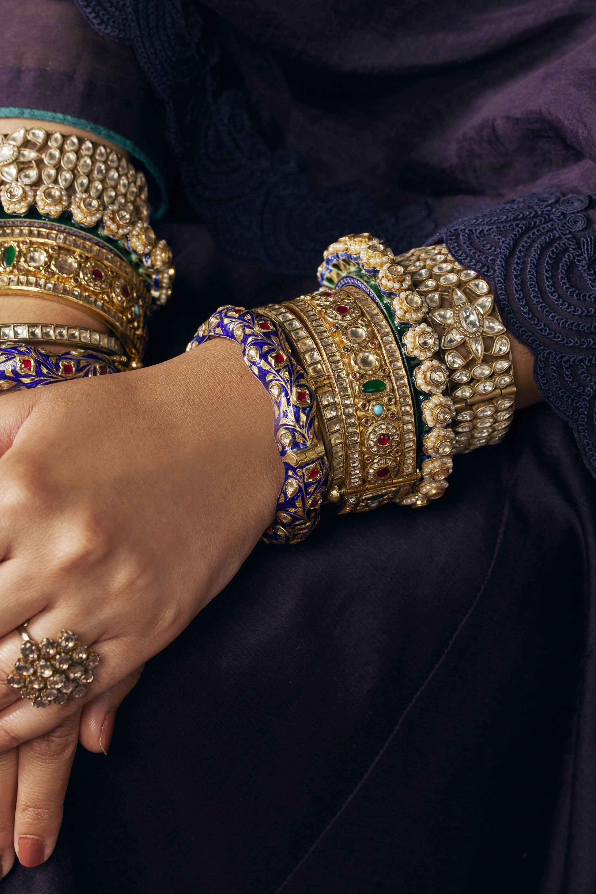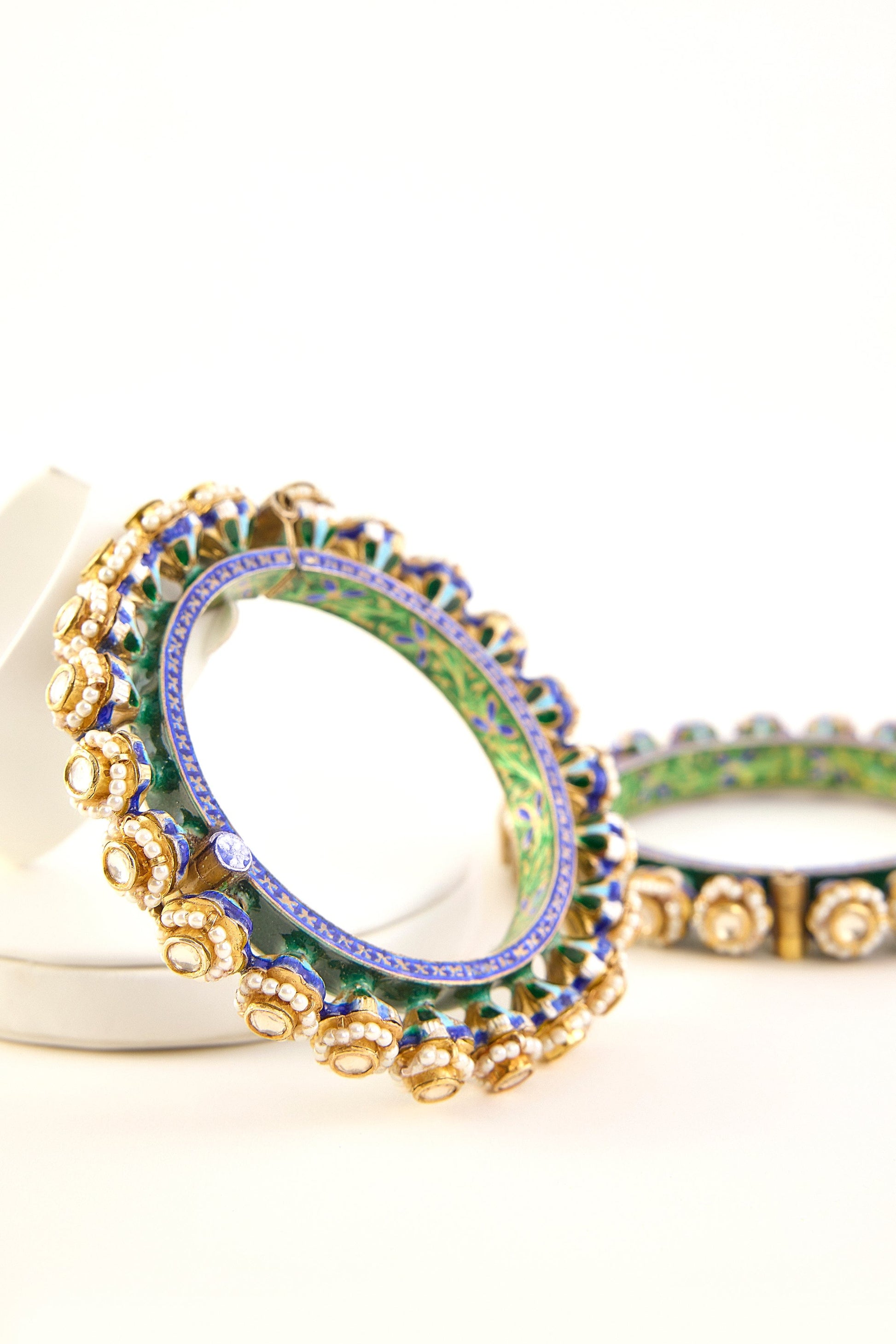 Polki and meenakari kada in gold infused 92.5 silver with a lock and opening for easy wear.