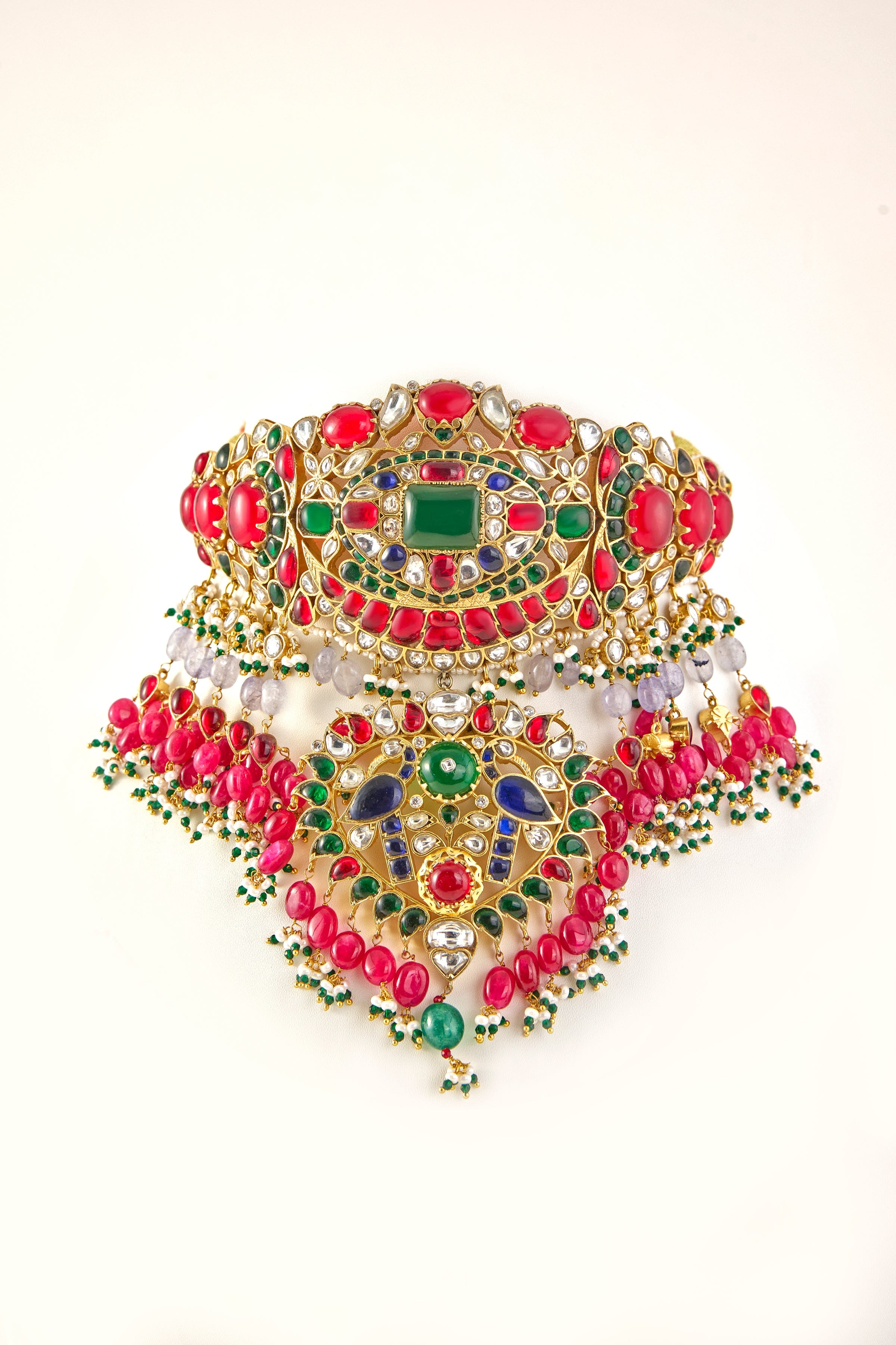 Jadau bridal choker in gold infused 92.5 silver with rubies, emeralds, polki, sapphires and stringing in tanzanite, emerald and moti. Comes with a traditional Indian dori closure.