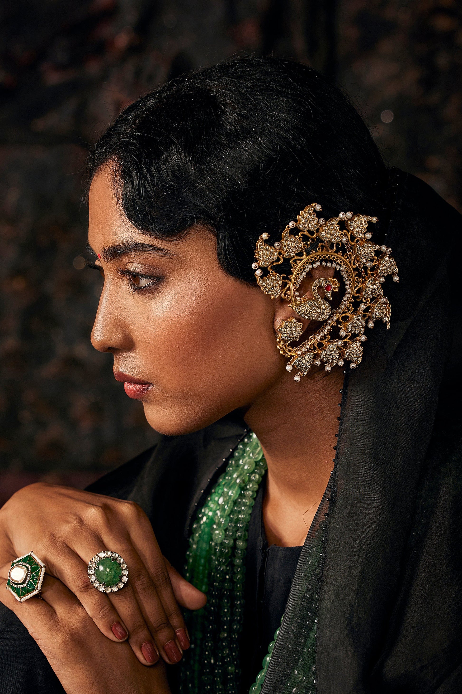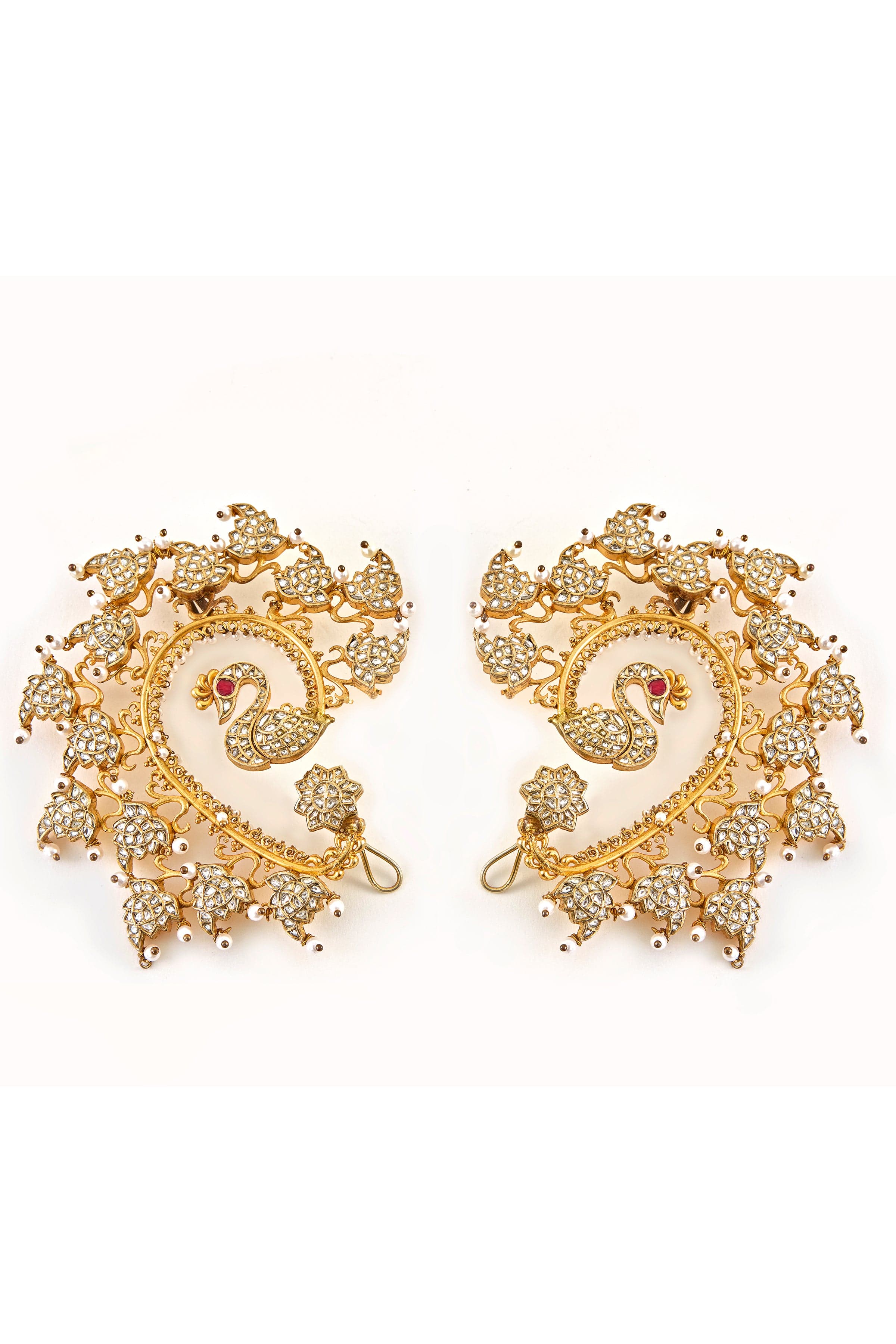 Mor Kaan phool statement earrings in gold infused 92.5 silver with polki, rubies and moti. Comes with a clip and ear chain at back for extra support and push screws.